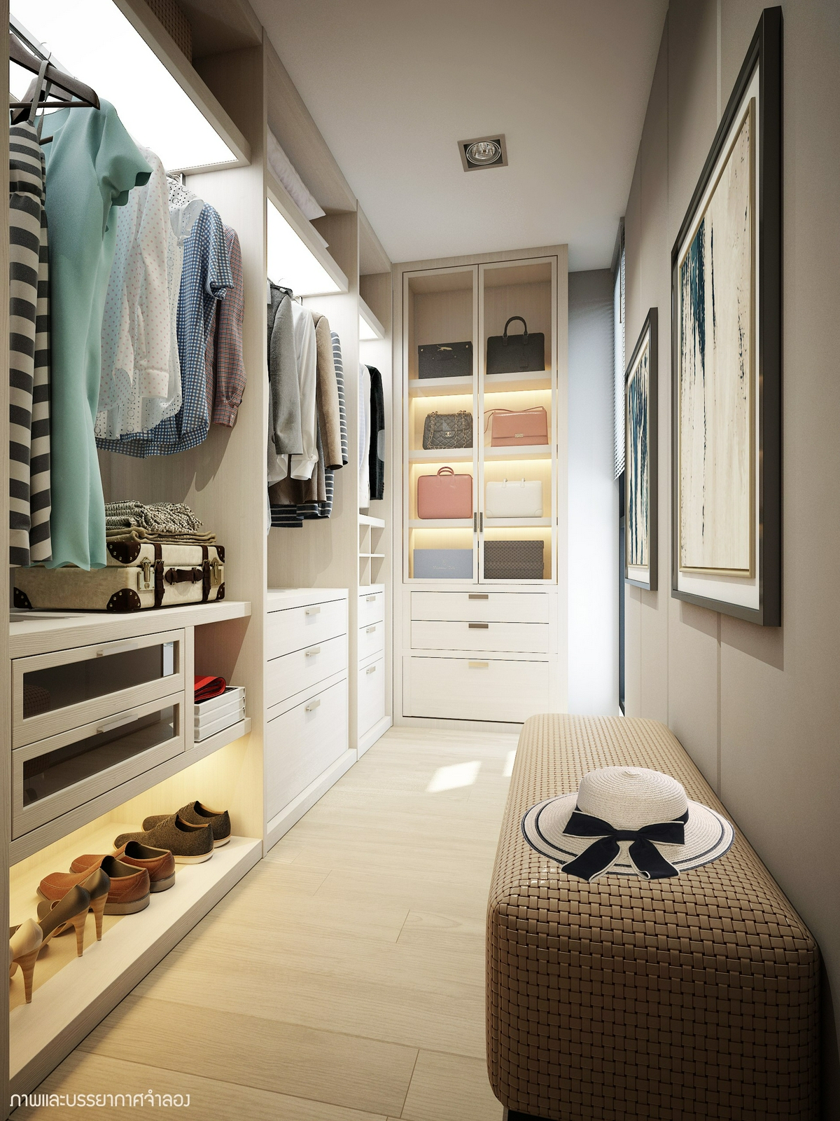 - ตู้เสื้อผ้าบานสไลด์ที่มีหน้าบานสูงชนติดเพดาน เพื่อช่วยป้องกันฝุ่นและเพิ่มพื้นที่ใช้สอย มาพร้อมฟังก์ชันเก็บของครบครัน อย่าง ลิ้นชักที่สามารถล็อกกุญแจเก็บของได้, ช่องด้านบนที่สามารถเก็บกระเป๋าเดินทางขนาด 20-22 นิ้วได้ และยังมีส่วนให้คุณผู้หญิงแขวนชุดเดรสตัวยาวได้ด้วยเช่นกัน