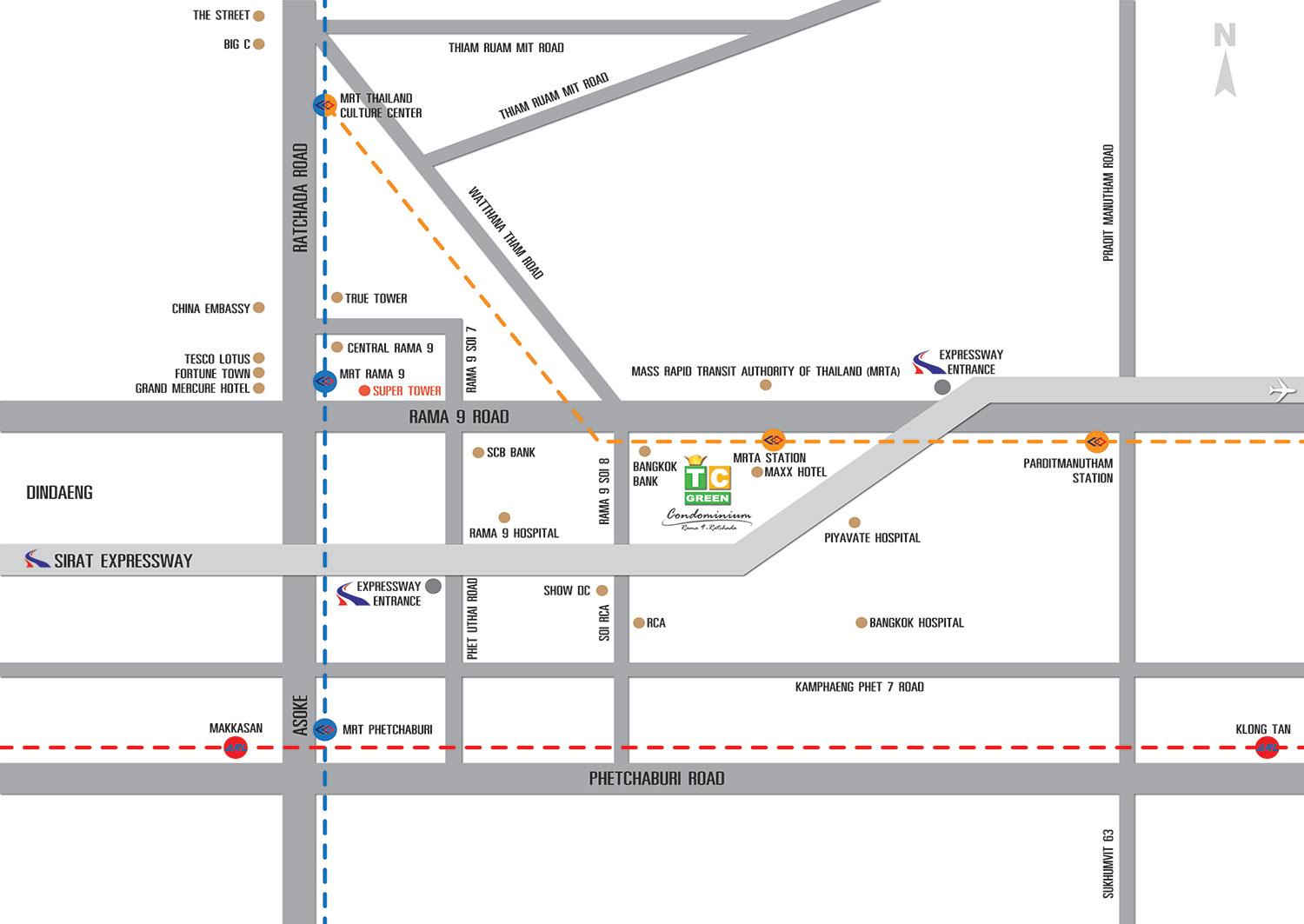 โครงการ TC Green Rama 9 (ทีซี กรีน พระราม 9) ตั้งอยู่ในพื้นที่เดินทางสะดวกไม่ว่าจะเป็นระบบรางหรือทางรถยนต์ รวมทั้งสามารถเข้าถึงแหล่งไลฟ์สไตล์ตั้งแต่เช้าจรดค่ำได้อย่างง่ายดาย