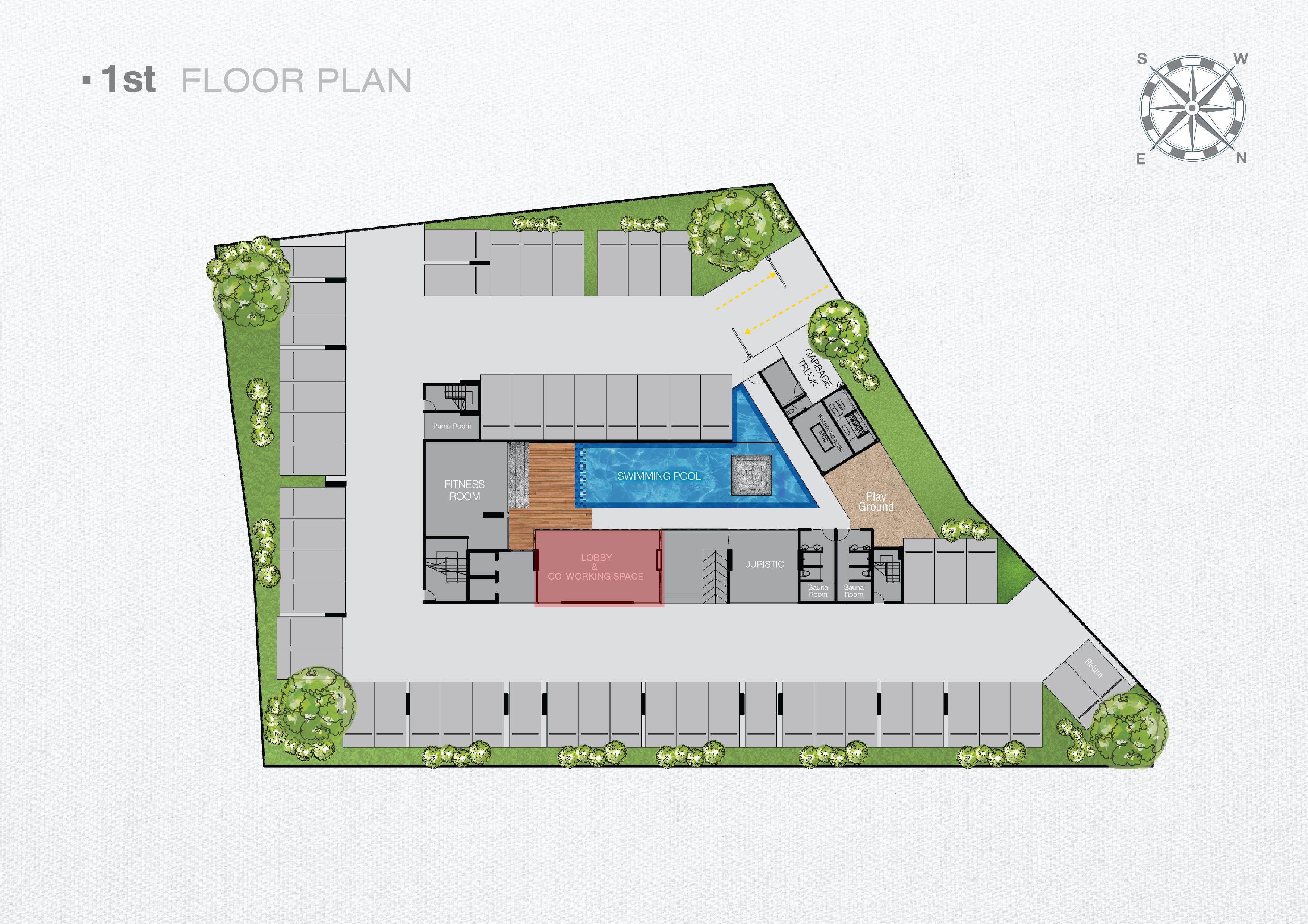 บริเวณชั้น 1 จะเป็นพื้นที่ของส่วนกลาง Facilities กับ ลานจอดรถที่อยู่รอบอาคาร โดยทางเข้าโครงการจะอยู่บน ซ.รามอินทรา 34 มีระบบ Keycard Access และระบบรักษาความปลอดภัยดูแลตลอด 24 ชั่วโมง ส่วนทัศนยีภาพภายในโครงการจะปลูกต้นไม้น้อยใหญ่ไว้ตามมุมต่างๆ เพื่อความร่มรื่น