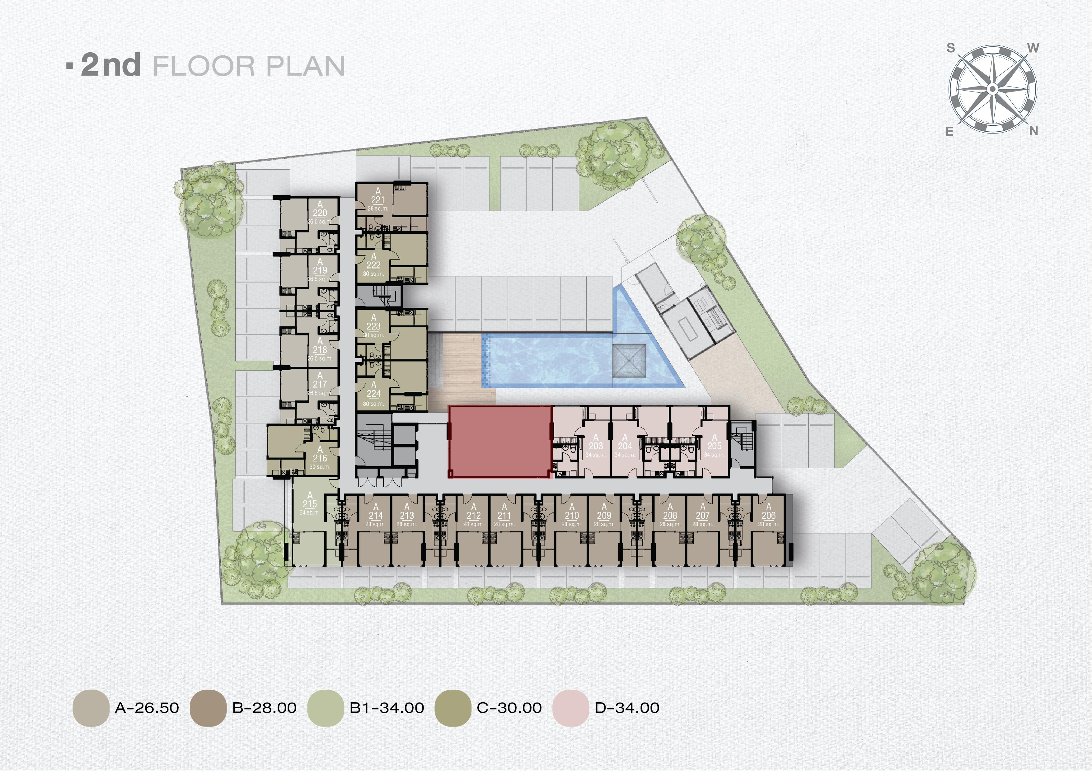 พอขึ้นมาชั้น 2 ถึงจะเป็นชั้นของห้องชุดพักอาศัยจำนวน 22 ยูนิต เนื่องจากโถงล็อบบี้ออกแบบให้ยกเพดานสูง Double Volume จึงกินพื้นที่ของชั้น 2 บางส่วน (ตรงกรอบสีแดง)