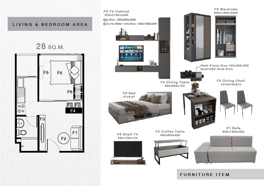 - ห้องแบบ 1 ห้องนอน Type B ขนาด 28 ตารางเมตร จำนวน 70 ยูนิต