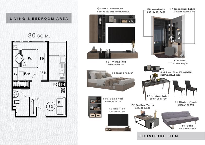 - ห้องแบบ 1 ห้องนอน Type C ขนาด 30 ตารางเมตร จำนวน 40 ยูนิต