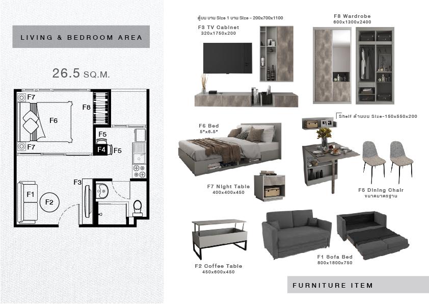 - ห้องแบบ 1 ห้องนอน Type A ขนาด 26.5 ตารางเมตร จำนวน 28 ยูนิต