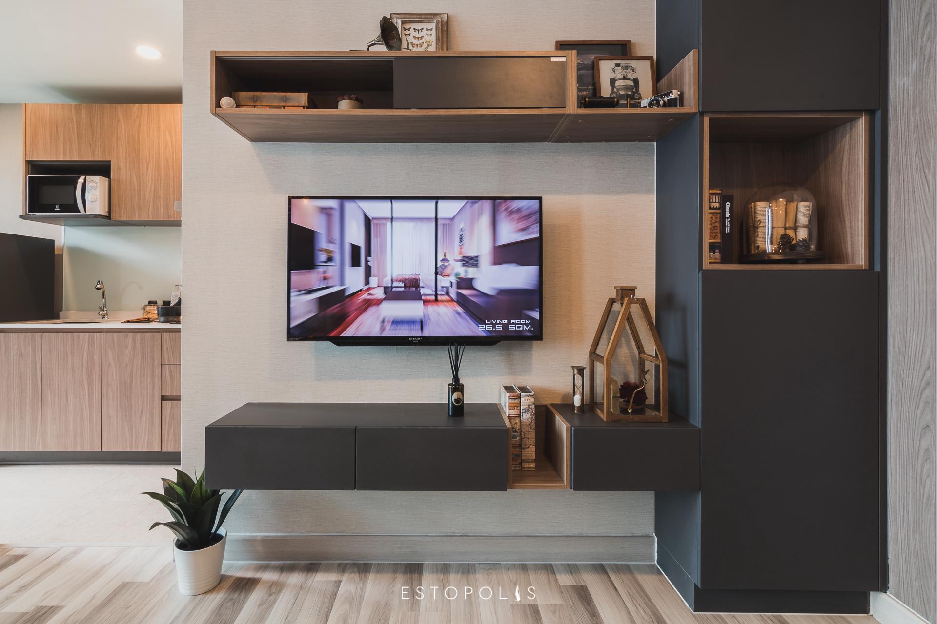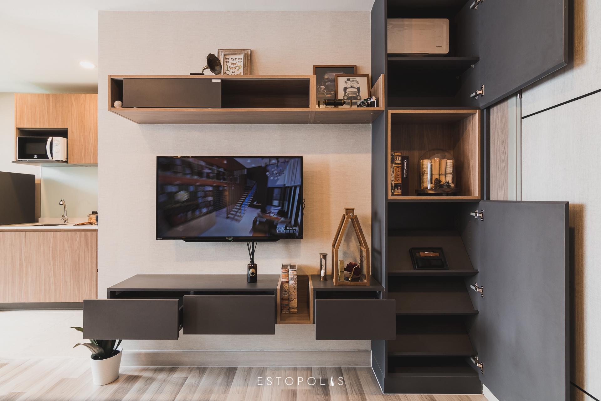 ตรงกลางเว้นว่างไว้ให้ติดตั้งทีวีแบบแขวน ช่วยประหยัดพื้นที่ใช้สอย ในขณะเดียวกันก็ให้ความสวยงามและความเป็นระเบียบมากขึ้น