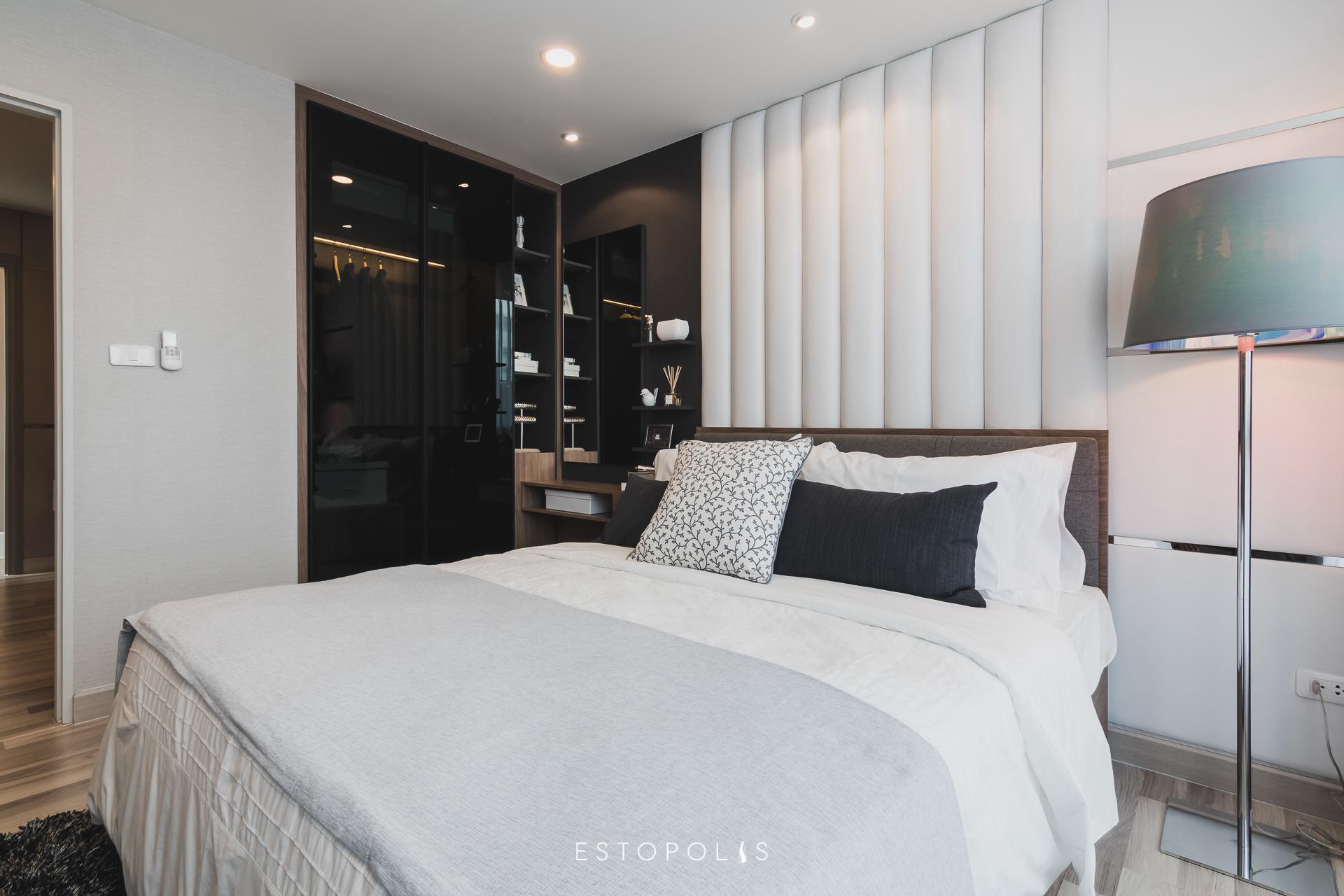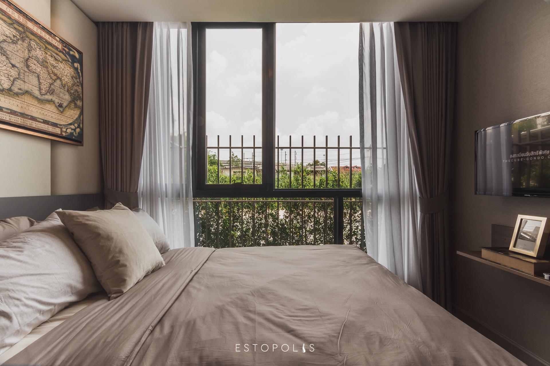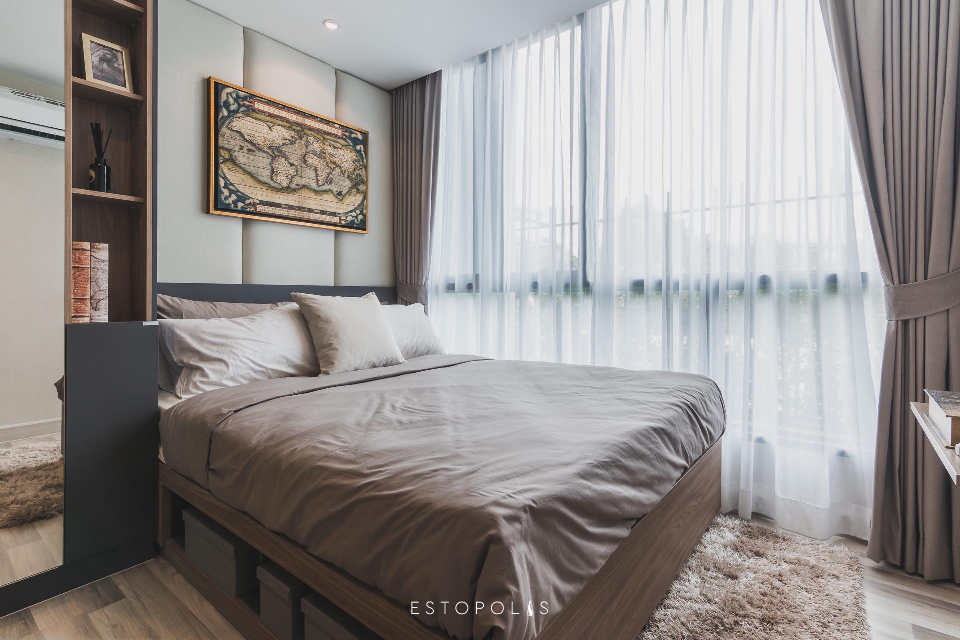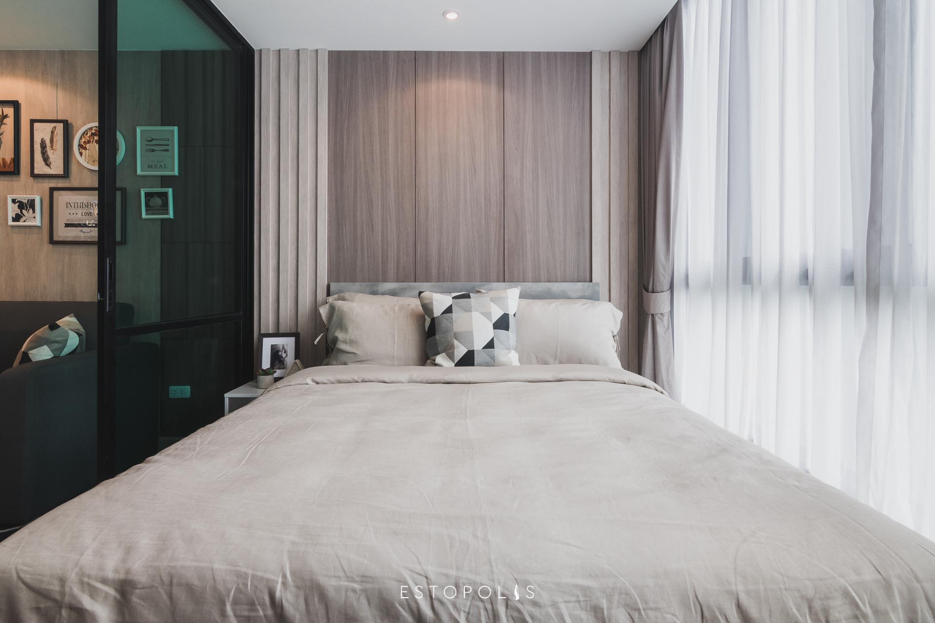 ภายในห้องวางเตียงควีนไซส์ไว้ชิดหน้าต่าง เพื่อให้เหลือพื้นที่แต่งตัวได้สะดวกกว่า 1.3 เมตร