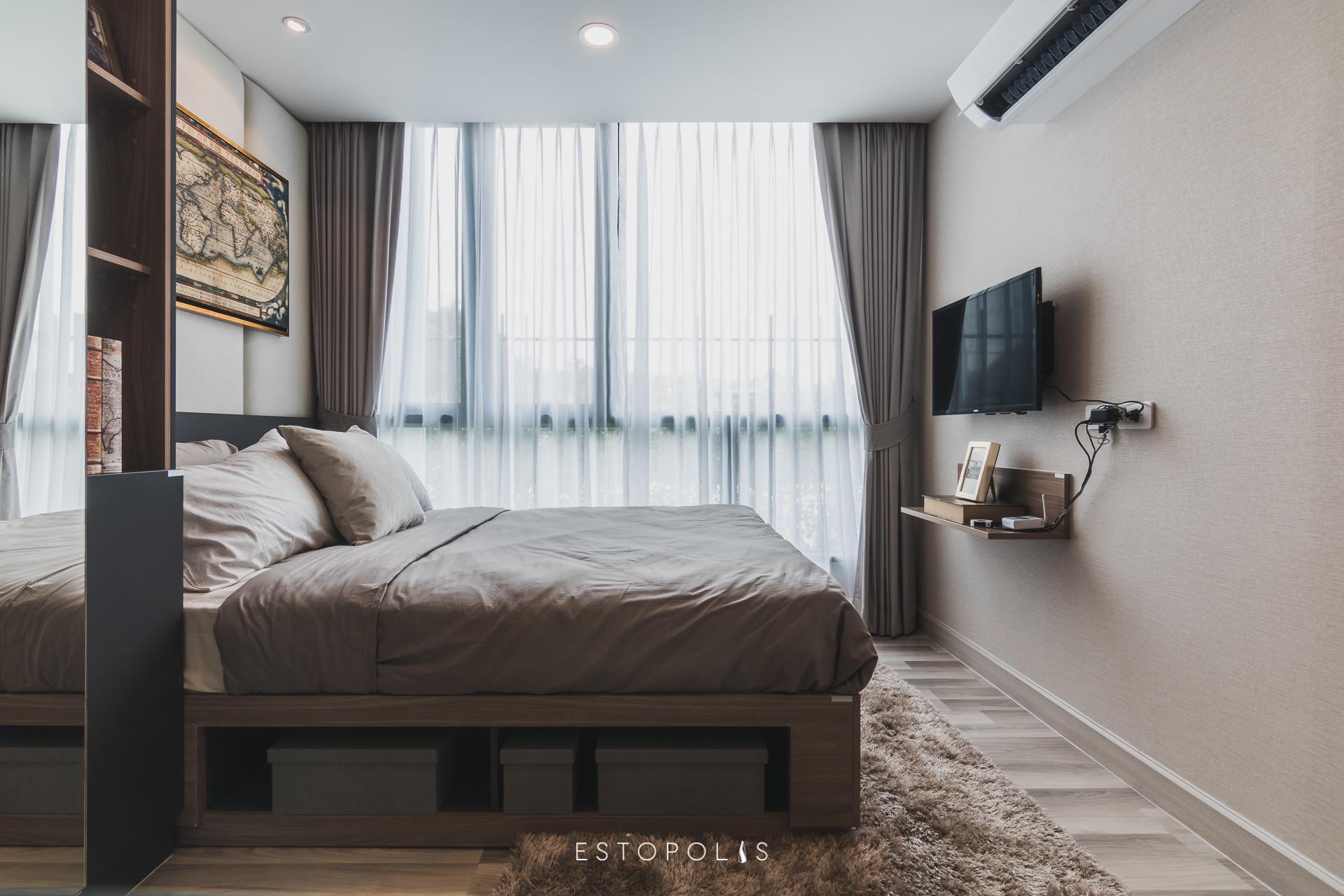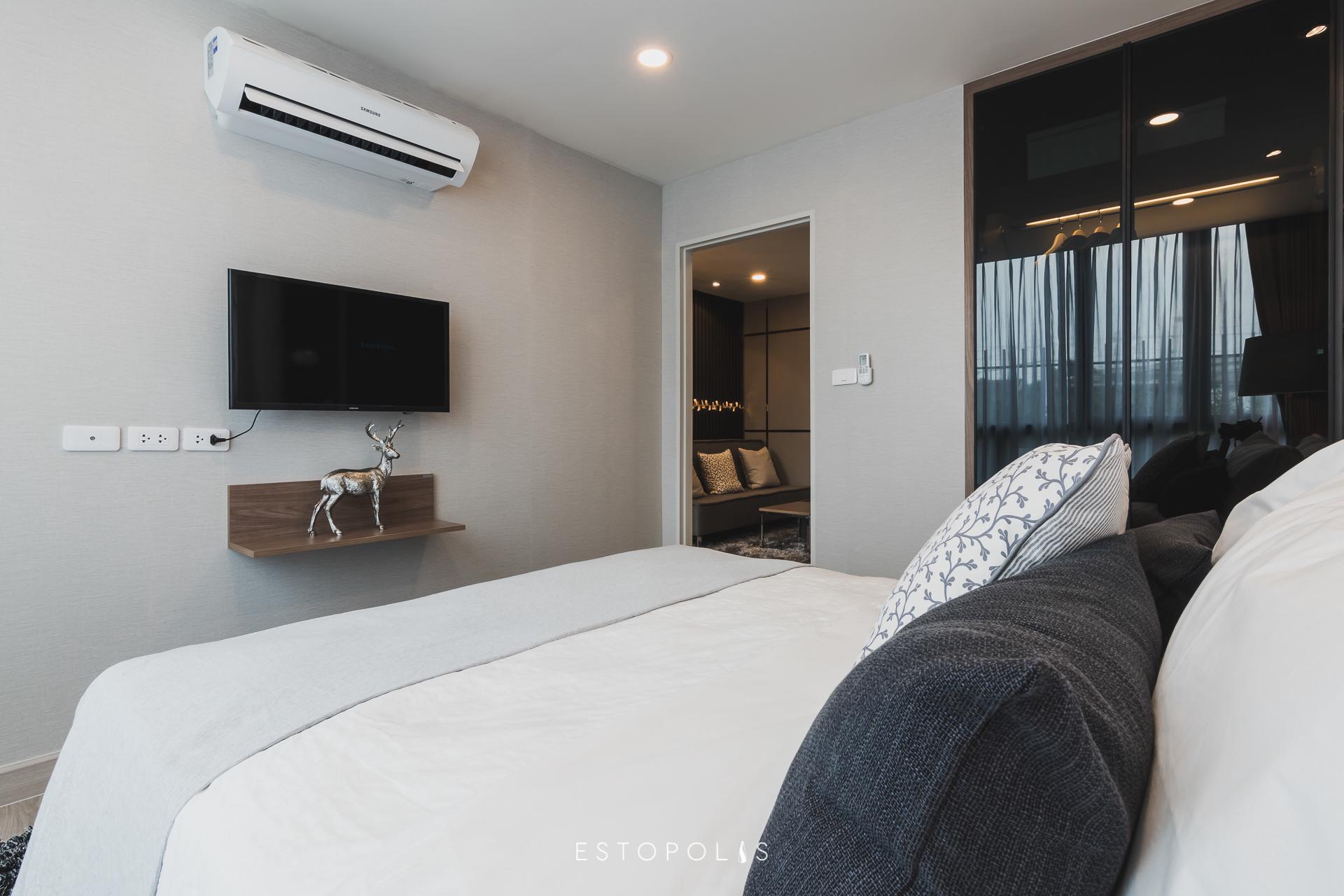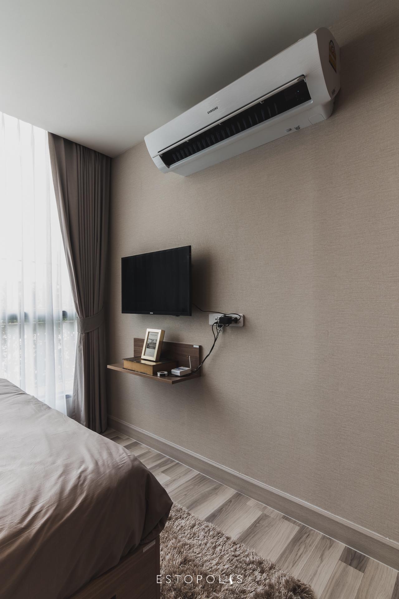 ปลายเตียงสามารถติดทีวีแบบแขวนได้สบายๆ หรือหากใครอยากได้พื้นที่ใช้สอยเพิ่มเติม ก็สามารถบิลท์อินชั้นลอยหรือตู้เก็บของได้