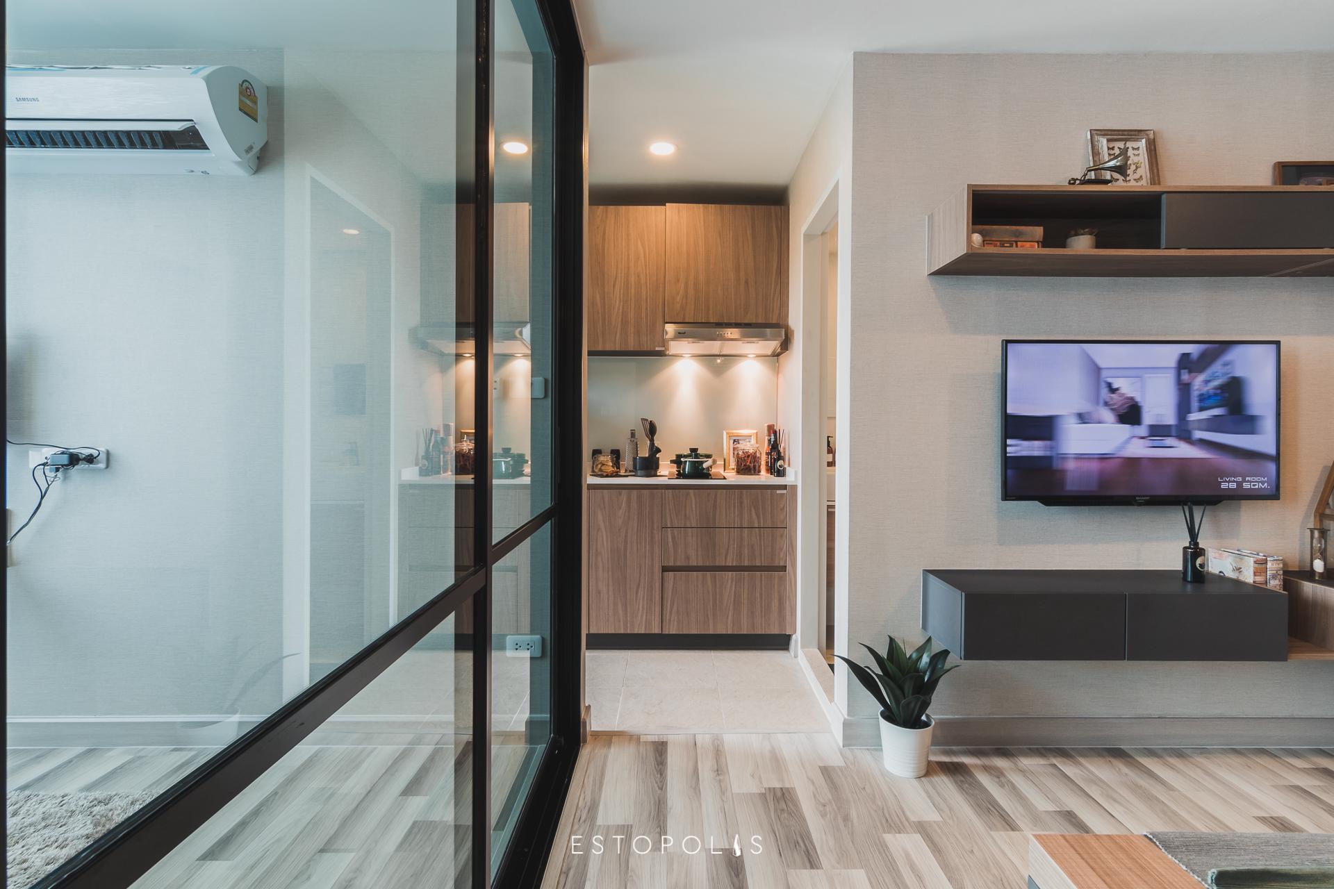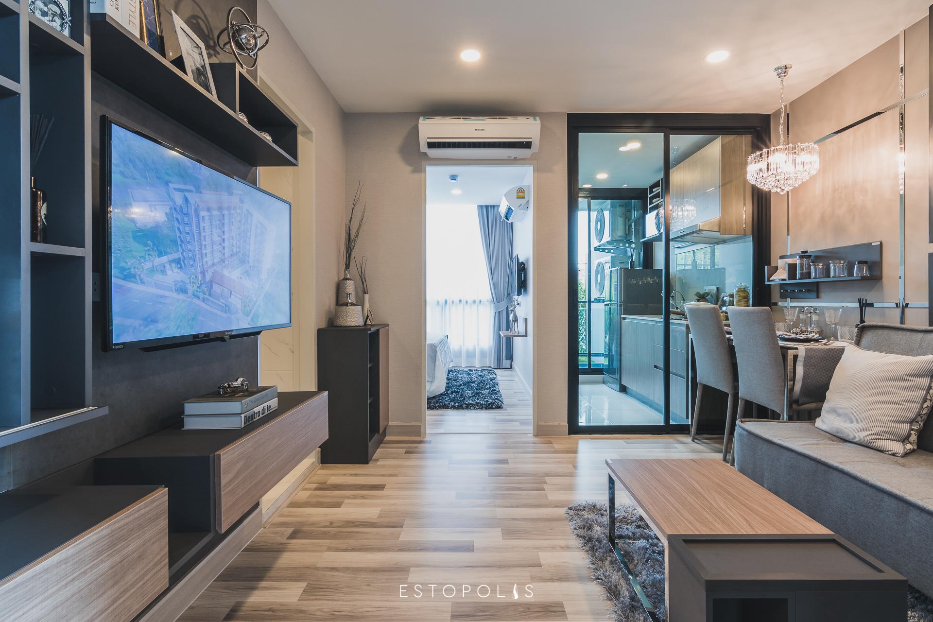 เปิดประตูเข้ามาเจอ ห้องนั่งเล่น เชื่อมกับ ห้องนอน พร้อมมุมรับประทานอาหารในตัว ส่วนฝั่ังซ้ายเป็น ห้องครัวแบบเปิด ที่สามารถเดินเข้าจากทางห้องนั่งเล่นได้ ซึ่งจะเชื่อมกับห้องน้ำและระเบียงออกไปด้านนอกอาคาร