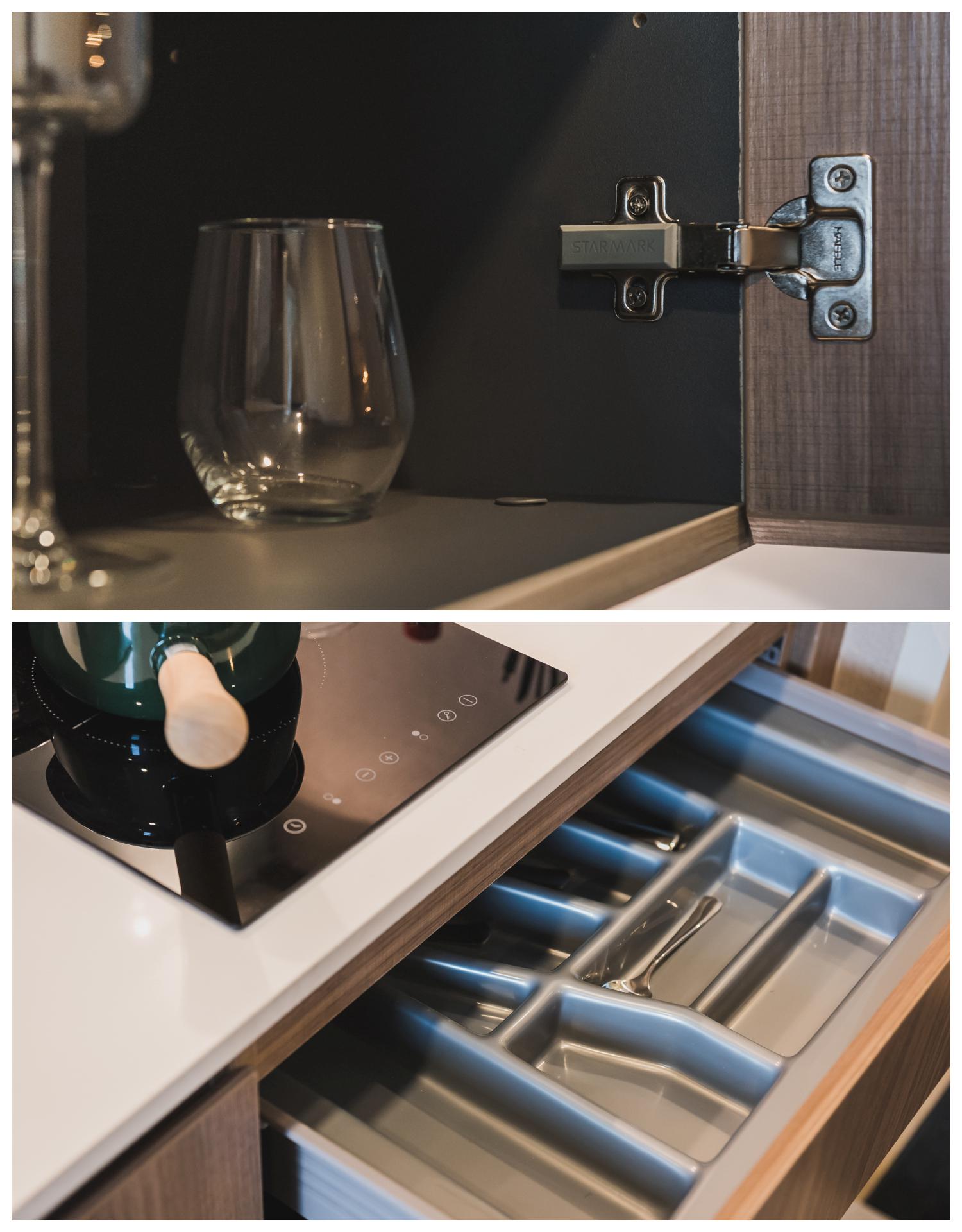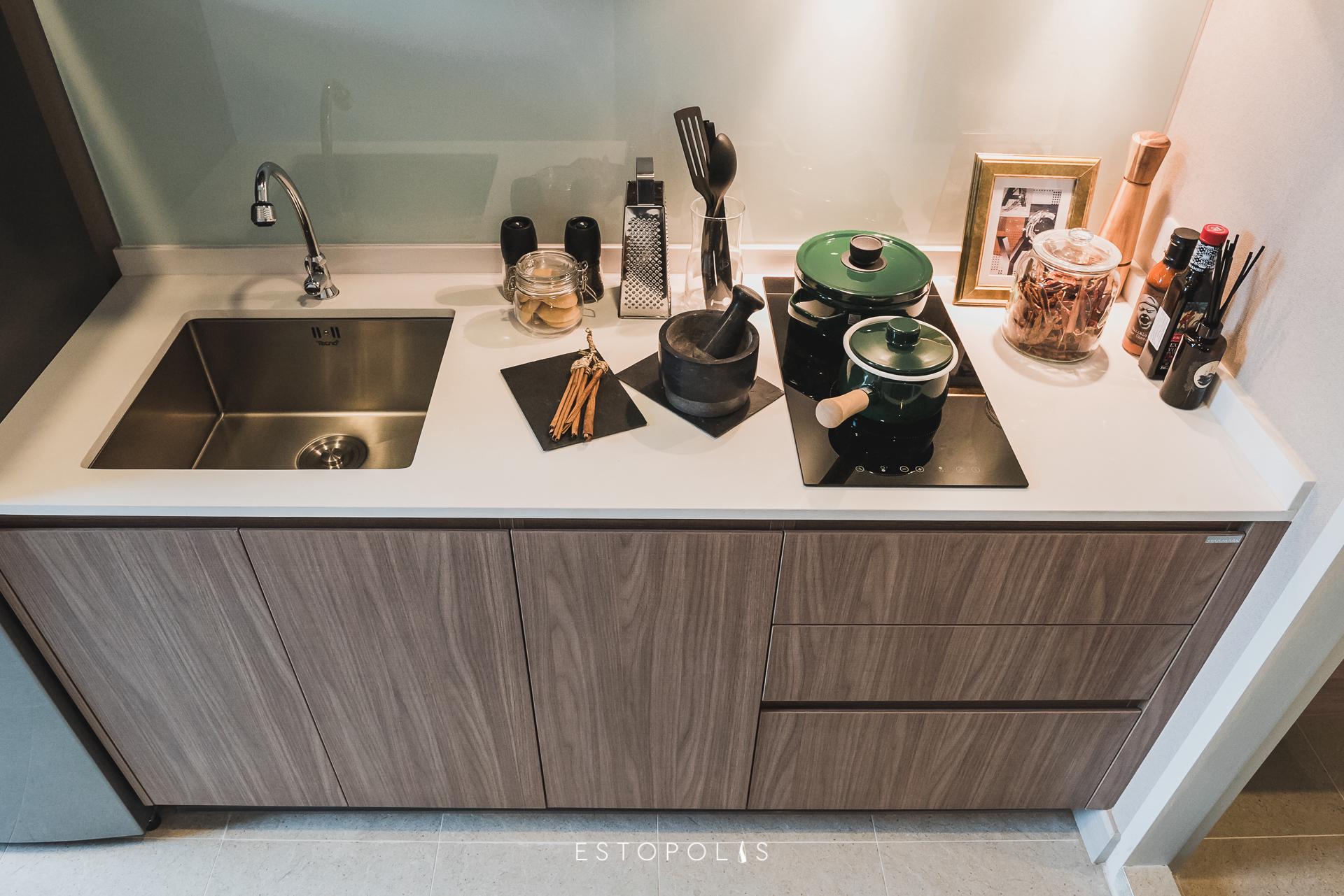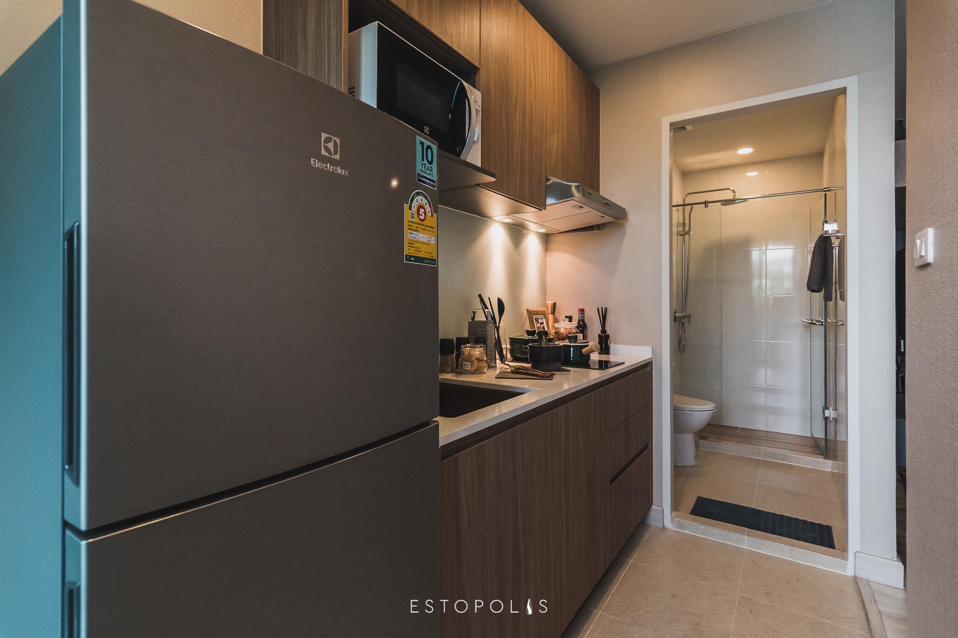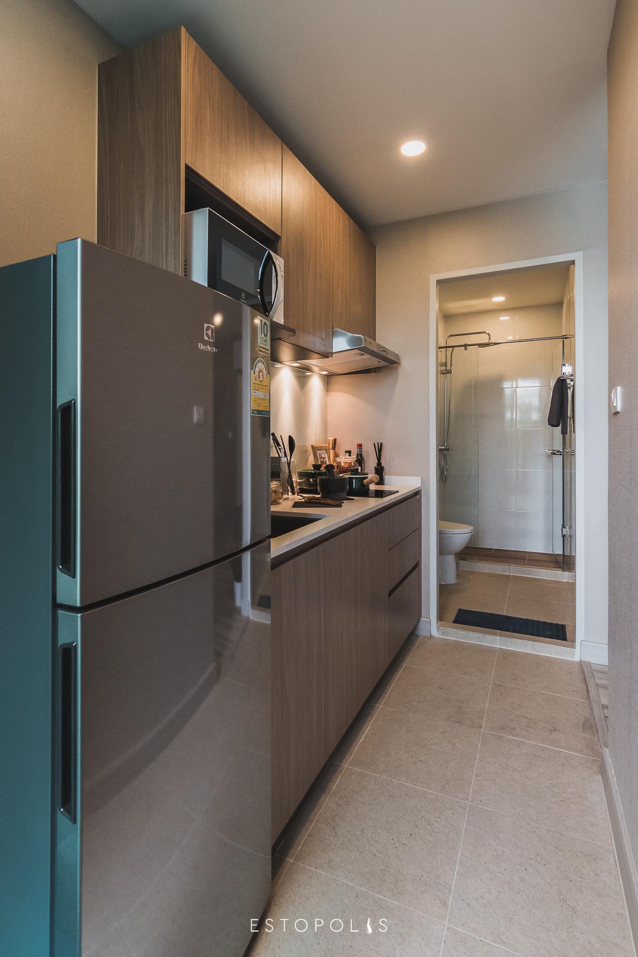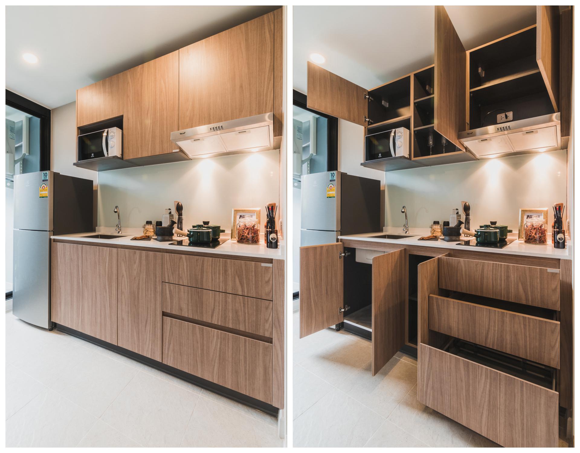 ด้านชุดครัวจะบิลท์อินให้ติดผนัง เพื่อประหยัดพื้นที่ใช้สอยในห้อง ส่วนด้านบนและล่างก็จะบิลท์อินเคาน์เตอร์ครัวกับตู้แขวนบานเปิด-ปิด Soft Close ให้เช่นกัน สามารถเก็บอุปกรณ์เครื่องครัวได้เยอะ ดูแล้วน่าจะเป็นที่ถูกอกถูกใจเหล่าพ่อบ้านแม่บ้านประจำคอนโด