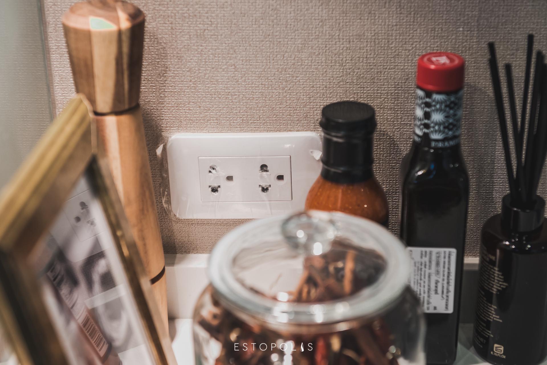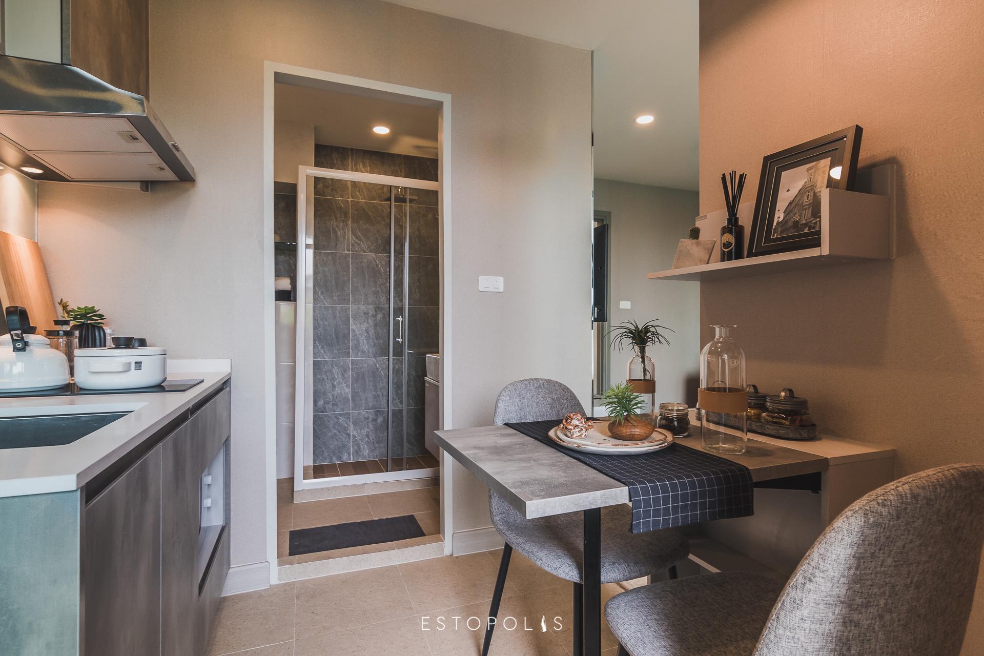 ข้างกัน เดอะคิวบ์ พรีเมียม รามอินทรา 34 จัดเป็นมุมรับประทานอาหารสำหรับ 1-2 คน ที่ตัวโต๊ะออกแบบให้วางของร่วมได้ ทั้งยังมีชั้นวางเครื่องปรุงบิลท์อิน (Built in) อยู่ด้านบน เพื่อความสะดวกสบายเวลาใช้งาน ซึ่งจุดนี้เราสามารถเคลื่อนย้ายตำแหน่ง ปรับวางที่นั่งเองได้ด้วย