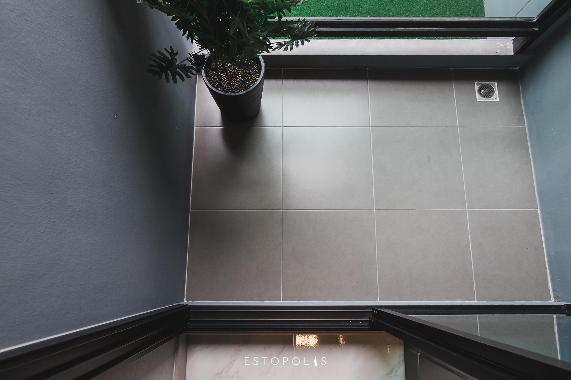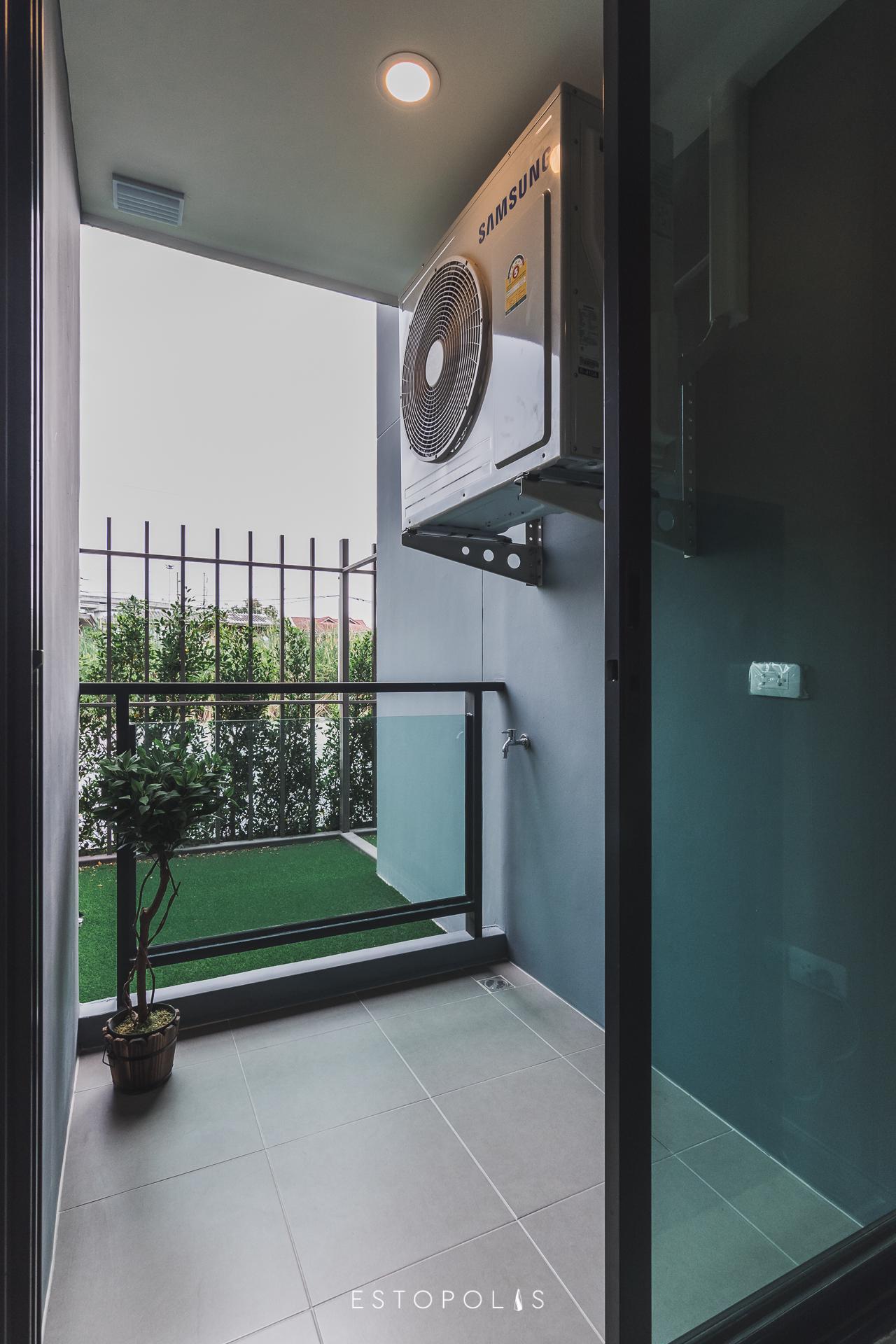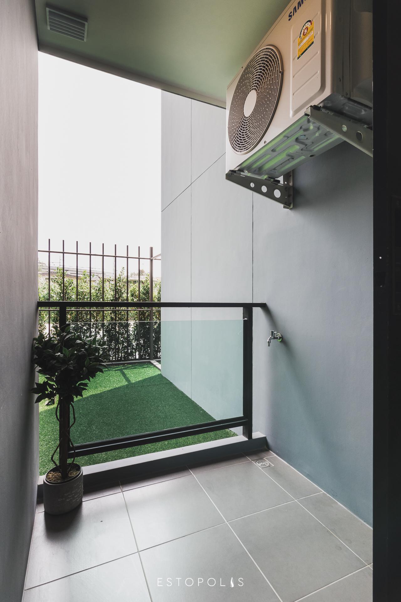 ระเบียงมีหน้าตาไม่ต่างจากห้อง Type B ซึ่งเป็นจุดเด่นหนึ่งของโครงการที่ให้ระเบียงขนาดกว้าง ทำให้ผู้พักอาศัยสามารถใช้งานได้จริง มีราวกันตกติดกระจกนิรภัยสูง 1 เมตร