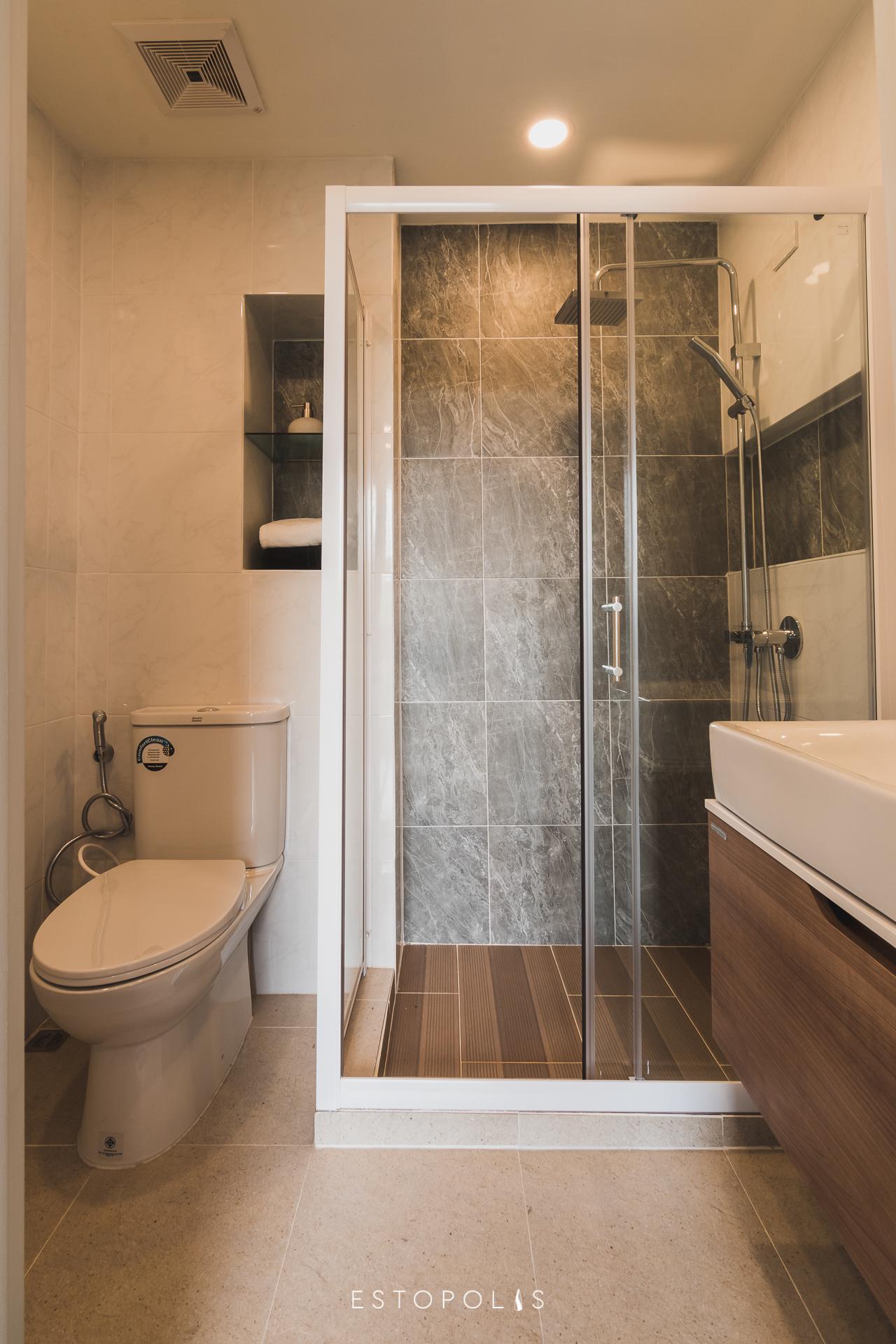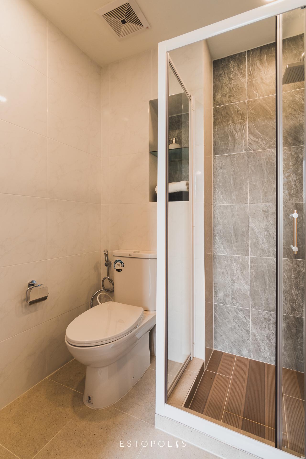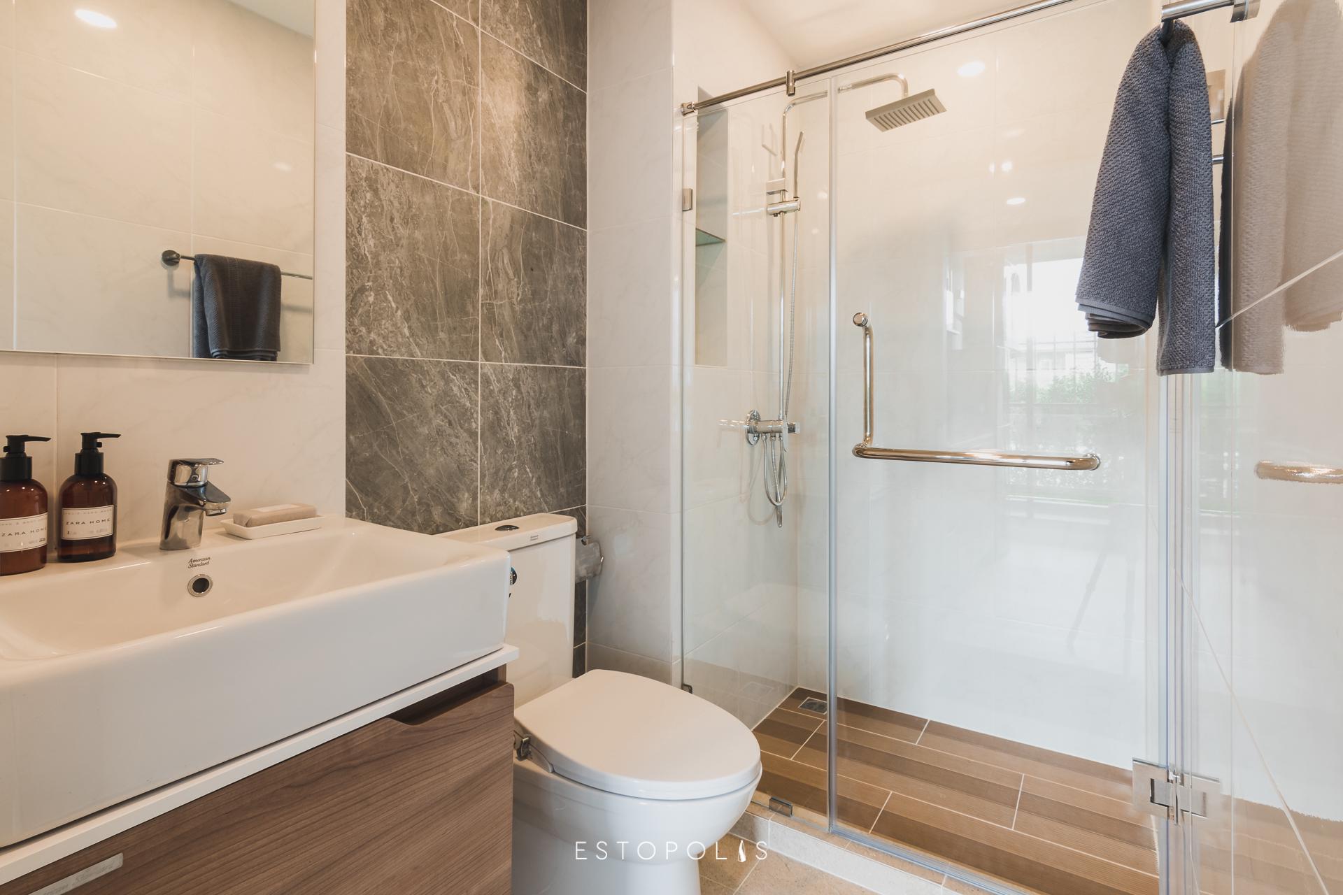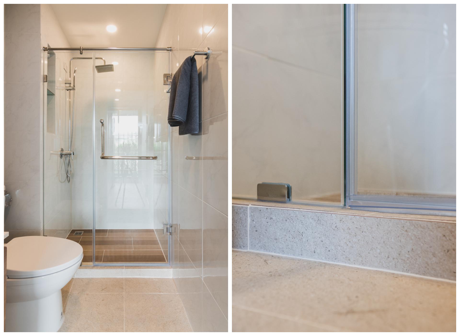 ตู้อาบน้ำขนาดกว้างพอดีตัว ภายในติดตั้งชุดฝักบัวแบบ Rain Shower กับฝักบัวสายอ่อนมาให้เหมือนกันทั้งโครงการ แต่จะมี Drop Wall เพิ่มเข้ามาด้วย ทำให้วางของได้เยอะขึน ส่วนฉากกั้นอาบน้ำใช้เป็นแบบบานเลื่อนกระจกนิรภัยแทน เพื่อประหยัดพื้นที่ใช้สอย