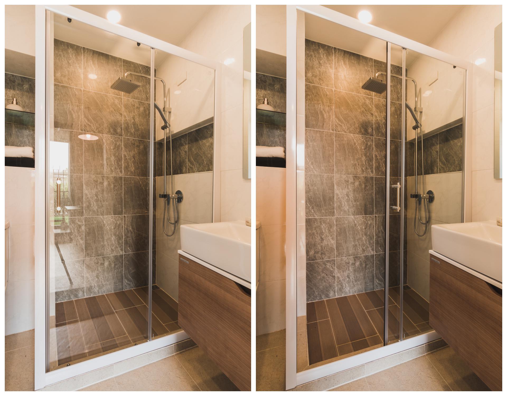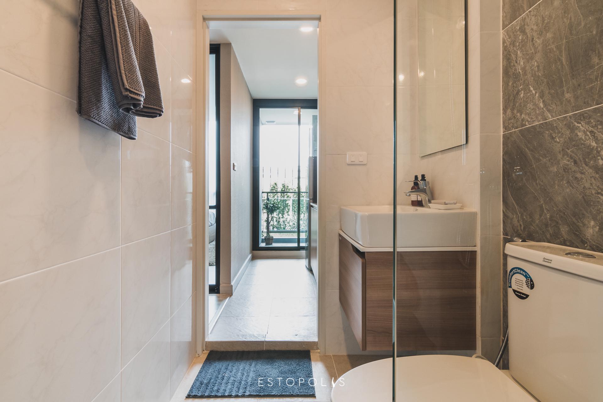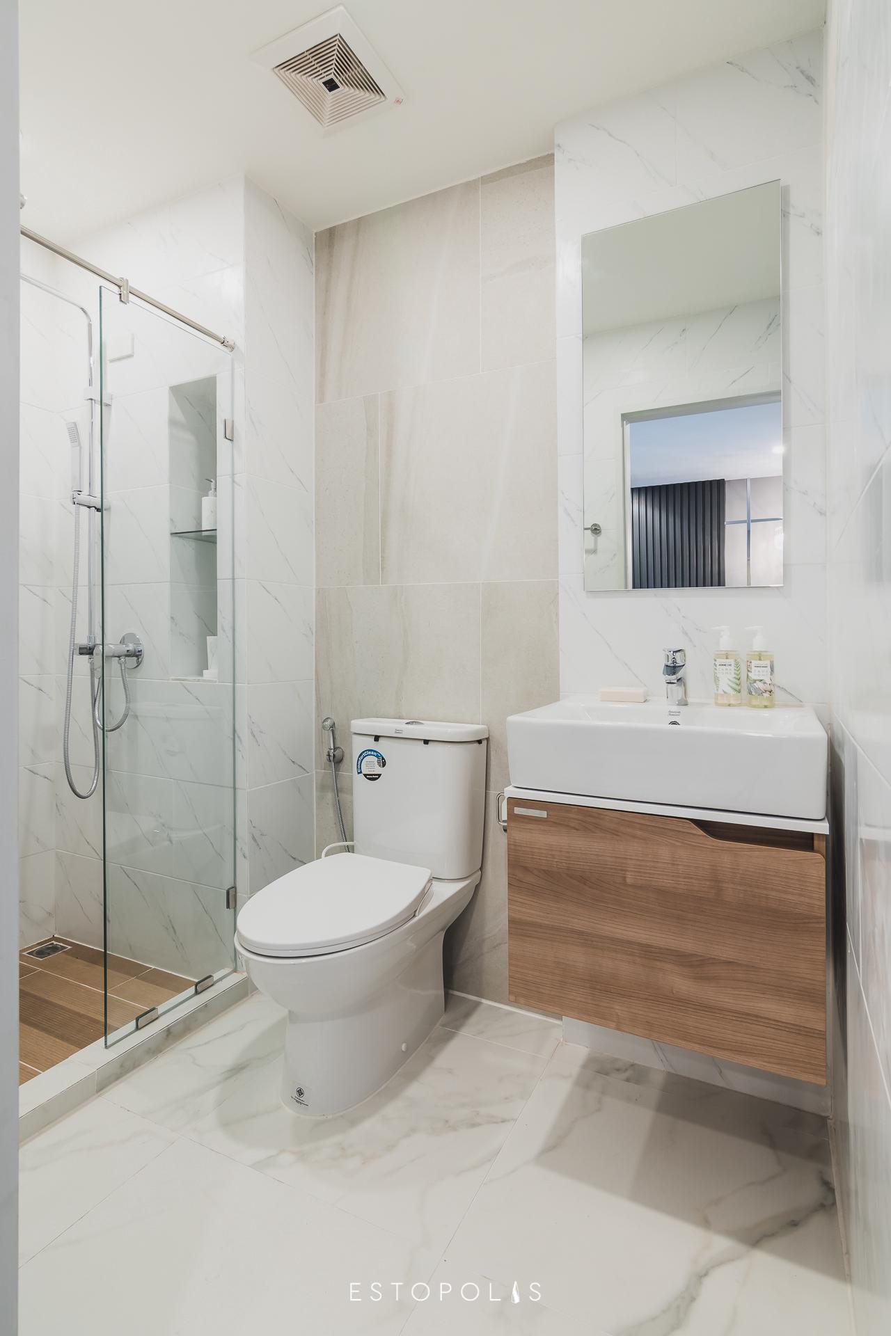 ตู้อาบน้ำขนาดกว้างพอดีตัว ภายในติดตั้งชุดฝักบัวแบบ Rain Shower กับฝักบัวสายอ่อนมาให้เหมือนกันทั้งโครงการ แต่จะมี Drop Wall เพิ่มเข้ามาด้วย ทำให้วางของได้เยอะขึน ส่วนฉากกั้นอาบน้ำใช้เป็นแบบบานเลื่อนกระจกนิรภัยแทน เพื่อประหยัดพื้นที่ใช้สอย