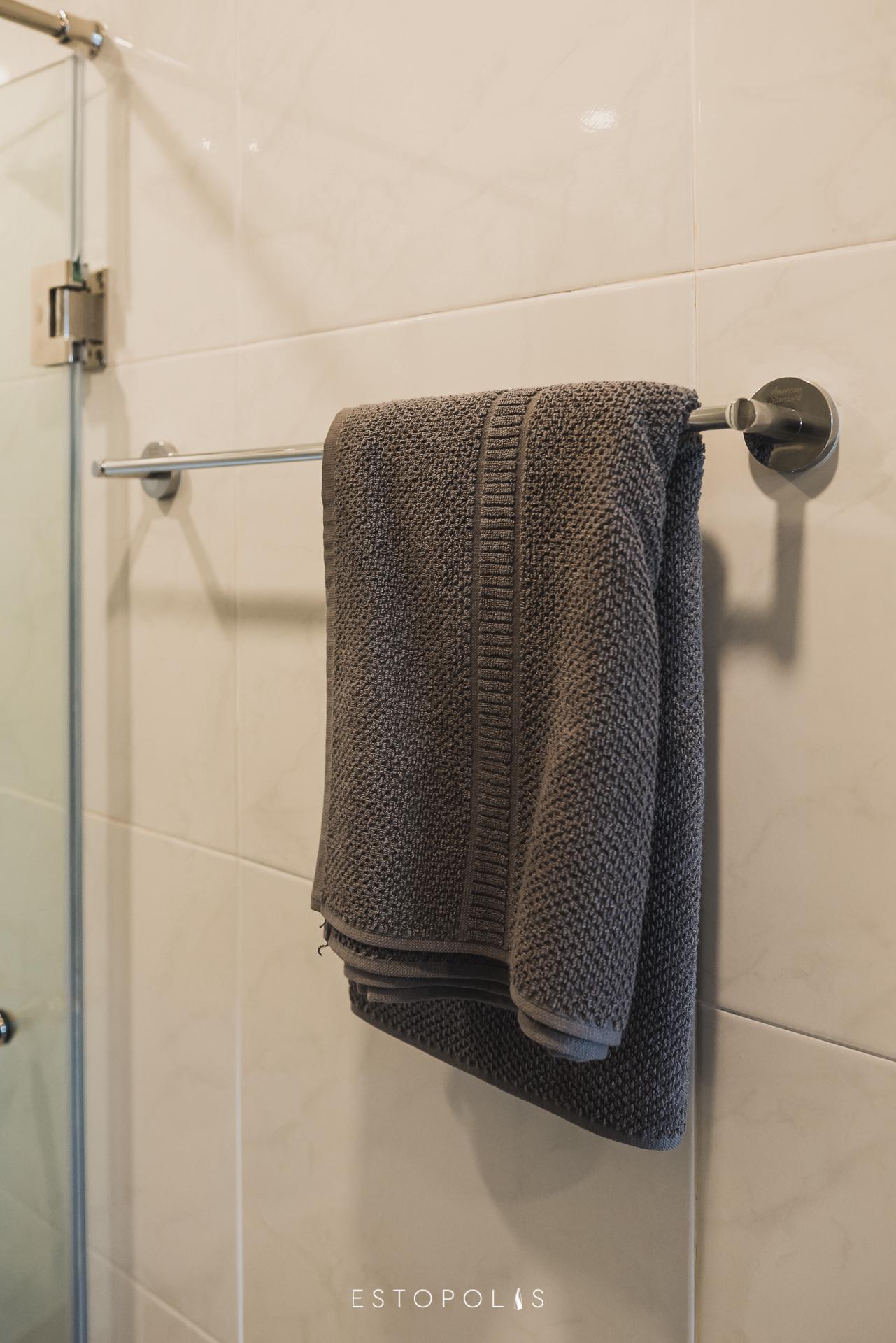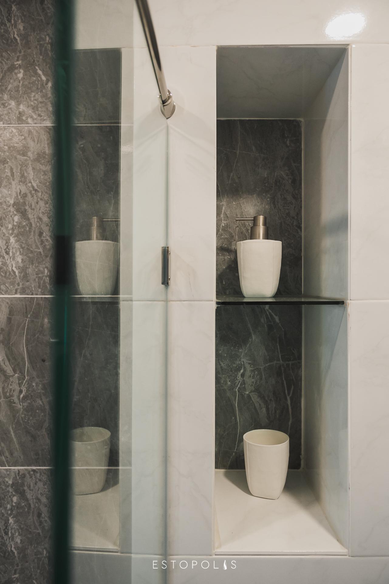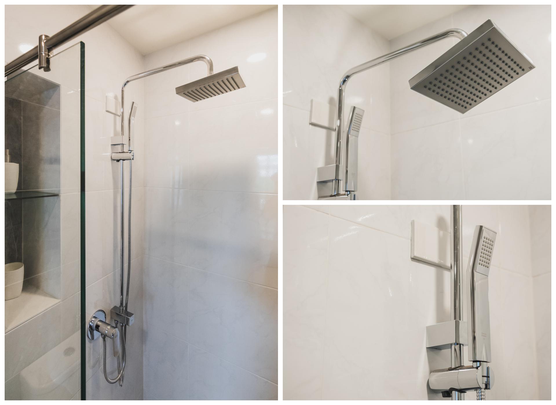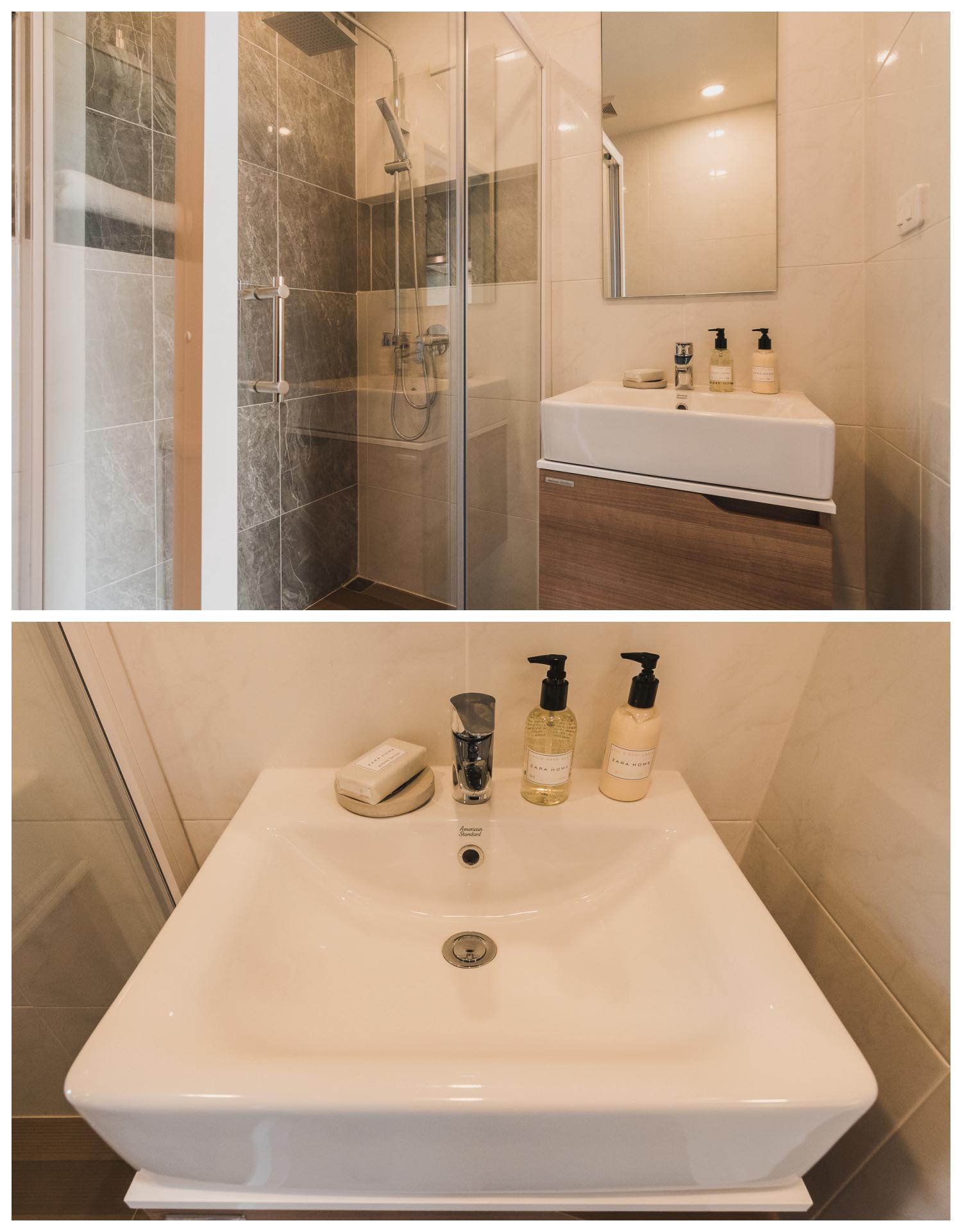 ตู้อาบน้ำขนาดกว้างพอดีตัว ภายในติดตั้งชุดฝักบัวแบบ Rain Shower กับฝักบัวสายอ่อนมาให้เหมือนกันทั้งโครงการ แต่จะมี Drop Wall เพิ่มเข้ามาด้วย ทำให้วางของได้เยอะขึน ส่วนฉากกั้นอาบน้ำใช้เป็นแบบบานเลื่อนกระจกนิรภัยแทน เพื่อประหยัดพื้นที่ใช้สอย