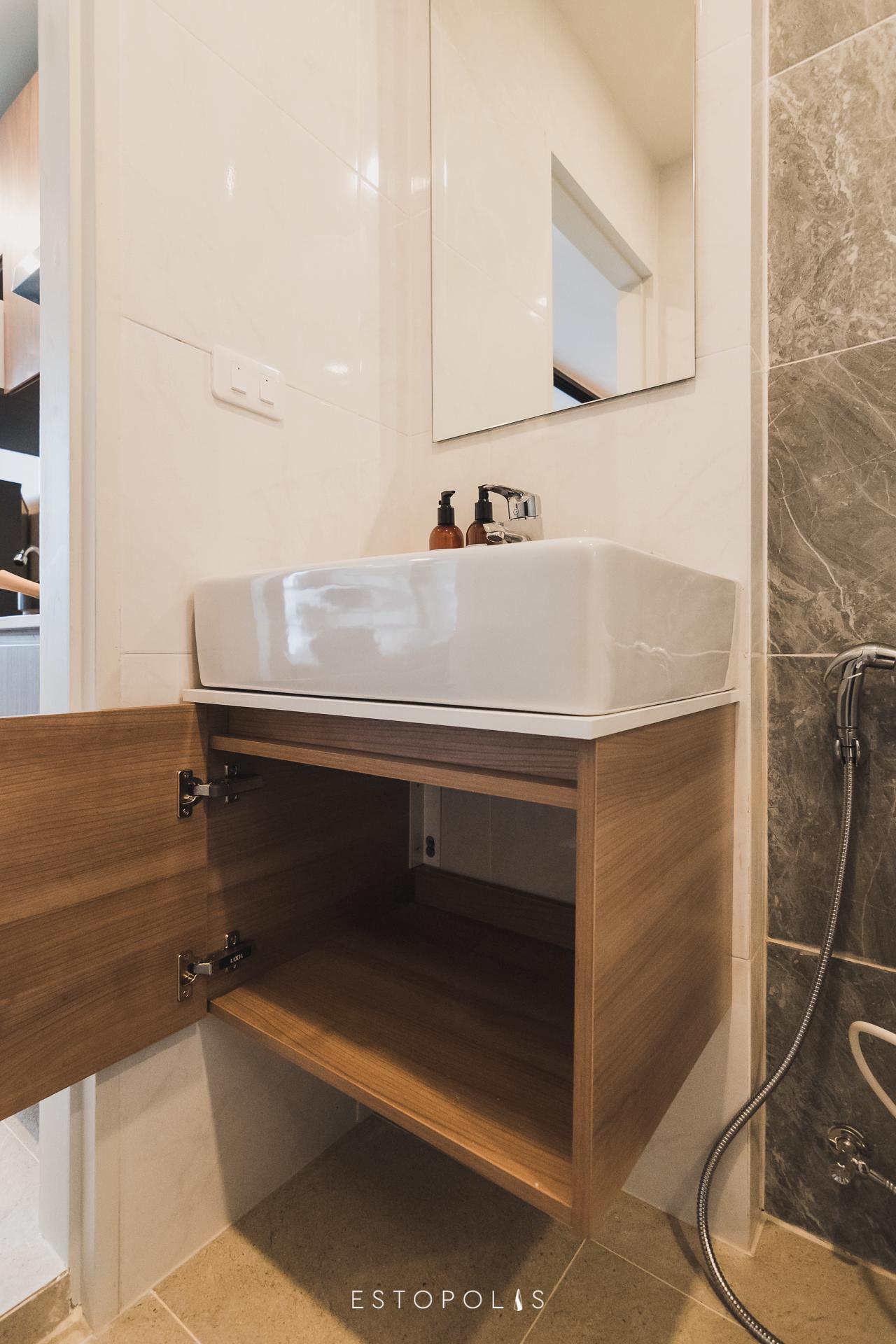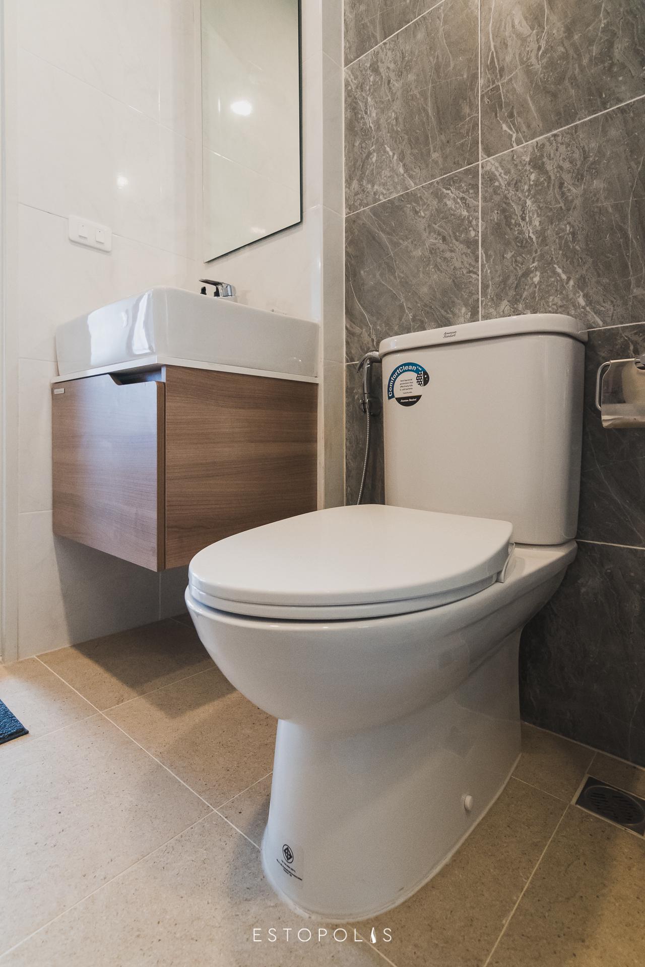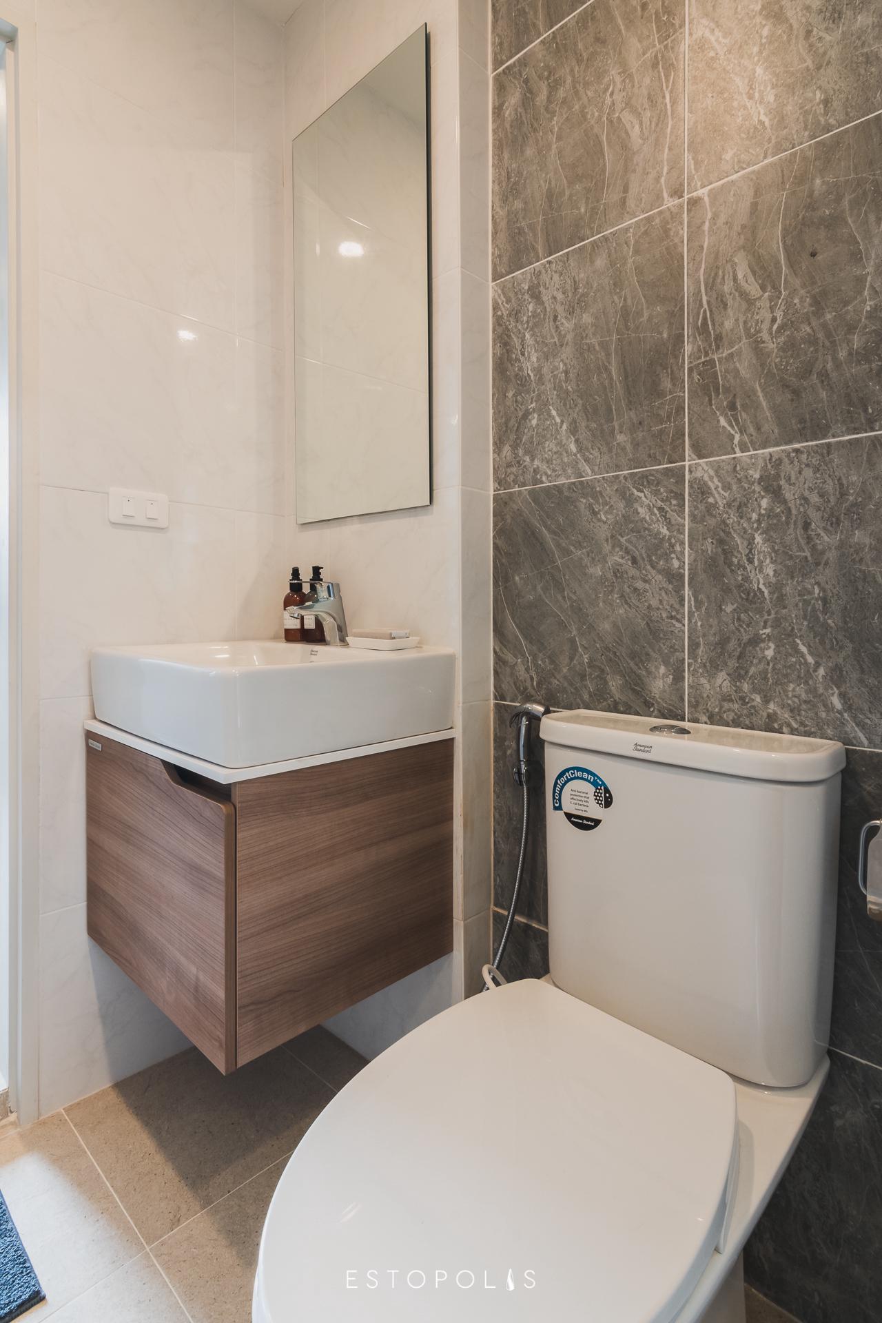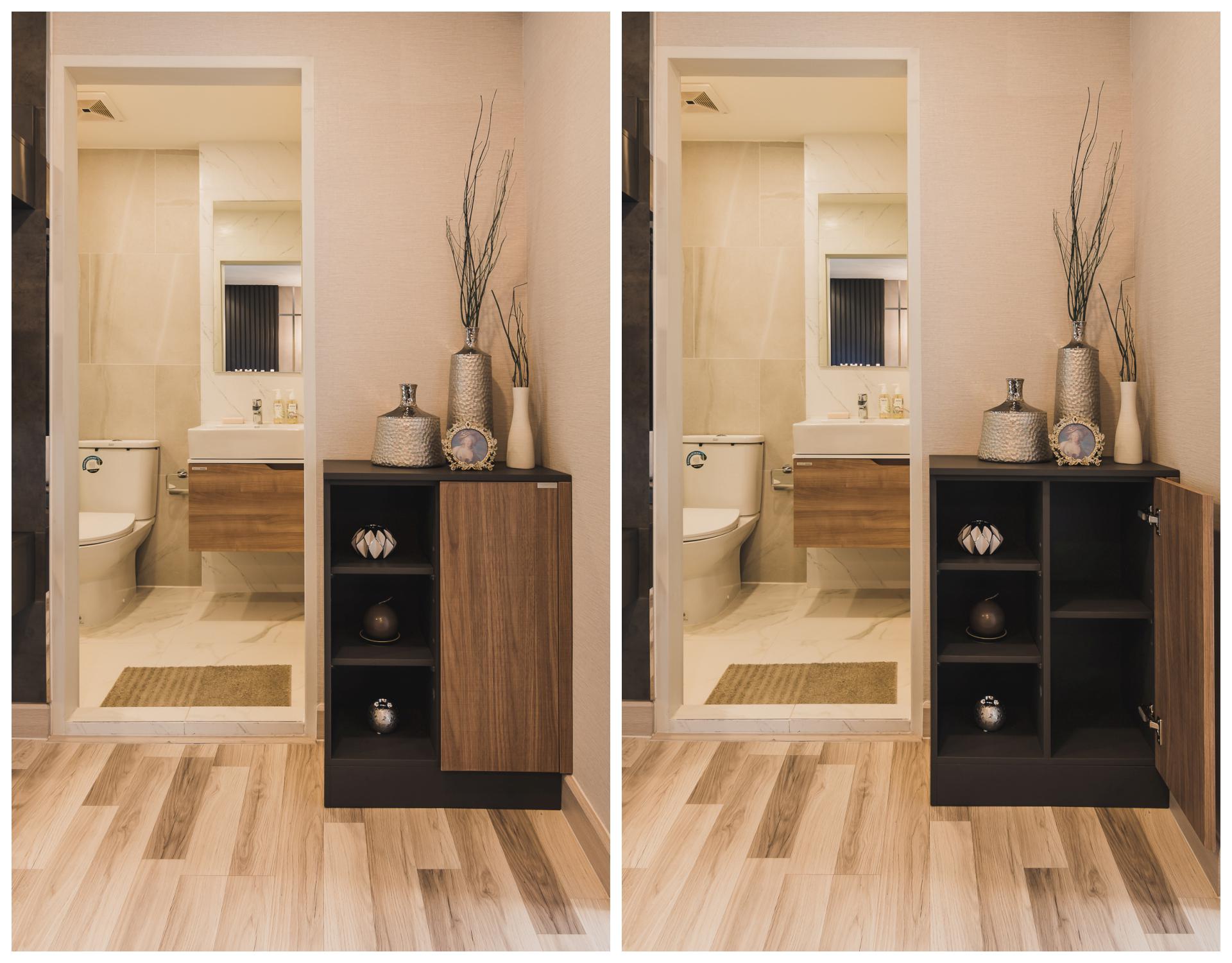 โถสุขภัณฑ์จะย้ายไปไว้ตรงมุมห้อง อยู่ในจุดลับสายตา มีช่อง Drop Wall สำหรับวางของใช้พวกขวดสบู่ แชมพูต่างๆ
