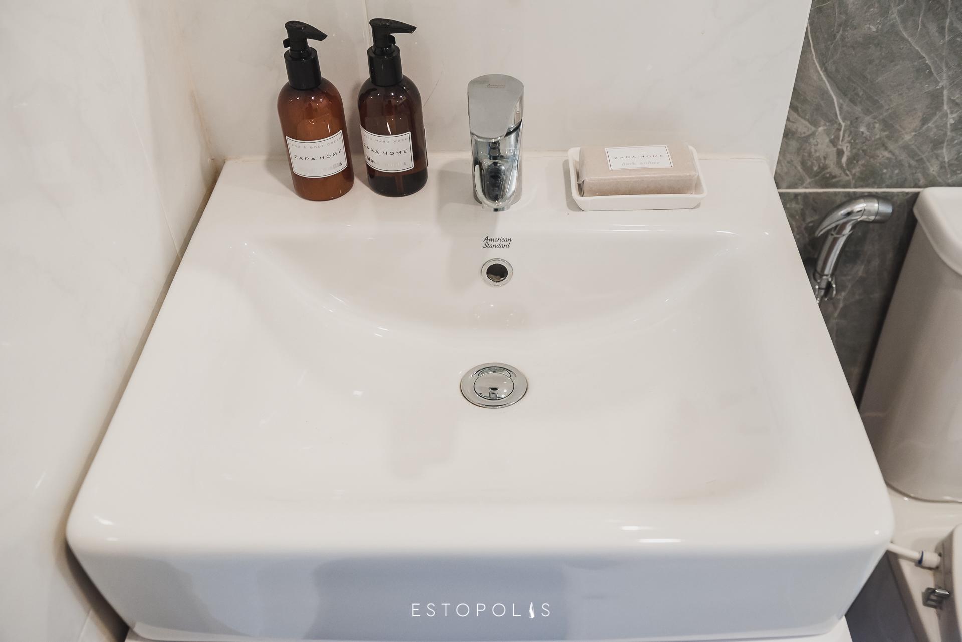 อ่างล้างหน้าอยู่ติดประตู เปิดมาก็สามารถยืนล้างไม้ล้างมือได้ทันที มีกระจกเงาบานครึ่งตัวอยู่ด้านบน