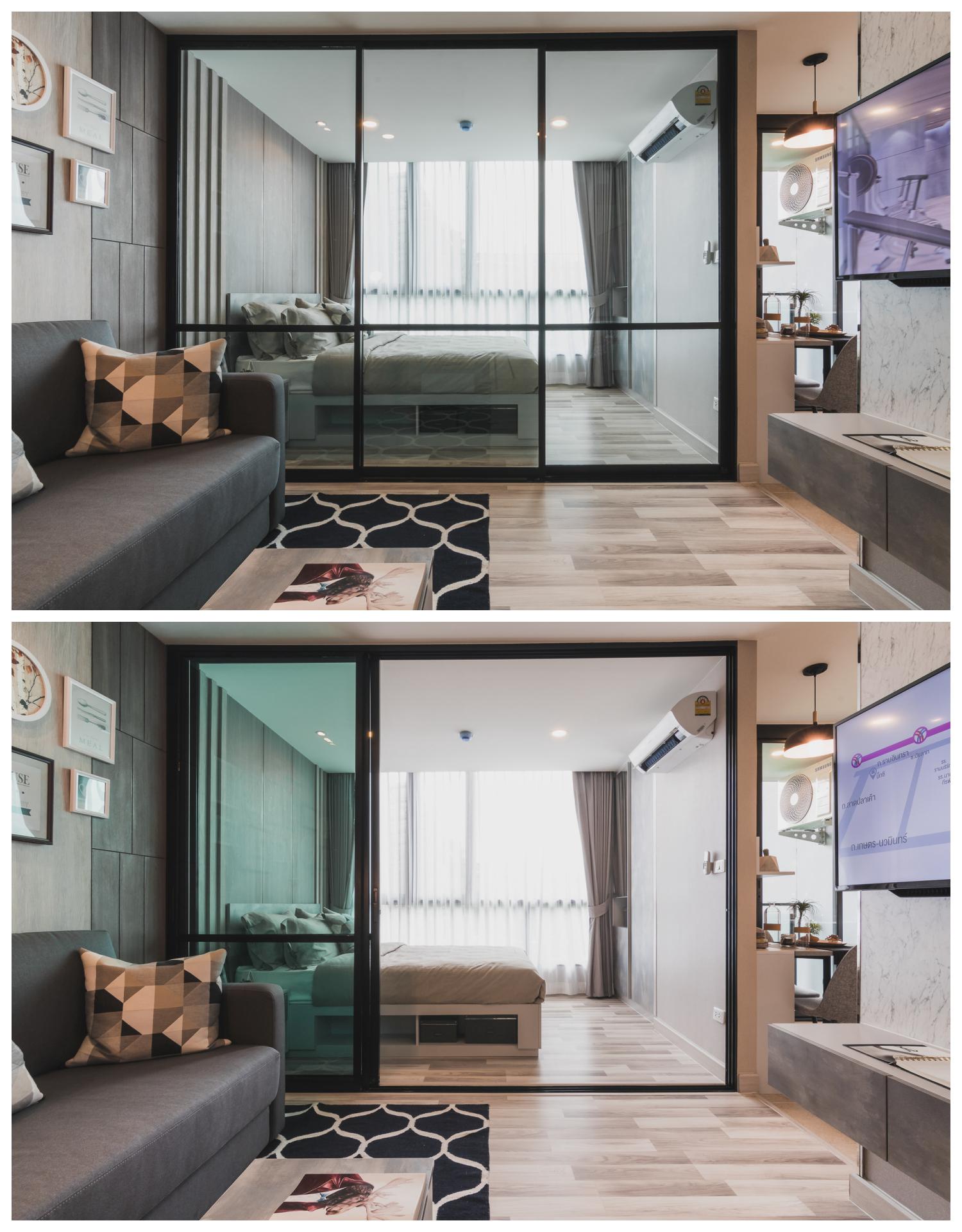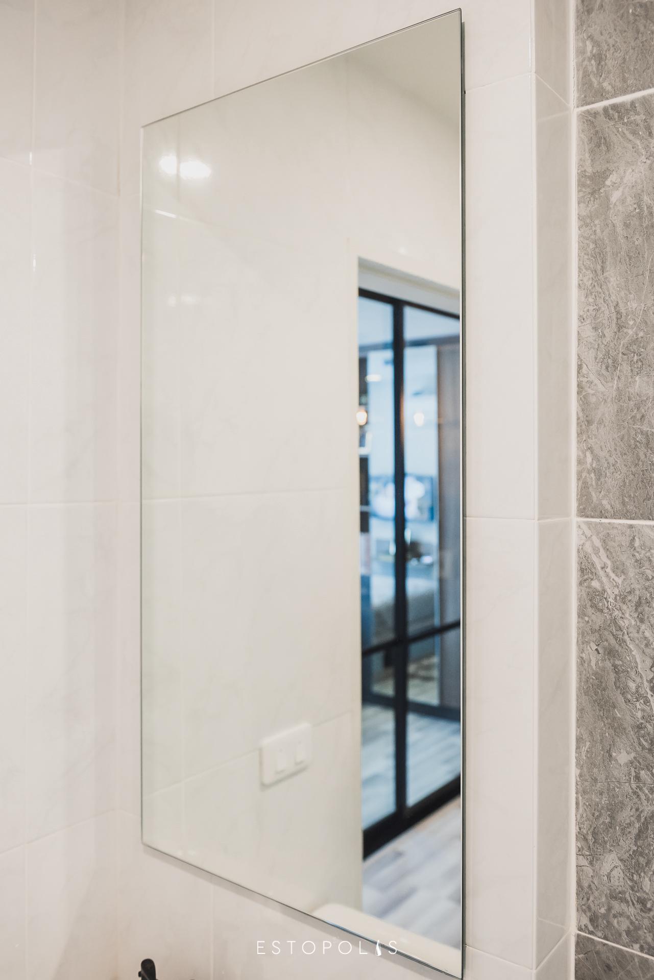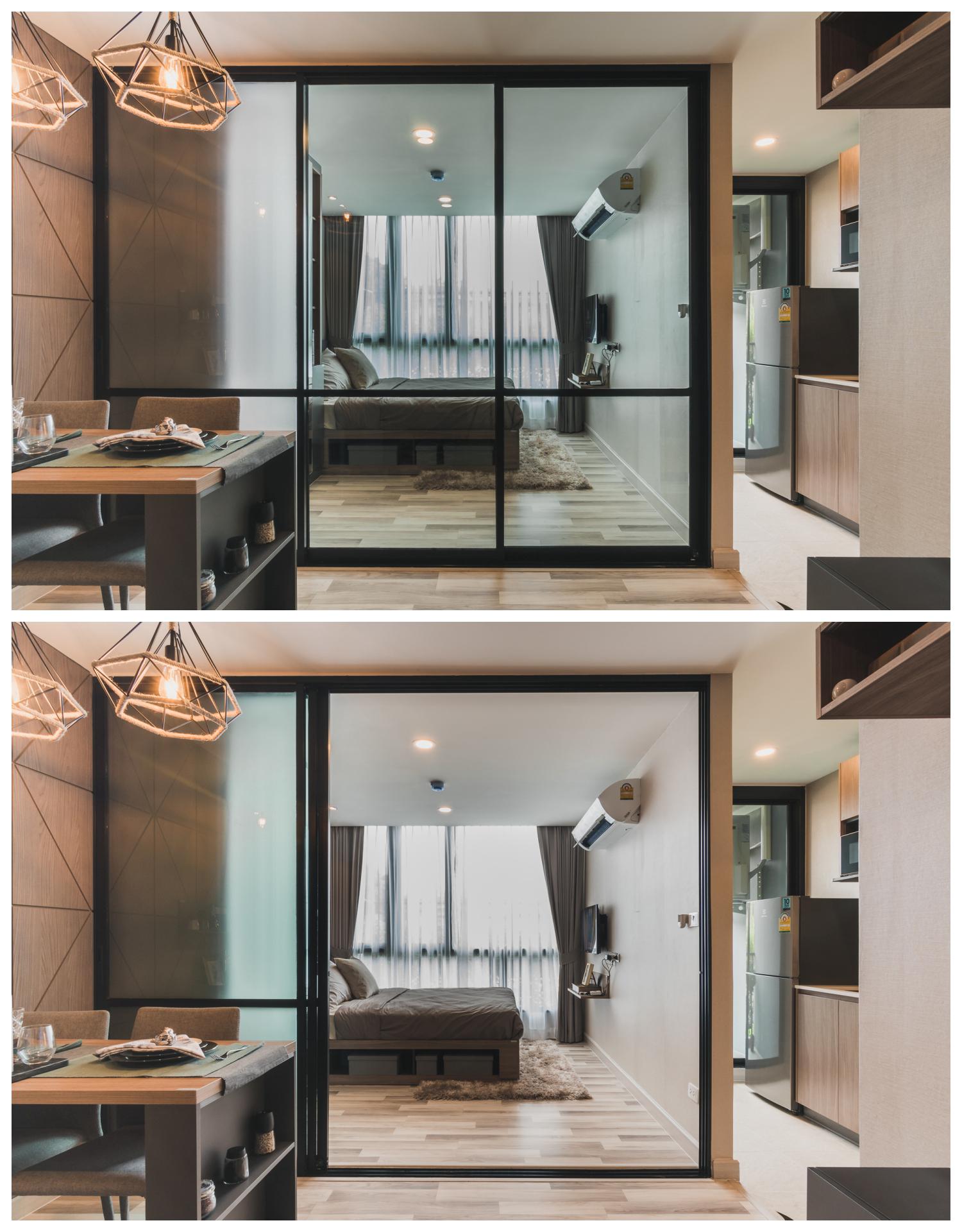 พาร์ติชั่นกระจกแบบ 3 ตอน สามารถเลื่อนเปิดออกได้กว้าง ไม่เกะกะขวางทางเข้าออกห้องนอน และสำหรับใครที่อยากได้ความเป็นส่วนตัว ก็สามารถติดฟิล์มขุ่นหรือมู่ลี่เพิ่มได้