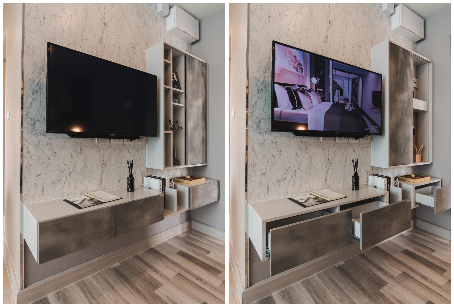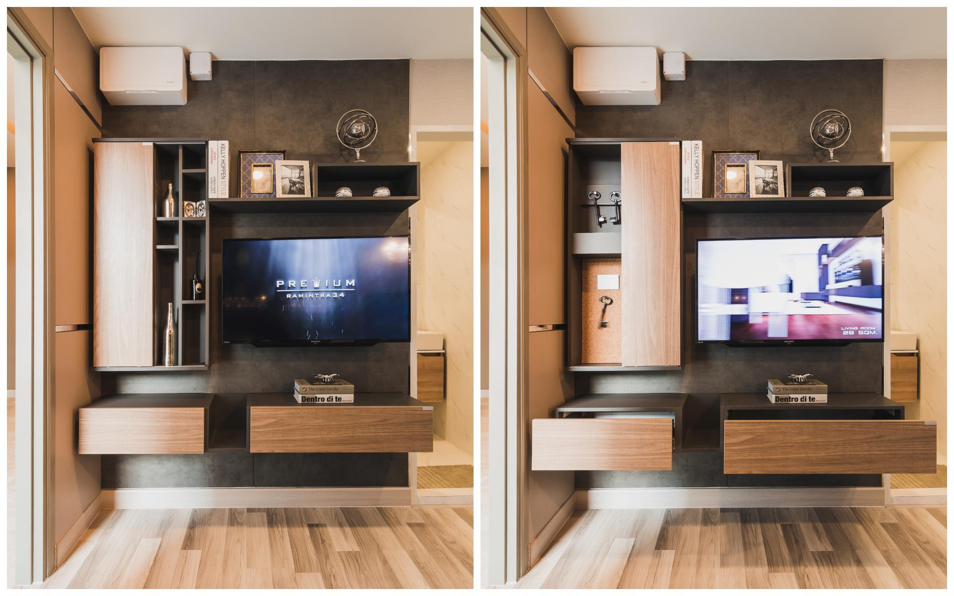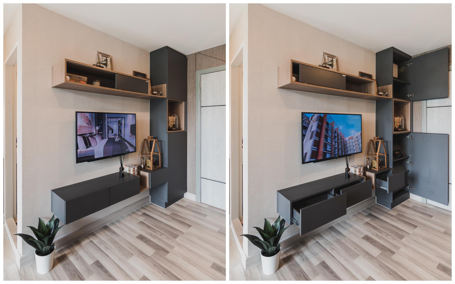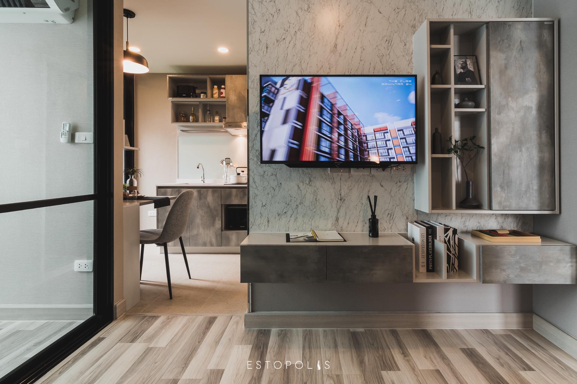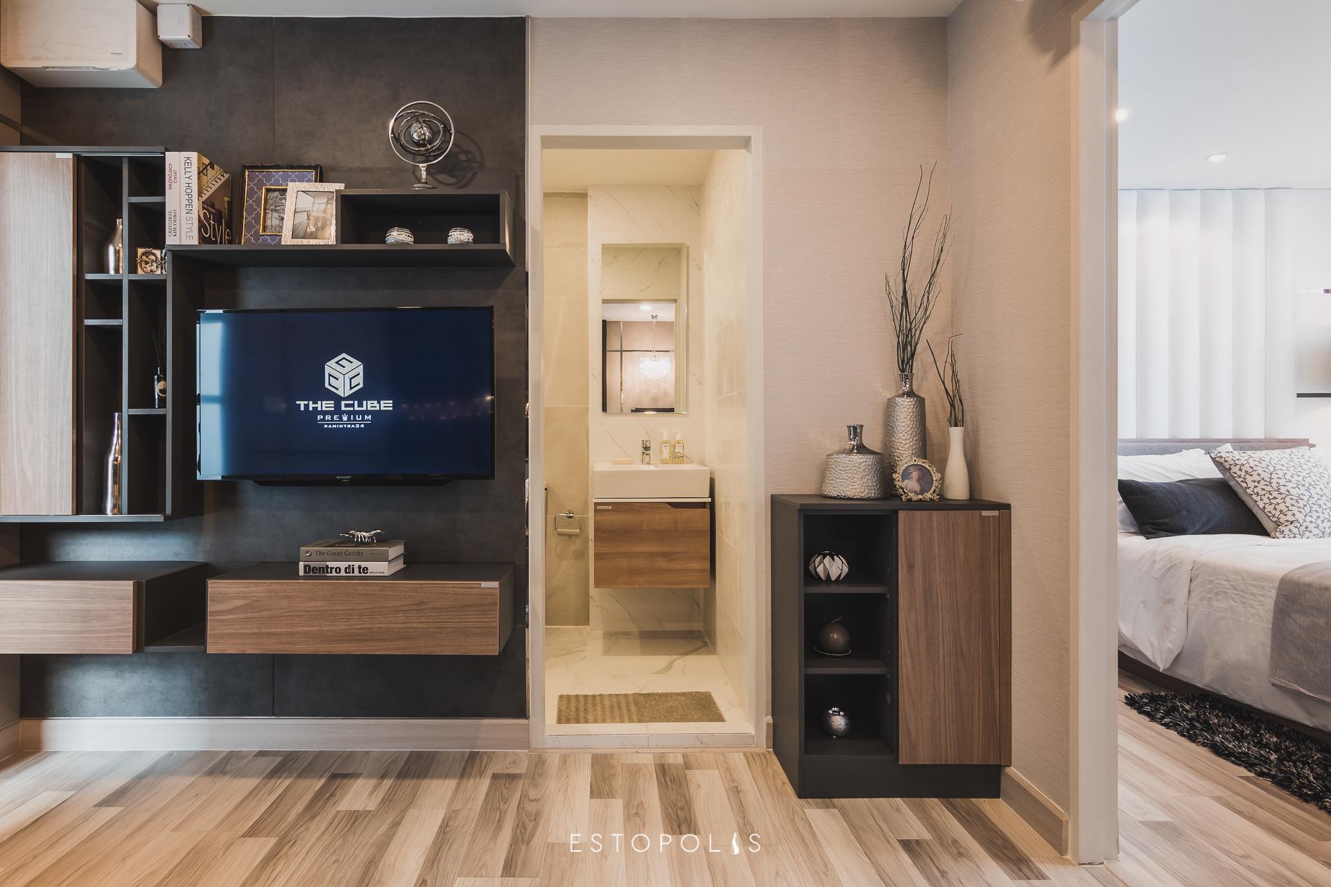 นอกจากโซฟา , โต๊ะกาแฟ และชุดโต๊ะรับประทานอาหารแล้ว โครงการเดอะคิวบ์ พรีเมียม รามอินทรา 34 ก็ได้บิลด์อิน (Built in) ชั้นวางโทรทัศน์บานเปิดปิด Soft Close ให้ด้วยเช่นกัน ในลักษณะติดผนังคู่กลับตู้รองเท้าด้านข้าง