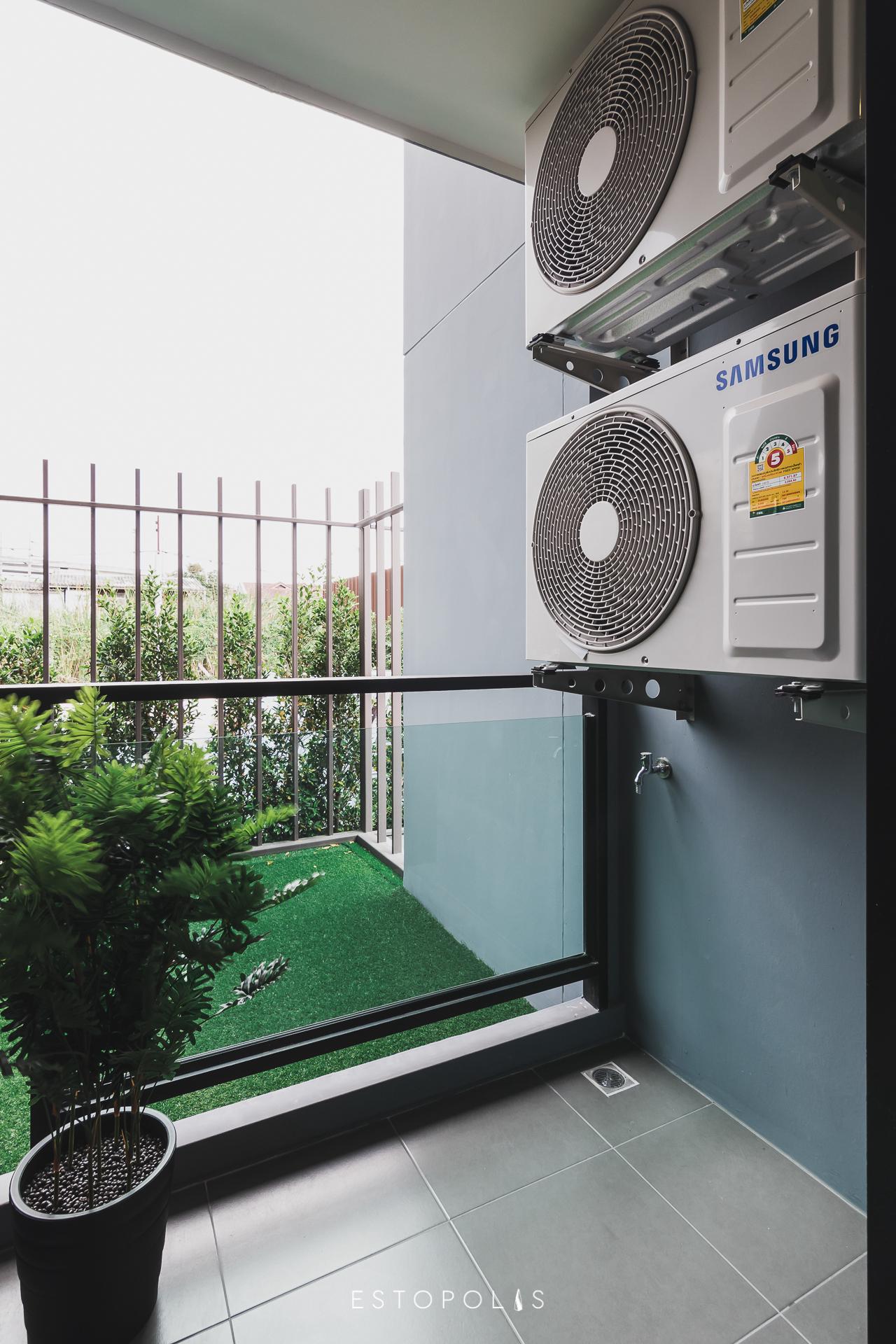 คอมเพรสเซอร์แอร์แขวนอยู่ด้านบนในทิศทางหันเข้าผนัง ฉะนั้นหากใครอยากให้ผ้าแห้งเร็ว แนะนำให้ติดราวตากผ้าไว้บริเวณนี้ ส่วนพื้นที่ด้านล่างสูงประมาณ 1.2 เมตรพอให้ตั้งเครื่องซักผ้าฝาหน้าได้ ซึ่ง ทาง โครงการเดอะคิวบ์ พรีเมียม รามอินทรา 34 ก็ได้เดินระบบท่อน้ำ ติดตั้งก็อกและปลั๊กไฟให้เรียบร้อย