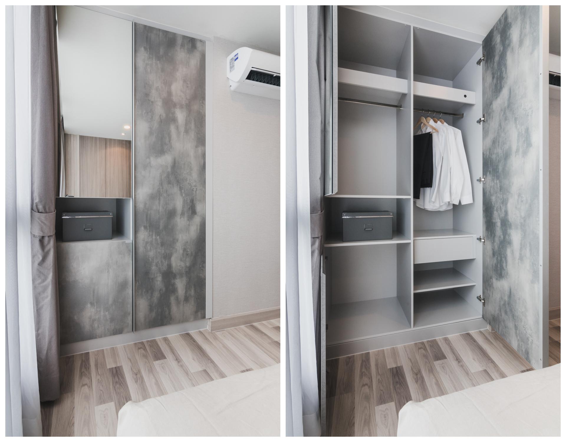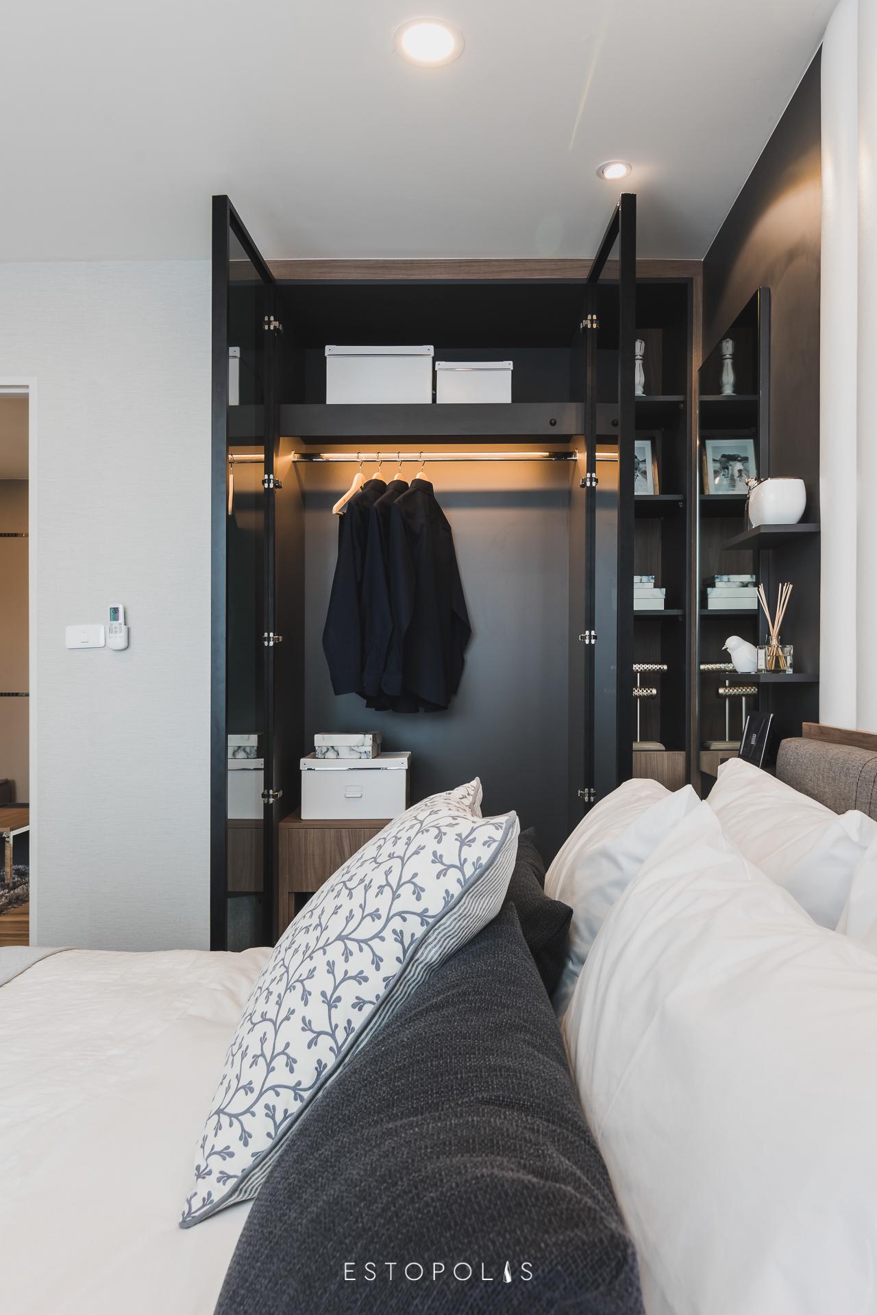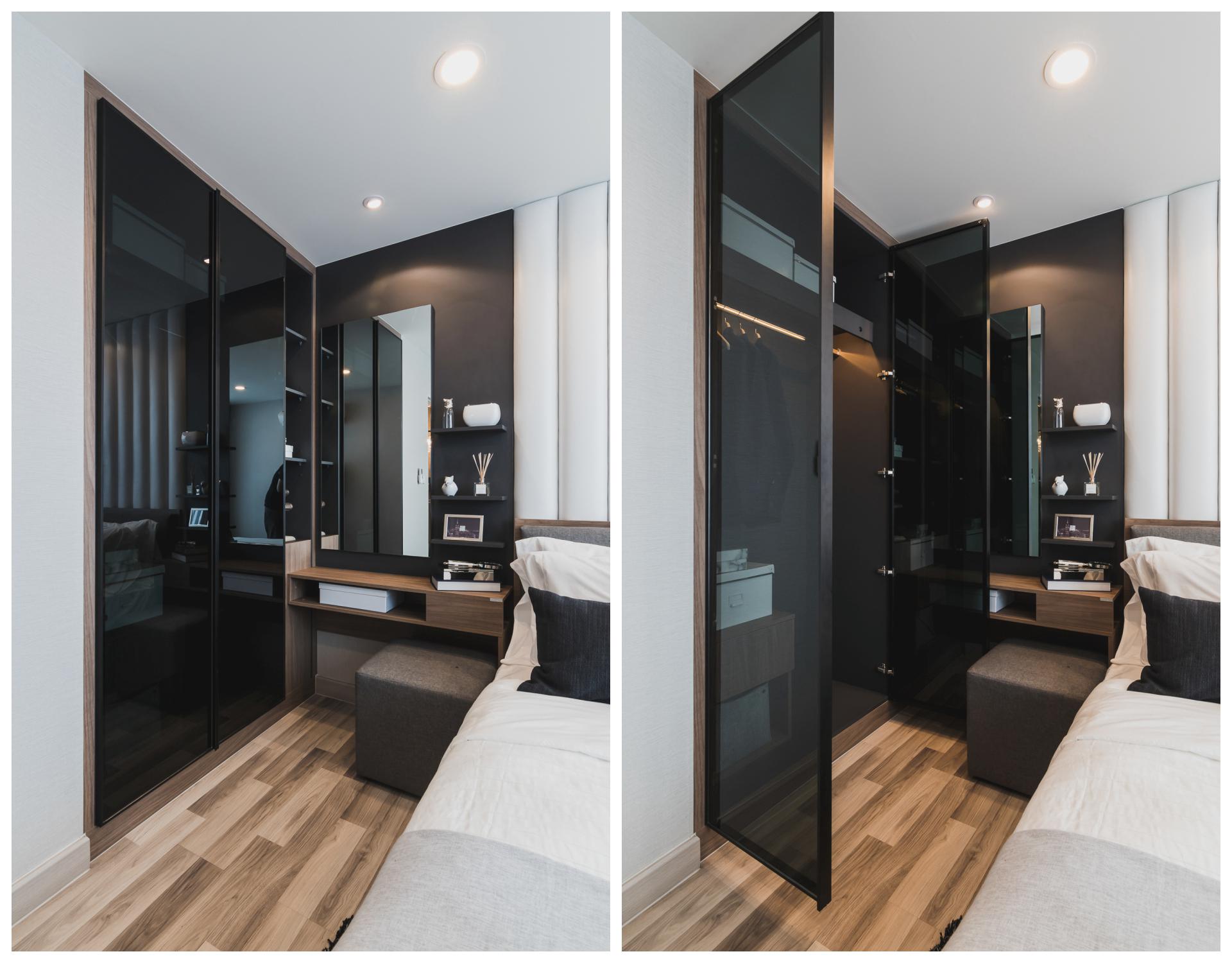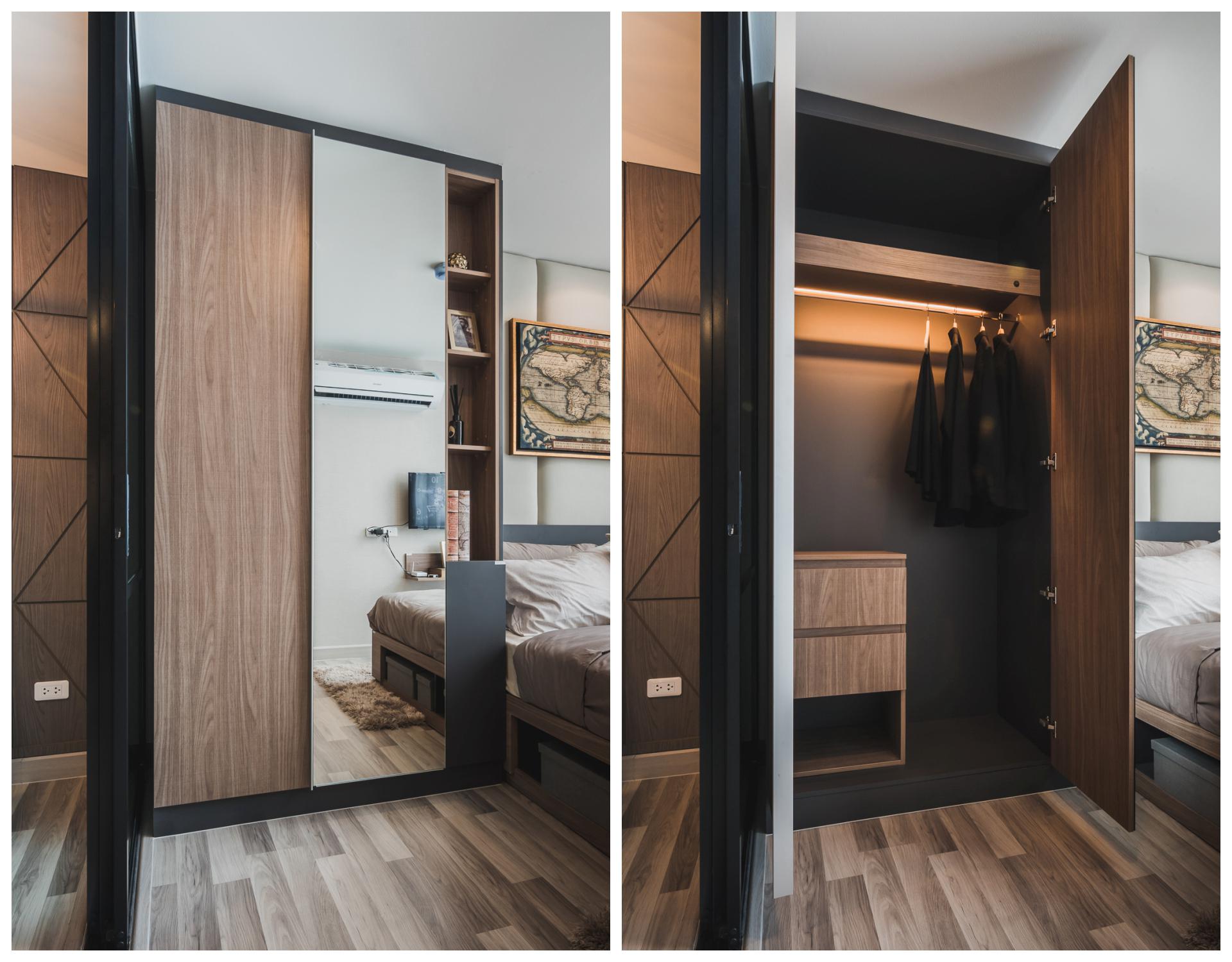 ตู้เสื้อผ้าบิลท์อินและออกแบบให้ใช้งานได้หลากหลายฟังก์ชั่นในชิ้นเดียว ทั้งส่องกระจกดูความเรียบร้อย ทั้งวางของจัดเก็บหนังสือ และเมื่อเปิดตู้ออกมาจะมีที่ให้ใช้ประโยชน์ได้เต็มที่เท่าความสูงห้อง