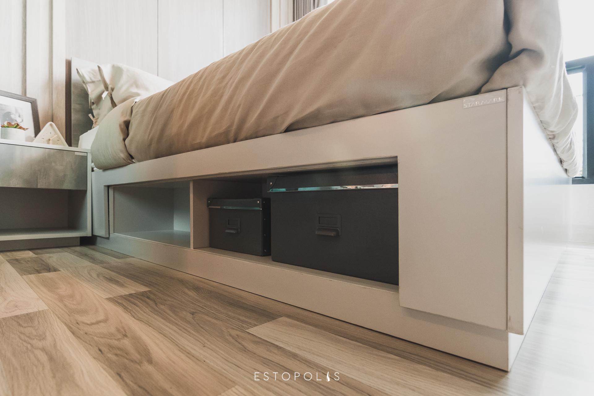 นอกจากนี้ตรงฐานเตียงก็ยังทำเป็นช่องไว้ให้เก็บของเพิ่มได้อีกจุดหนึ่ง เหมาะสำหรับผู้ที่มีข้าวของเยอะ อีกทั้งยังช่วยให้เราทำความสะอาดห้องง่ายขึ้นกว่าเดิม ไม่ต้องกังวลเรื่องฝุ่นผงเกาะตามของใช้หรือซ่อนตัวอยู่ใต้เฟอร์นิเจอร์