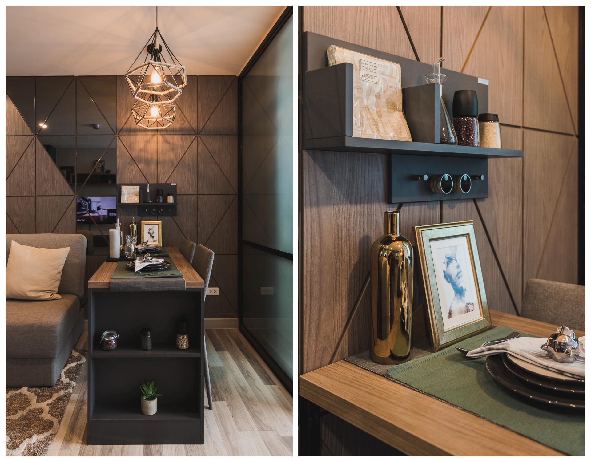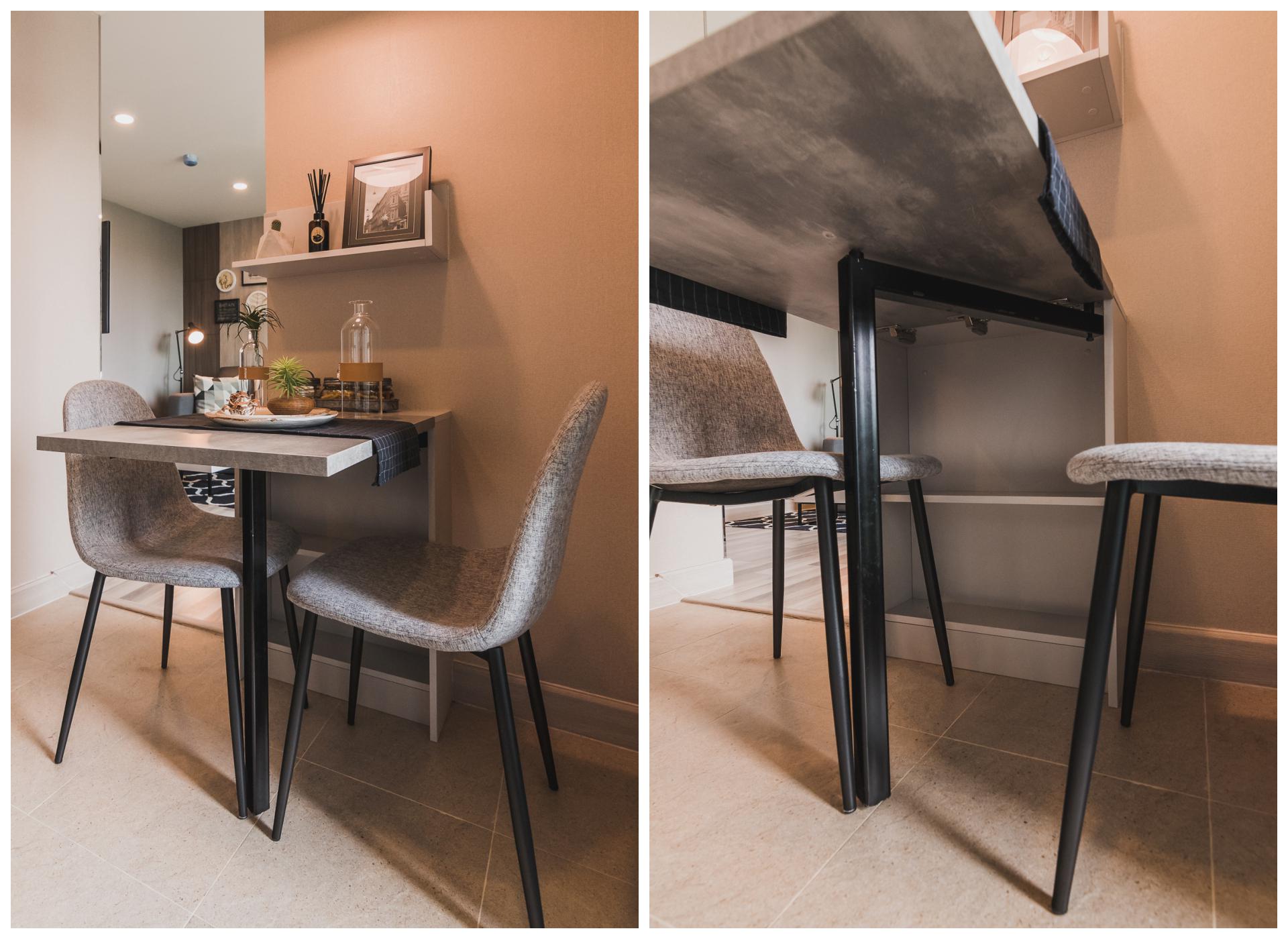 มุมทานอาหารสำหรับ 1-2 คน พร้อมด้วยชั้นวางขนาดเล็กที่มาคู่กัน และออกแบบให้ด้านล่างเป็นชั้นเก็บของอเนกระสงค์ เพื่อการใช้งานที่คุ้มค่า
