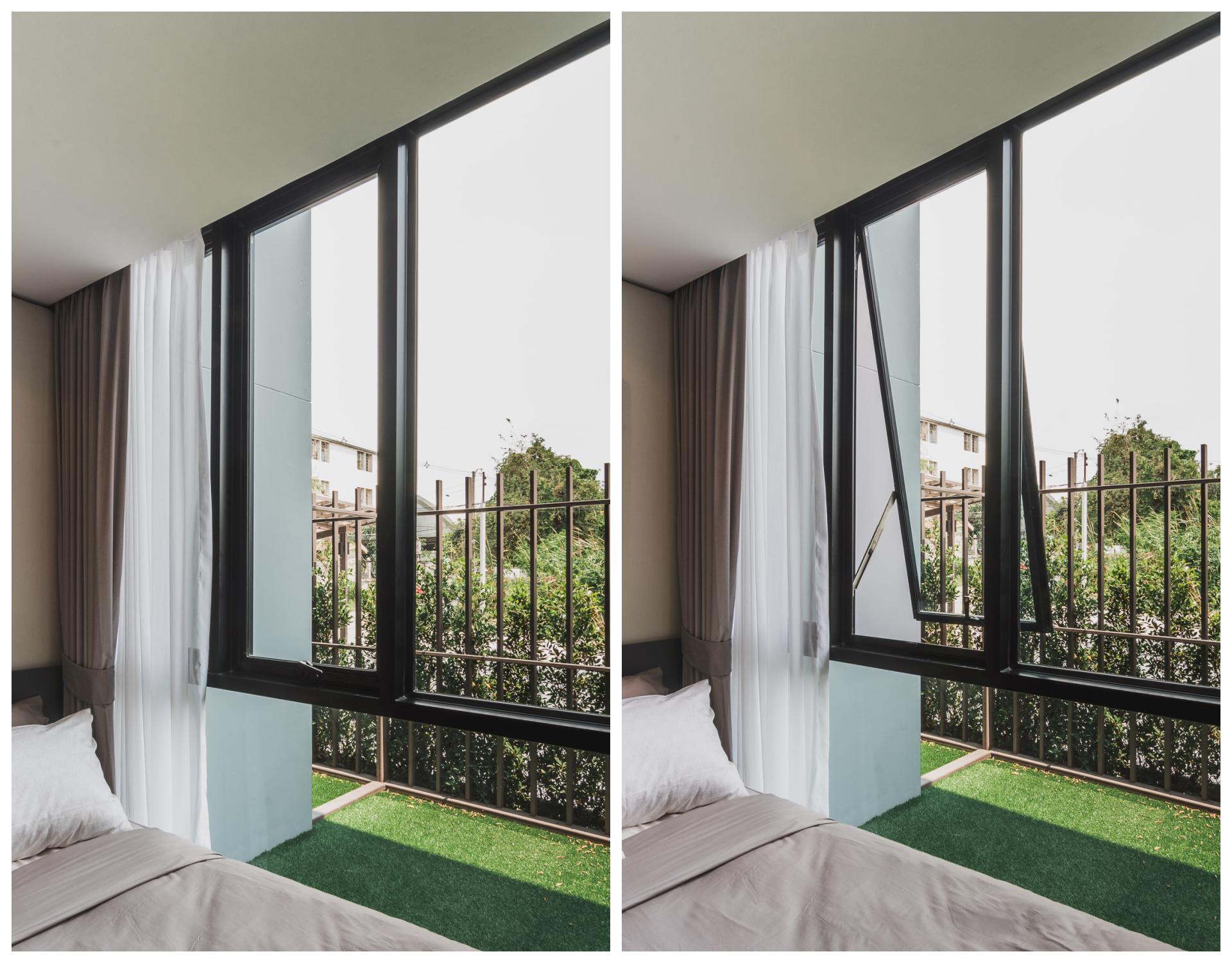 หน้าต่างของ โครงการเดอะคิวบ์ พรีเมียม รามอินทรา 34 ใช้เป็นกระจกเขียวตัดแสงหนา 6 มม. ช่วยลดอุณหภูมิหรือผู้พักอาศัยจะแขวนผ้าม่านเพิ่มอีกชั้นหนึ่งก็ได้