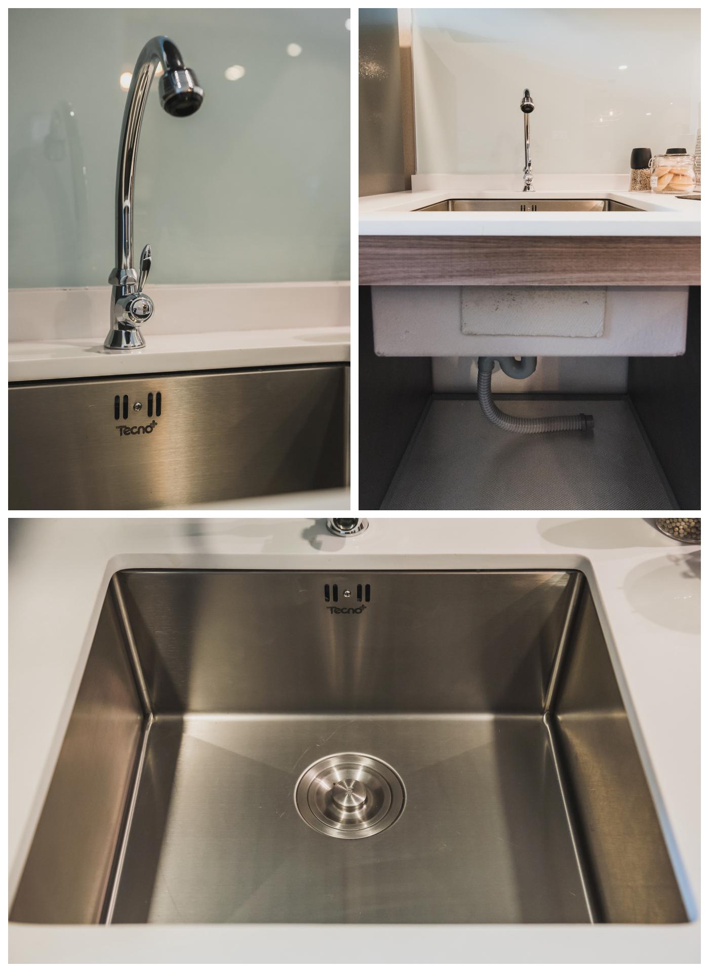 โครงการเดอะคิวบ์ พรีเมียม รามอินทรา 34 ติดตั้งอ่างล้างจาน Tecno ไว้แบบใต้เคาน์เตอร์ พร้อมก็อกน้ำหมุนปรับทิศทางได้ จึงสะดวกเวลาใช้งาน จะล้างจานหรือแช่ผักผลไม้ก็ตอบโจทย์ ส่วนด้านล่างเป็นตู้ใต้ซิงค์ที่พอเปิดออกมาจะมีพื้นที่ให้เก็บของได้เยอะ เหมาะสำหรับเก็บของชิ้นใหญ่