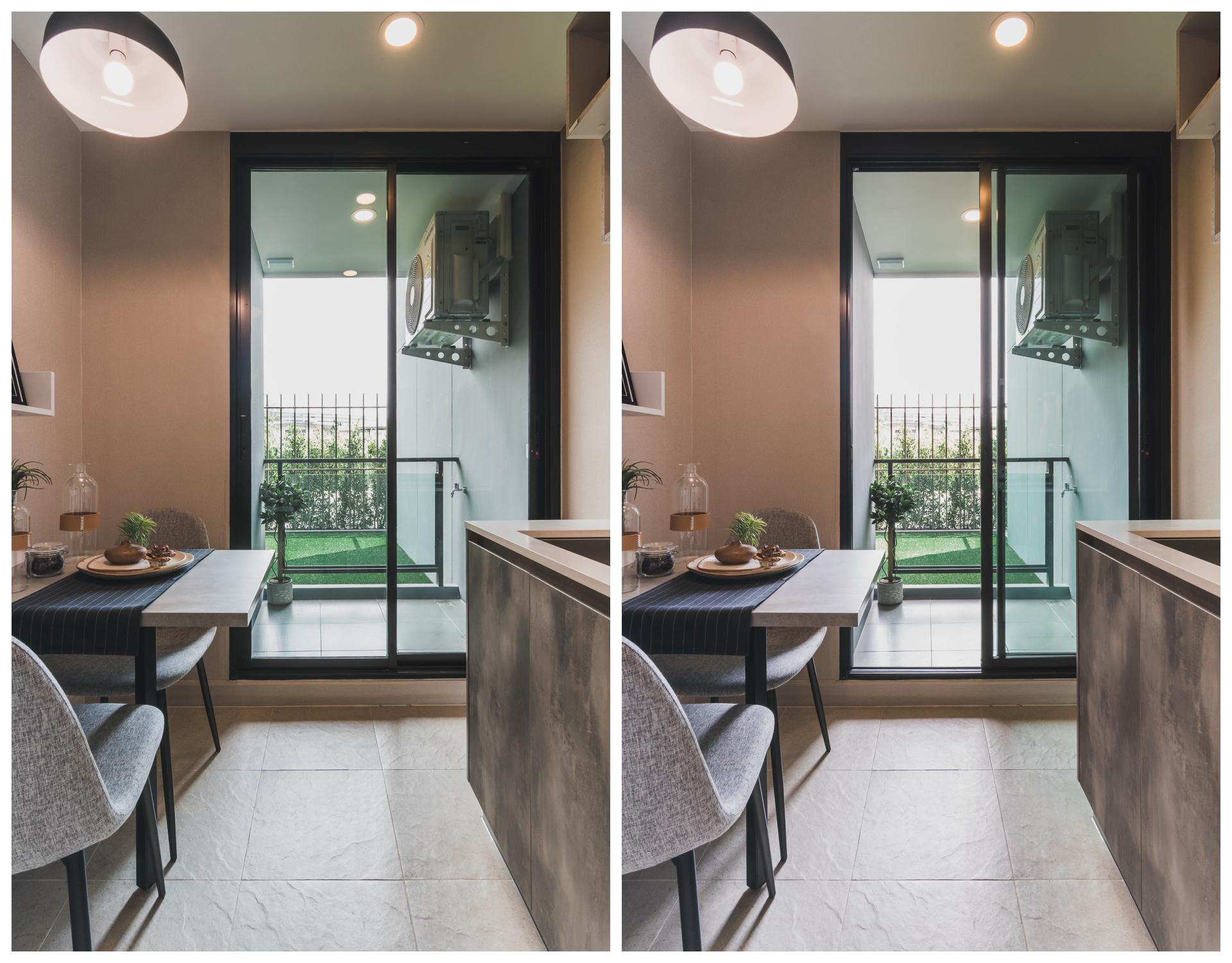 ริมสุดกรุหน้าต่างบานใหญ่กว้างเต็มผนัง ทำหน้าที่เป็นช่องรับแสงชั้นดี ทำให้บรรยากาศห้องโดยรวมดูปลอดโปร่ง น่าอยู่อาศัยในทุกๆ วัน อีกทั้งยังเป็นตัวช่วยหนึ่งที่ทำให้ห้องขนาด 28 ตร.ม. ดูกว้างขวางขึ้น