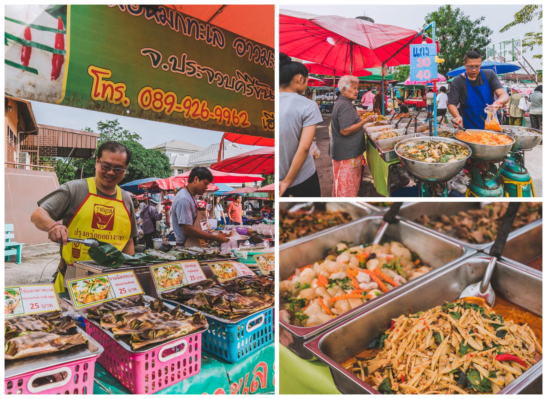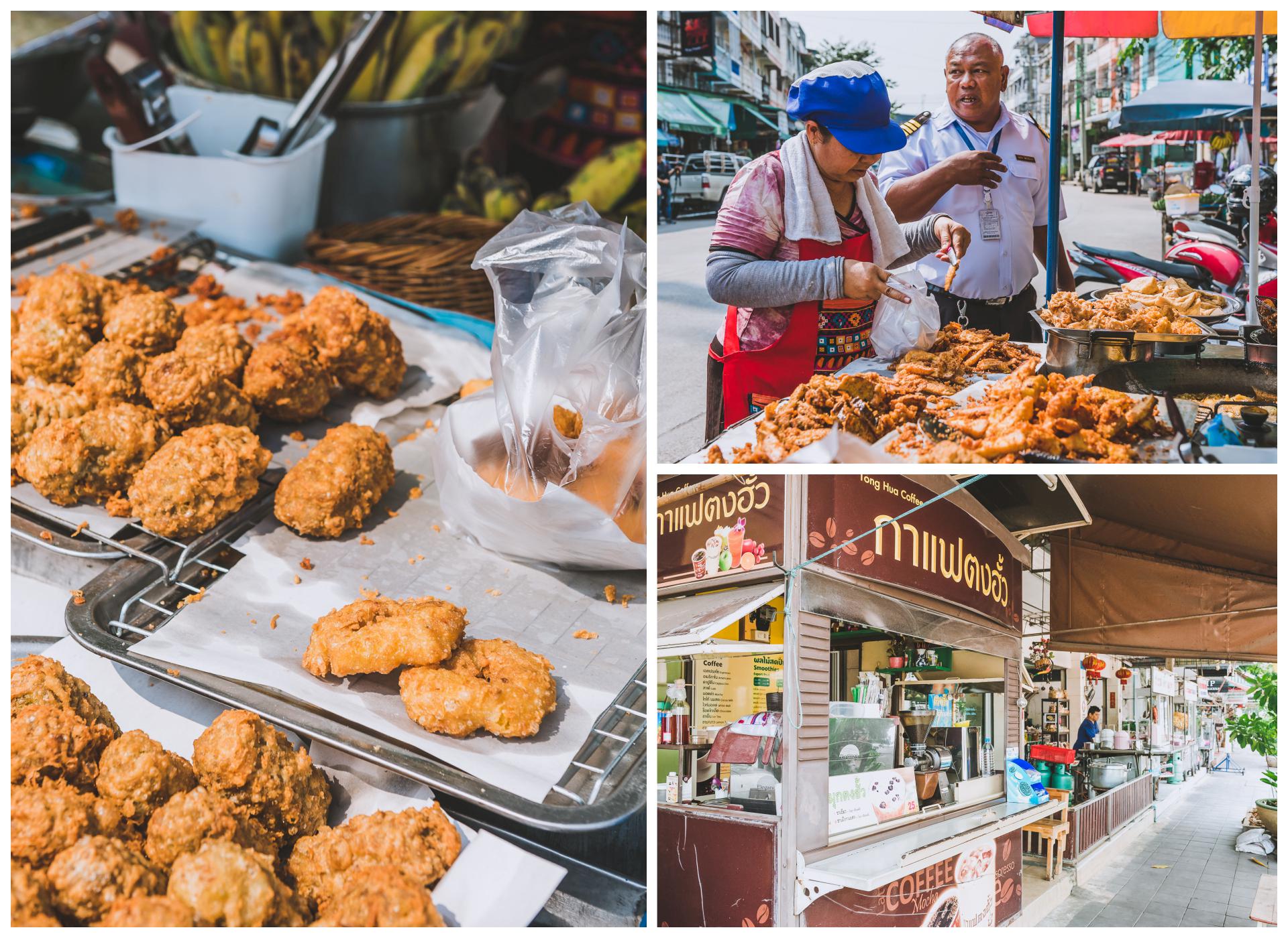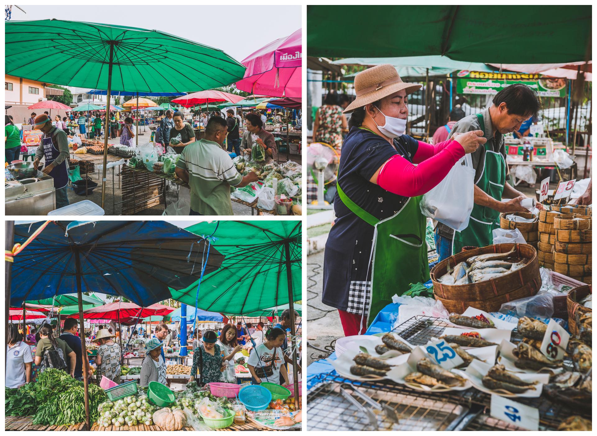 ด้านหน้าเต็มไปด้วยร้านขายของทอด ร้านผลไม้ ข้าวเหนียวหมูปิ้ง กาแฟและเครื่องดื่มให้ทานเพลินตลอดวัน