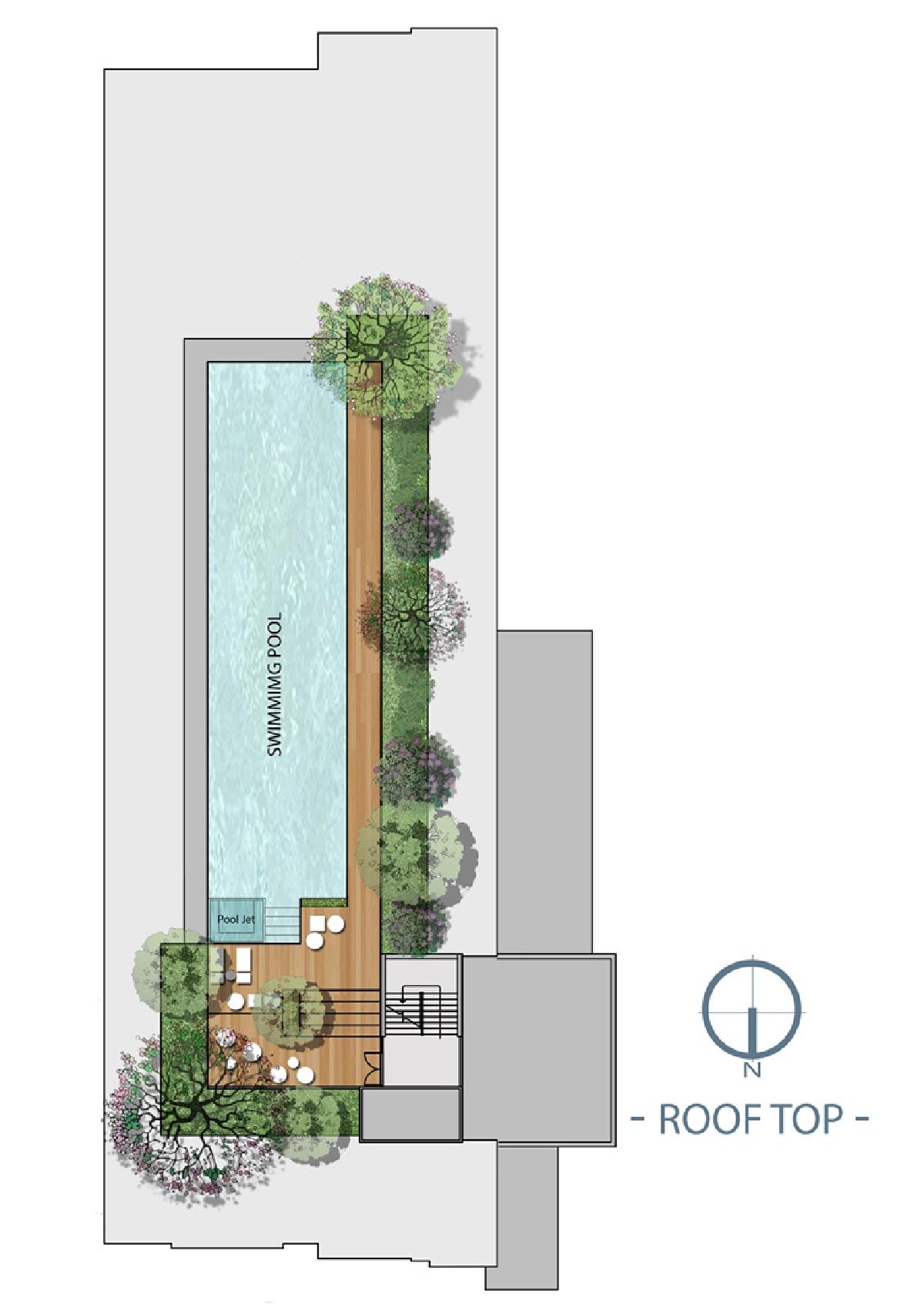 ในชั้น Roof top จะเป็นจุดให้บริการพื้นที่ส่วนกลางหลักอีกจุด ประกอบด้วย Pool jet และสระว่ายน้ำ , สวนแบบ Panorama View และลานพักผ่อนท่ามกลางกลางธรรมชาติแบบกลางแจ้ง