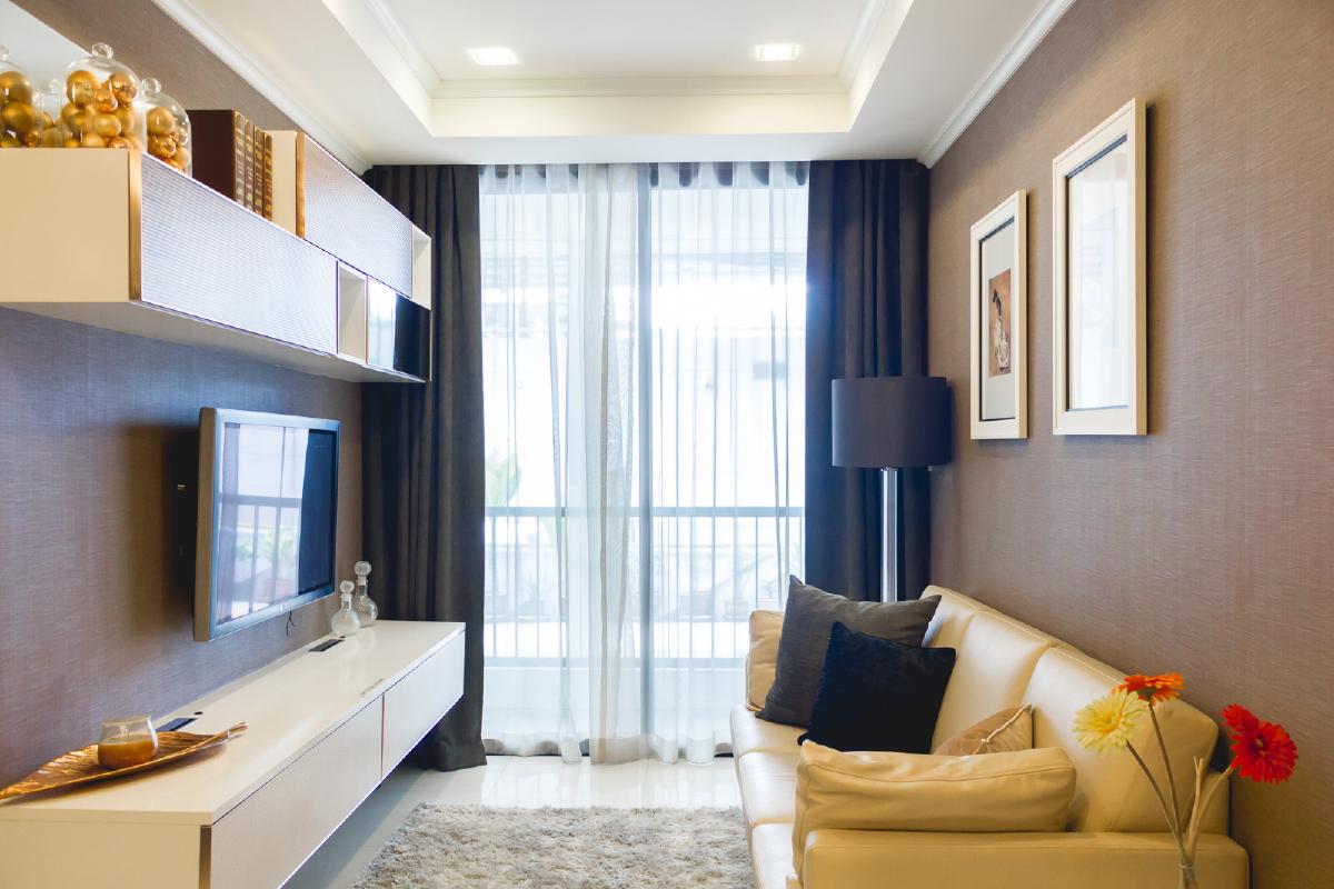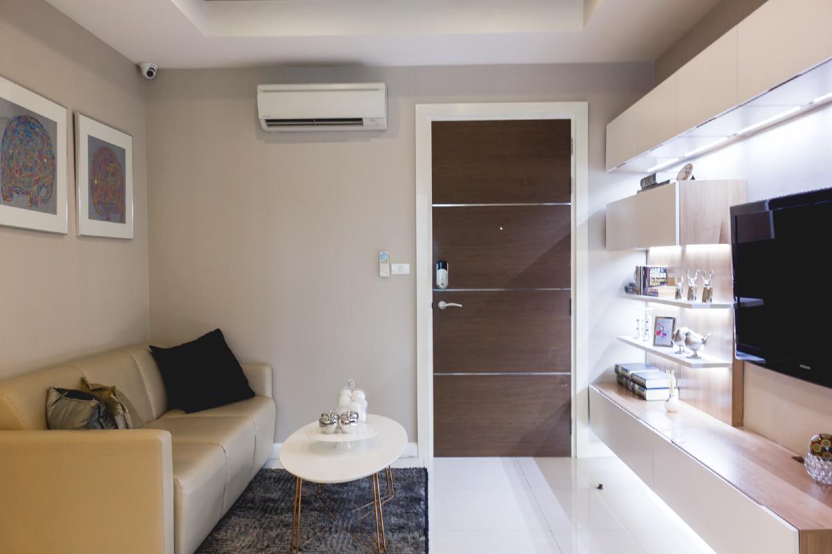 หน้าโซฟามีเนื้อที่เหลือเฟือให้ตั้งโต๊ะกลางเพิ่มได้ แถมยังเดินไปมาสะดวก ส่วนชั้นวางโทรทัศน์เป็น Built in ลามิเนตของทางโครงการ ซึ่งแนะนำว่าให้แขวนโทรทัศน์กับผนังเพื่อประหยัดพื้นที่ในการติดตั้ง ให้สามารถวางของใช้อื่นๆ ได้มากขึ้น