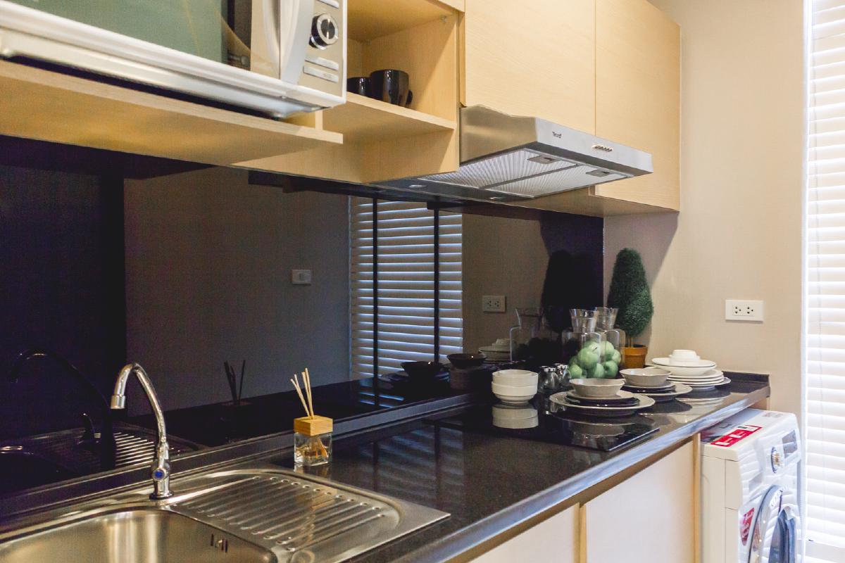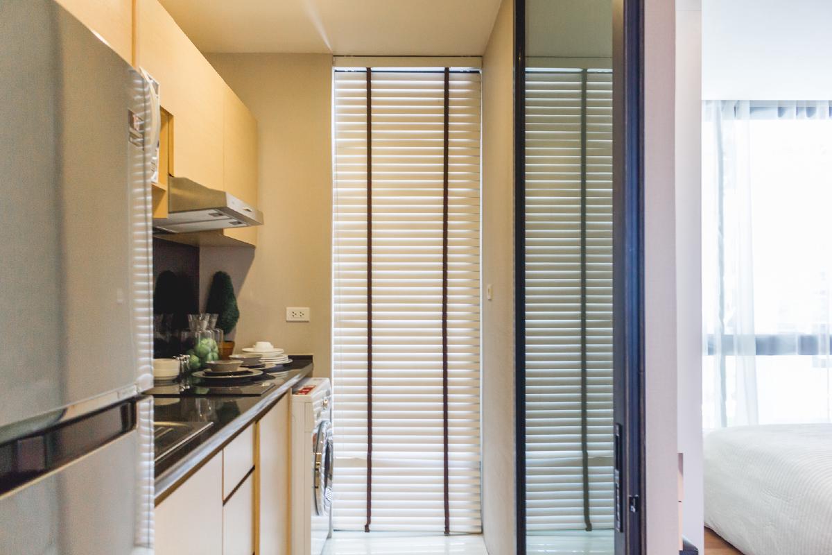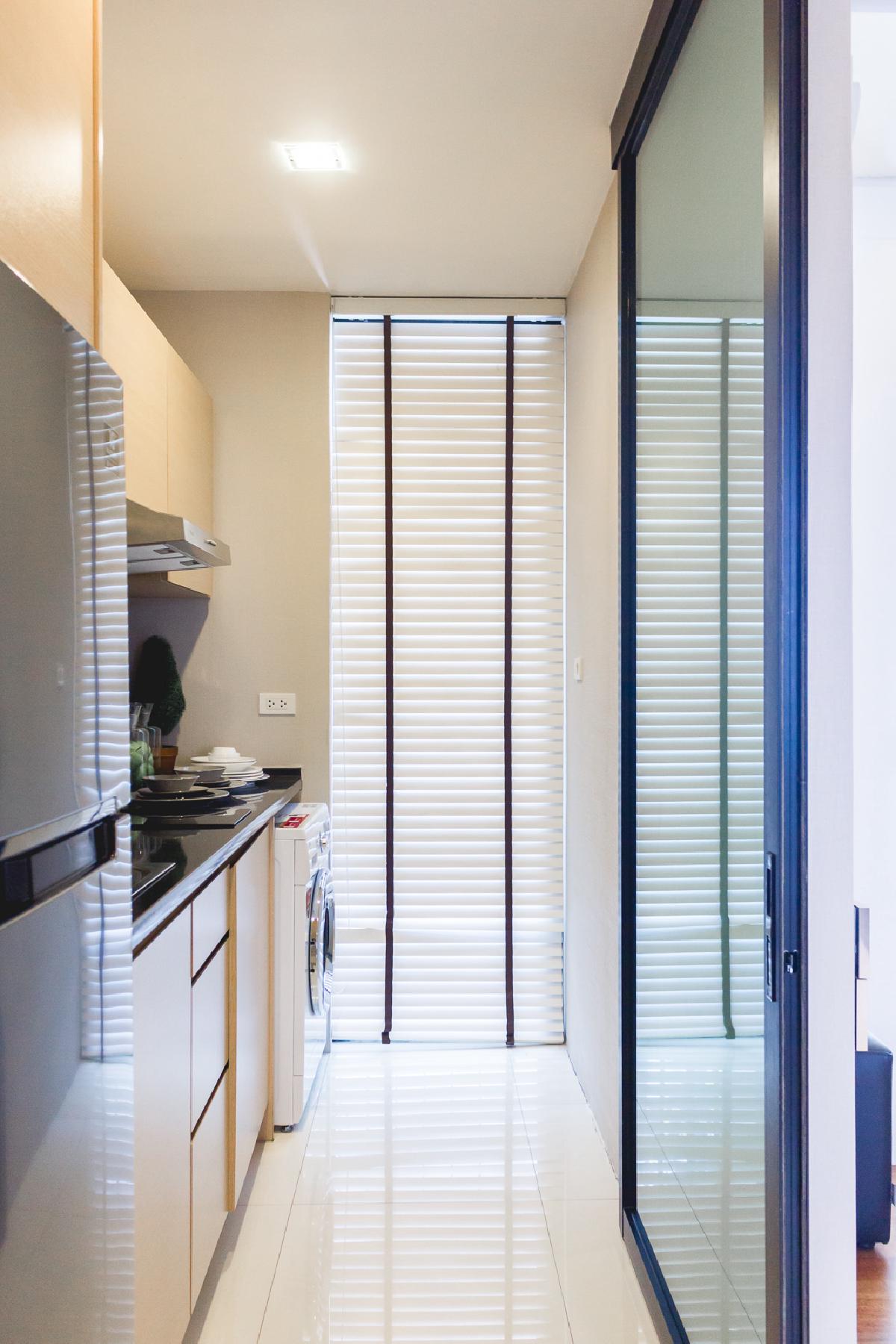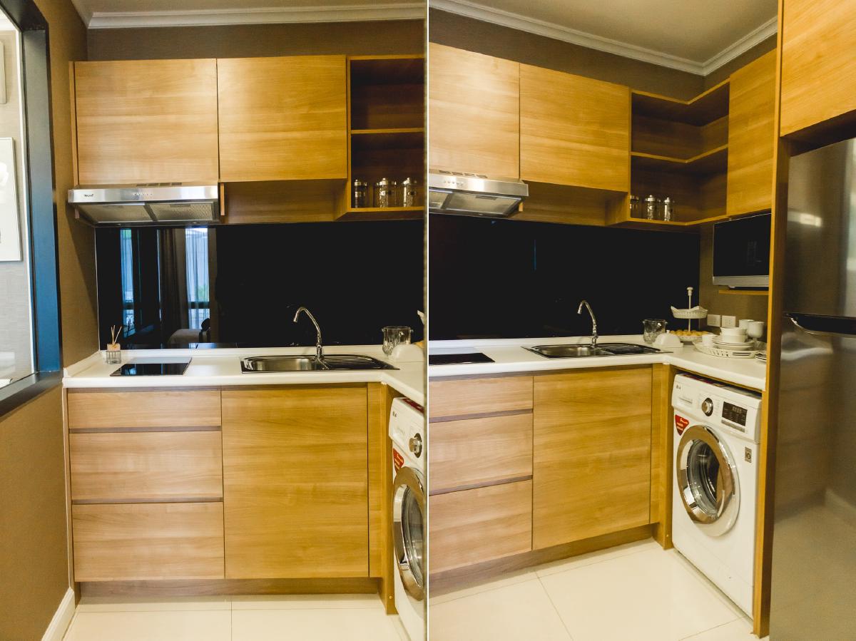 ขยับไปยังฟังก์ชั่นการใช้งานอย่าง ห้องครัวและห้องน้ำ ก็มีการแยกออกจากพื้นที่พักผ่อนชัดเจนกั้นด้วยแพลทติชั่นแบบปิด ซึ่งช่วยในเรื่องกลิ่นรบกวนได้เป็นอย่างดี สำหรับอุปกรณ์ครัวและสุขภัณฑ์ห้องน้ำจะติดตั้งมาให้ค่อนข้างครบพร้อมกับเฟอร์นิเจอร์ Built-in ของทางโครงการ ในรูปแบบ Fully Furnished