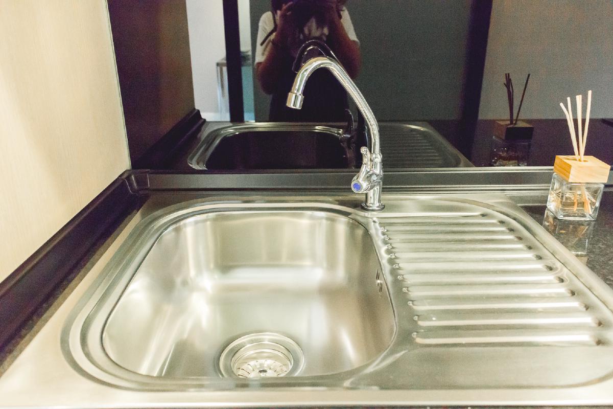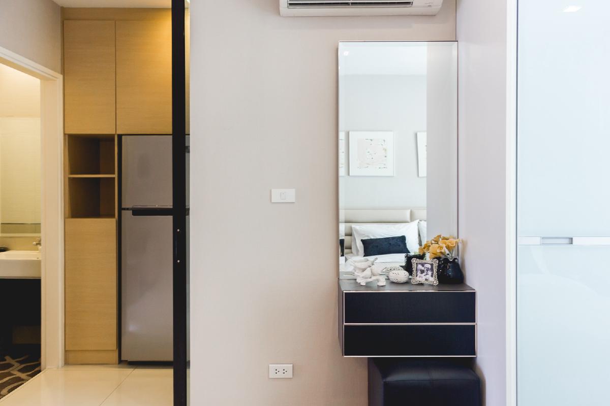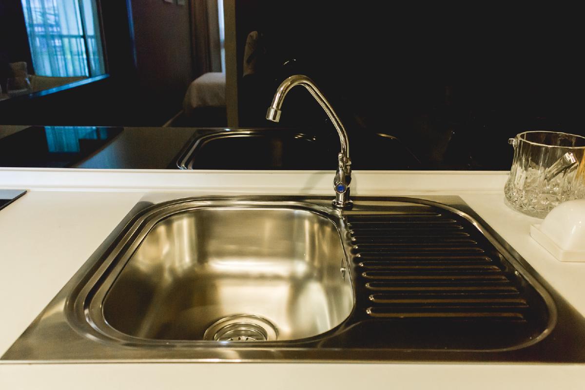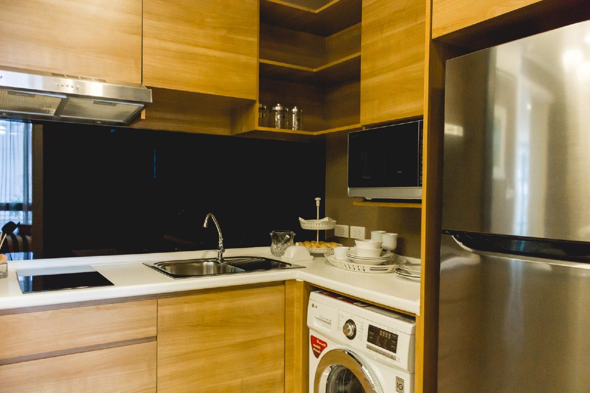 ขยับไปยังฟังก์ชั่นการใช้งานอย่าง ห้องครัวและห้องน้ำ ก็มีการแยกออกจากพื้นที่พักผ่อนชัดเจนกั้นด้วยแพลทติชั่นแบบปิด ซึ่งช่วยในเรื่องกลิ่นรบกวนได้เป็นอย่างดี สำหรับอุปกรณ์ครัวและสุขภัณฑ์ห้องน้ำจะติดตั้งมาให้ค่อนข้างครบพร้อมกับเฟอร์นิเจอร์ Built-in ของทางโครงการ ในรูปแบบ Fully Furnished