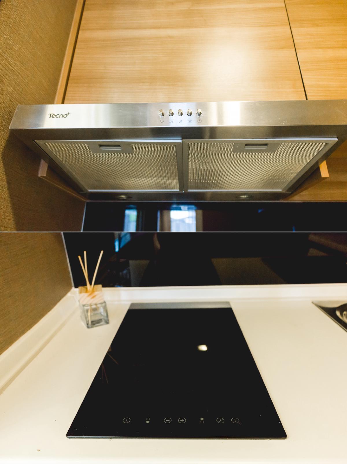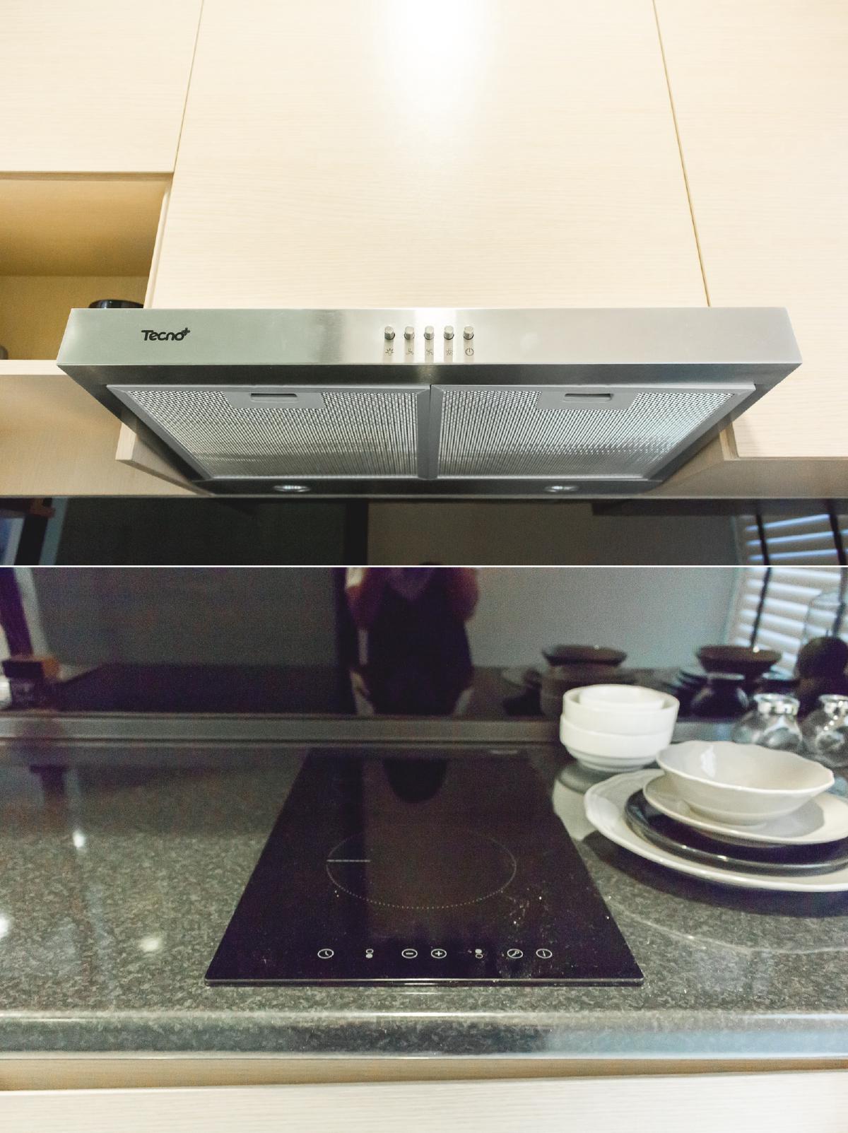เตาไฟฟ้าขนาด 2 หัวและเครื่องดูดควันระบบไส้กรองของ Tecno เช่นกัน ซึ่งเพียงพอต่อการทำอาหารมื้อเล็กๆ ไม่หนักมาก