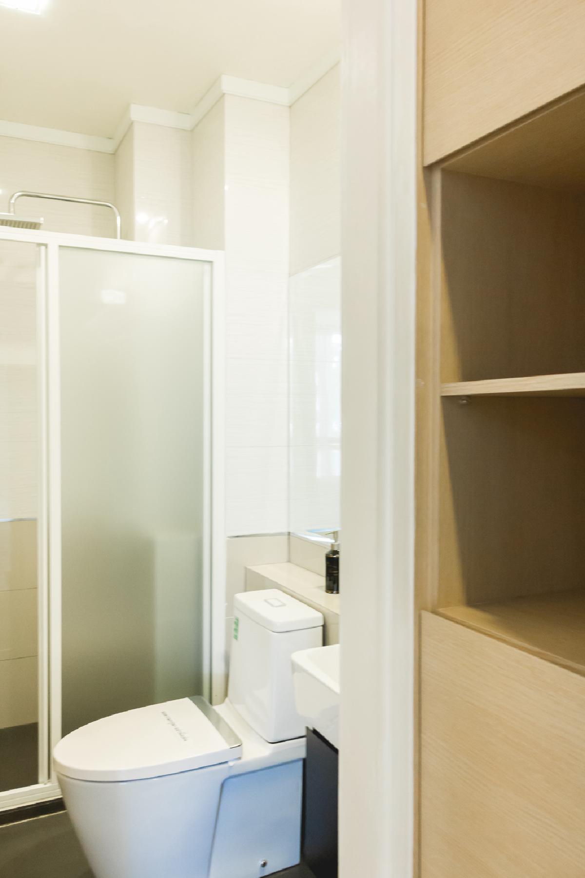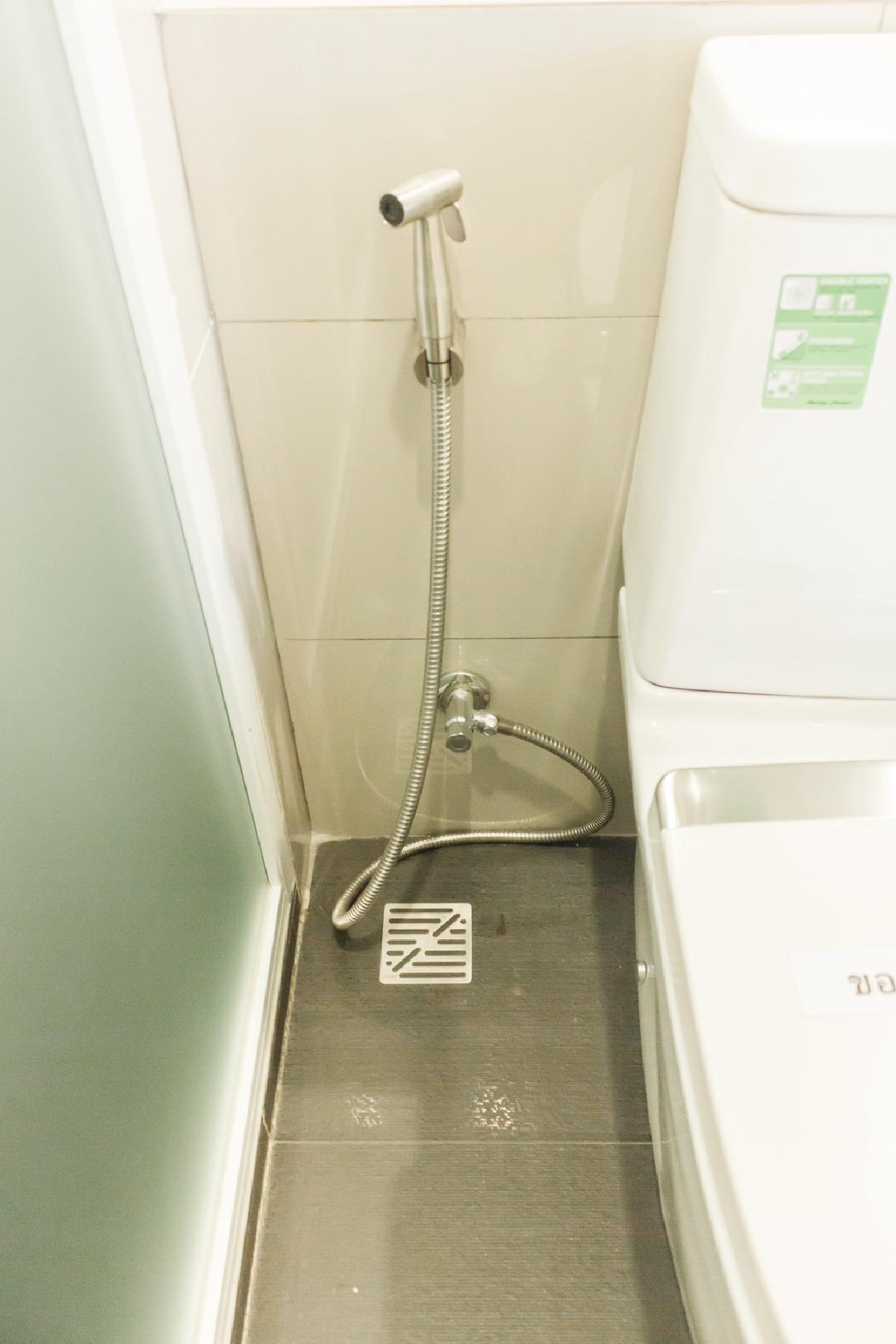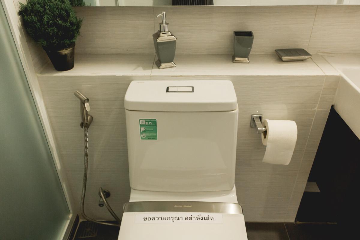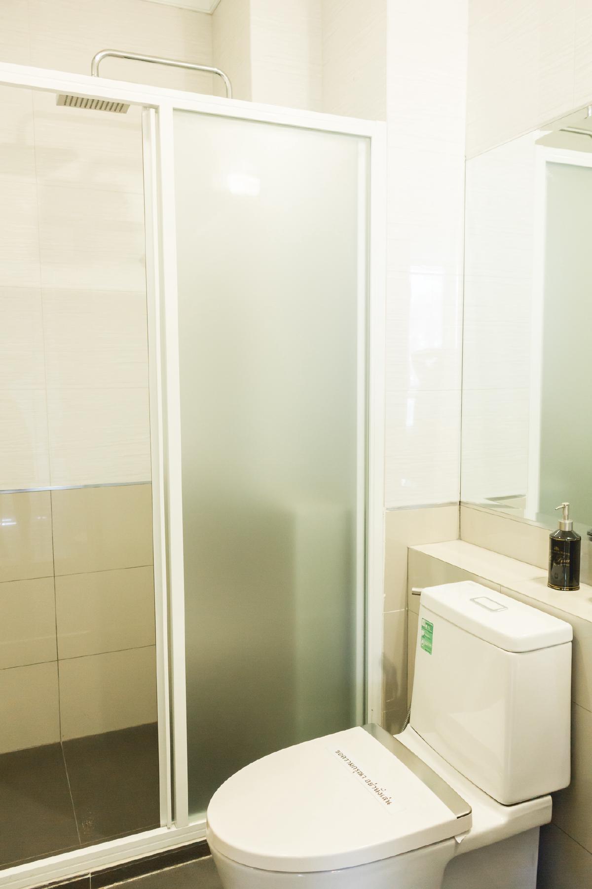 ห้องน้ำขนาดพอเหมาะต่อการใช้งานหนึ่งคน คือ แยกโซนแห้งและเปียกชัดเจน พร้อมที่วางของอีกเล็กน้อย ถ้าอยู่กัน 2 คน อาจหาชั้นวางของมาตั้งเพิ่ม ส่วนสุขภัณฑ์ทางคอนโดเลือกใช้ของ American Standard