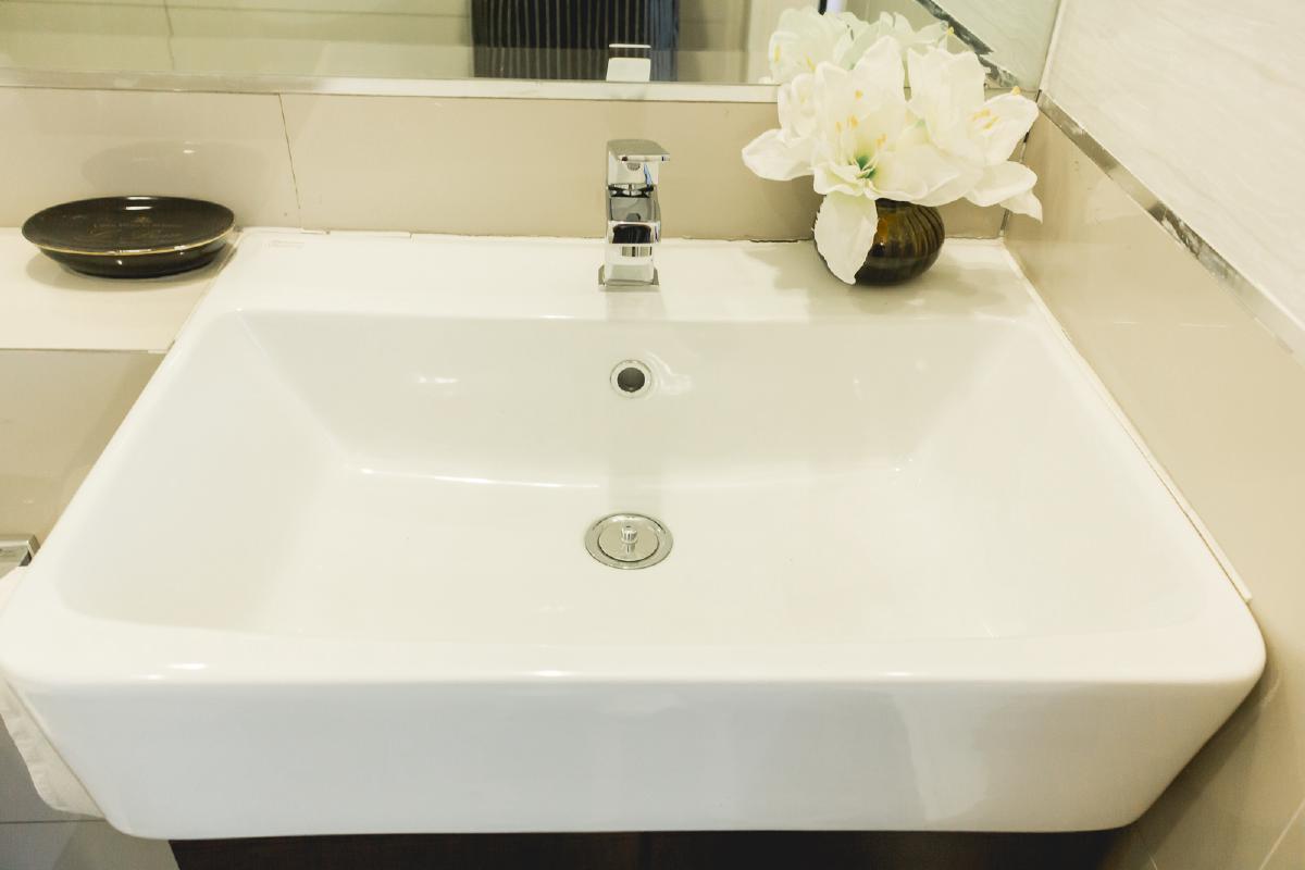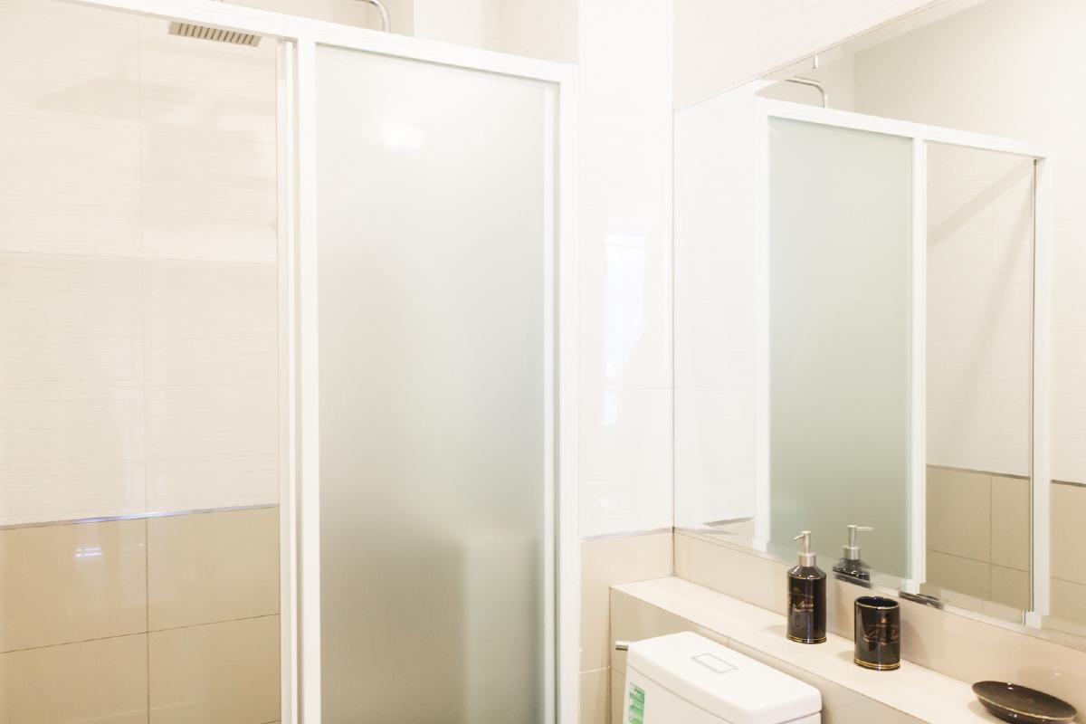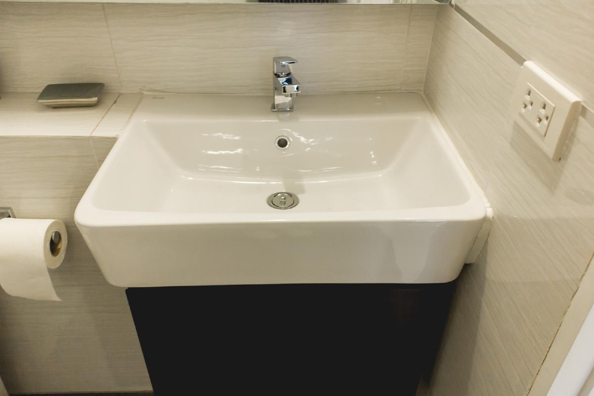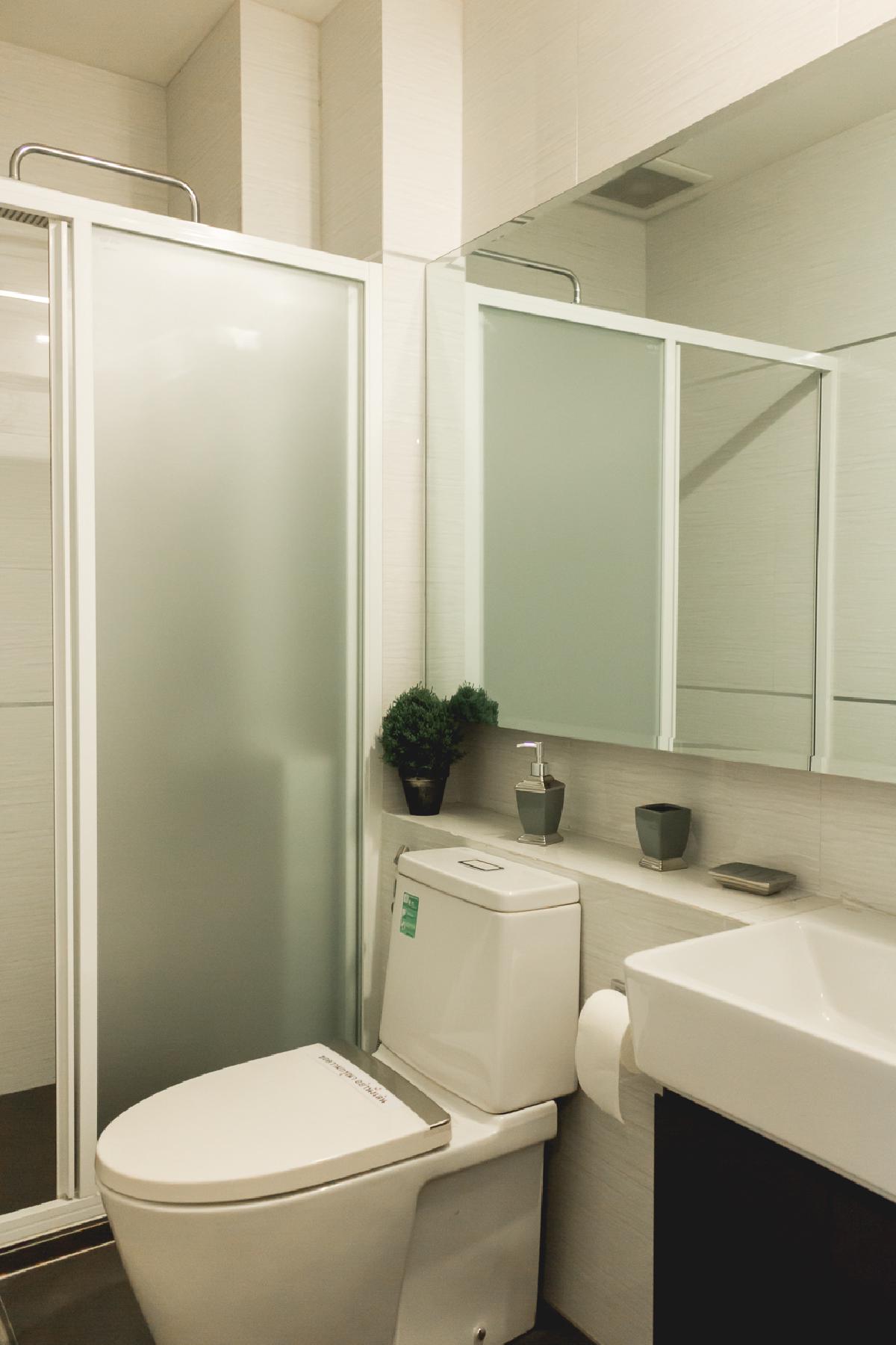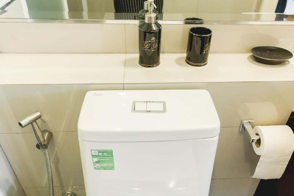 ห้องน้ำขนาดพอเหมาะต่อการใช้งานหนึ่งคน คือ แยกโซนแห้งและเปียกชัดเจน พร้อมที่วางของอีกเล็กน้อย ถ้าอยู่กัน 2 คน อาจหาชั้นวางของมาตั้งเพิ่ม ส่วนสุขภัณฑ์ทางคอนโดเลือกใช้ของ American Standard