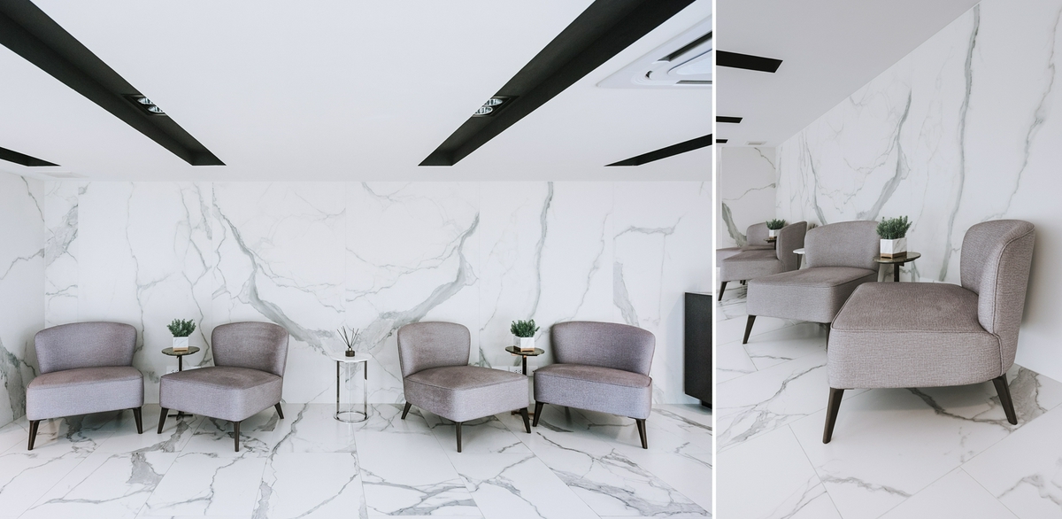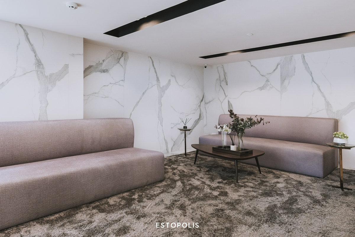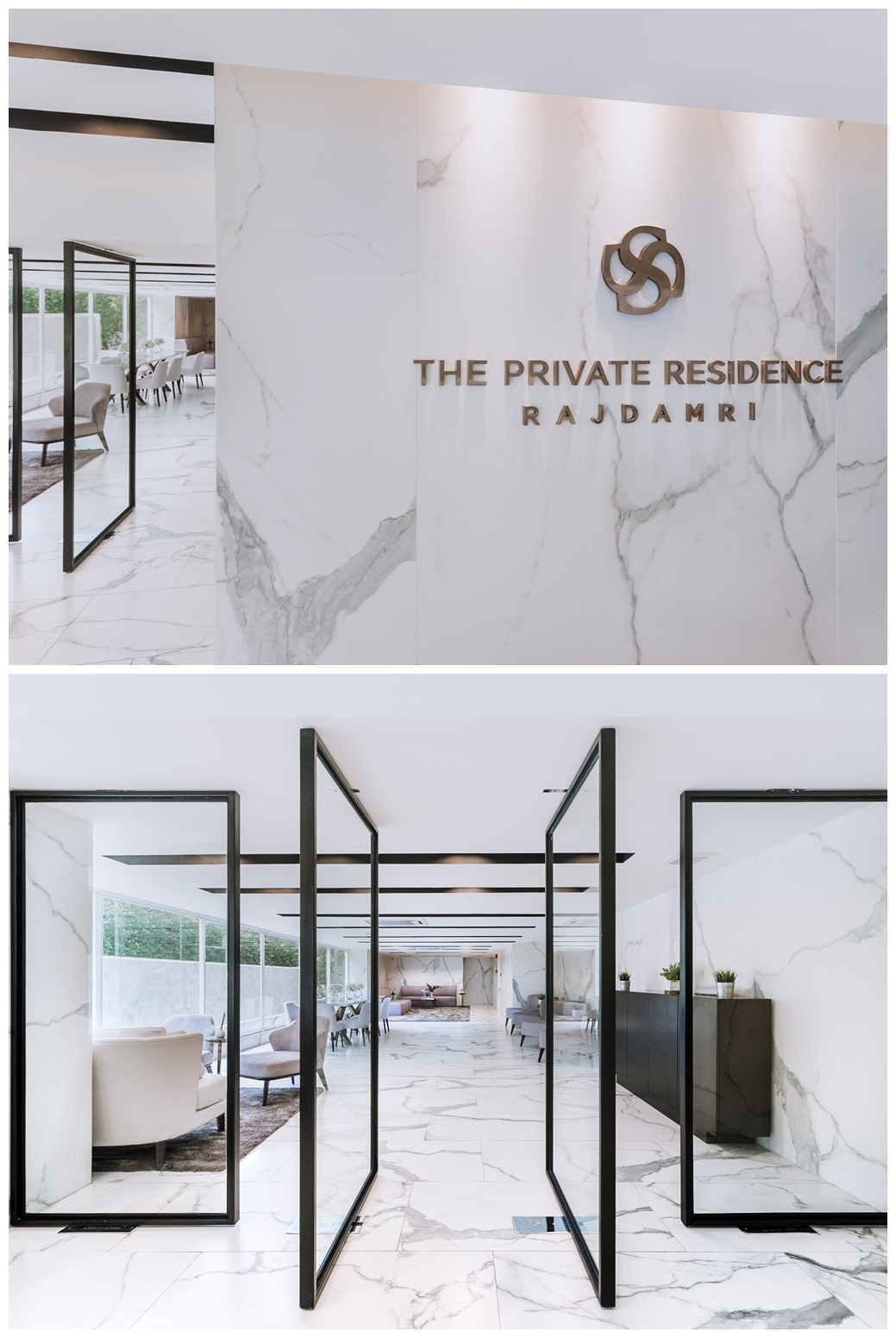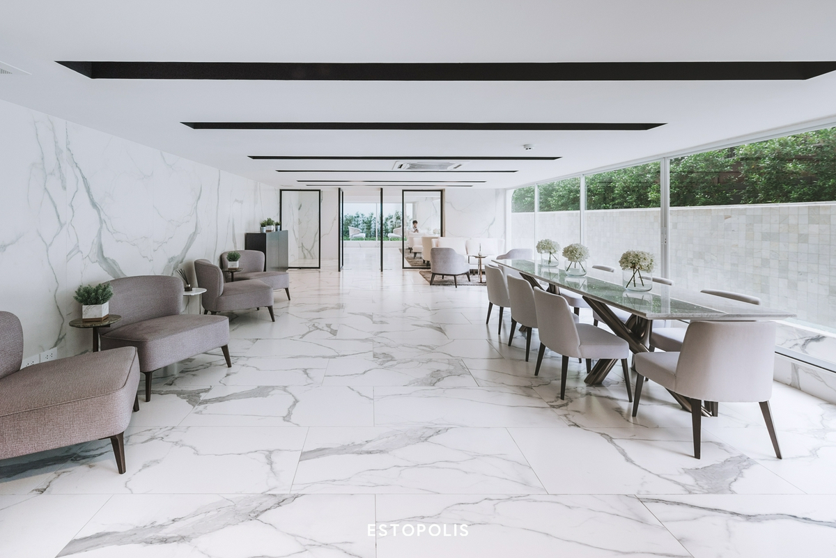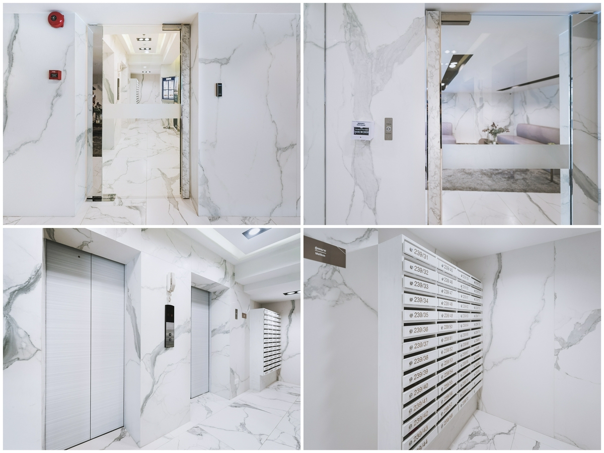 เมื่อเข้ามายังด้านในโครงการจะเจอประตูทางเข้า Lobby อยู่ทางขวามือ เสมือนเป็นจุดรับรอง คอยดูแล และให้เรารู้สึกผ่อนคลายไปพร้อม ๆ กัน ด้วยการตกแต่งที่ใช้หินอ่อนสีขาวมาสร้างจุดเด่น ยิ่งสะท้อนล้อกับแสงธรรมชาติจากผนังกระจกใส ยิ่งช่วยให้บริเวณนี้โปร่งโล่ง สบายตา