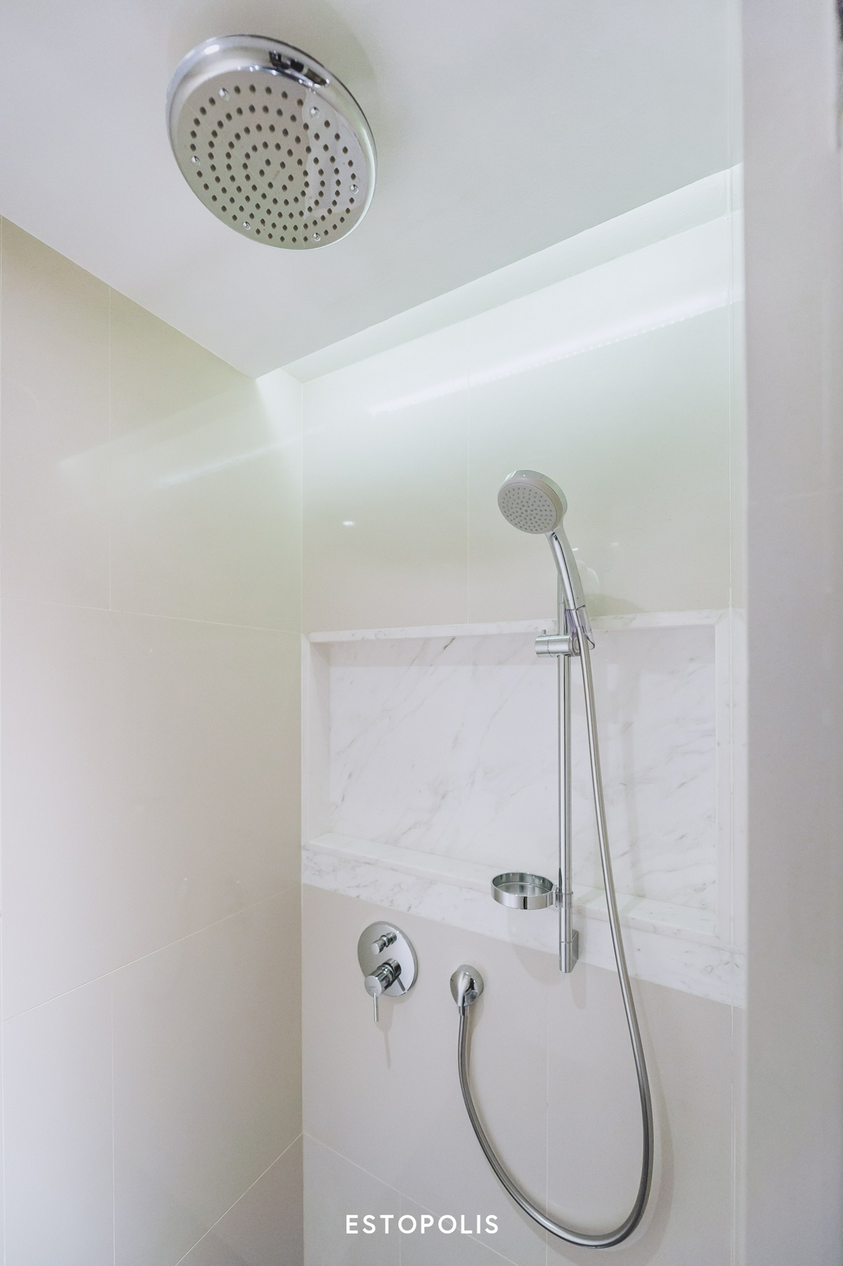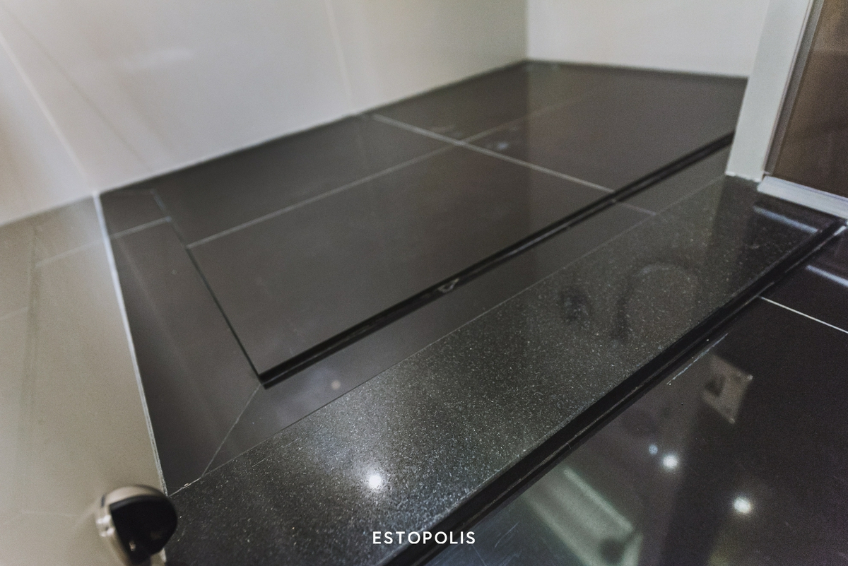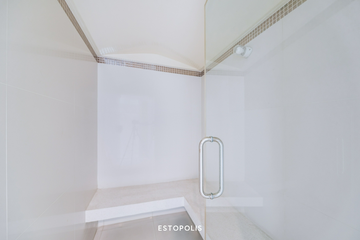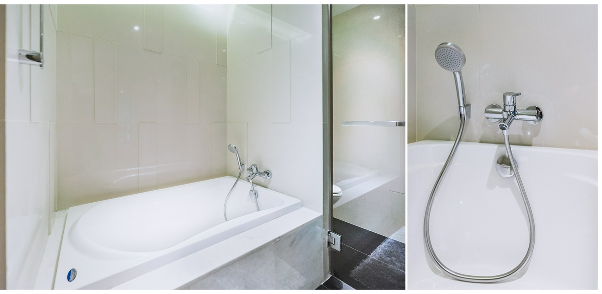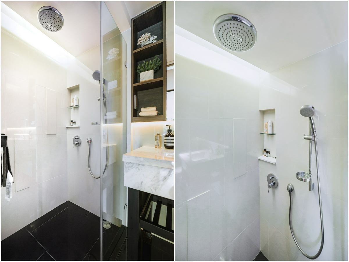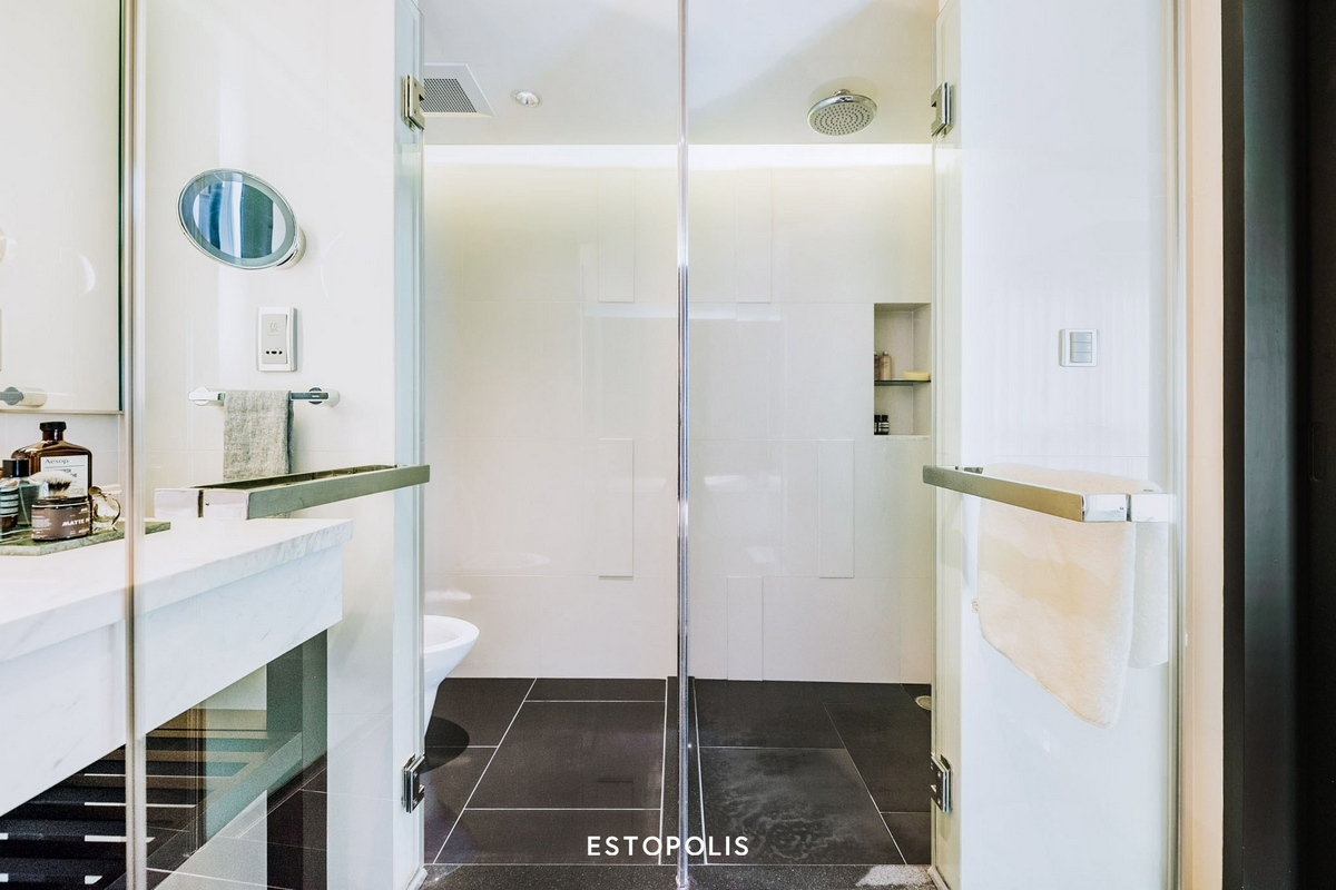 ตรงข้ามกันเป็นห้องอาบน้ำ Shower Box ที่มีประตูกระจกบานสูงกั้นปิด ภายในติดตั้งชุดฝักบัวให้ทั้ง Hand Shower และ Rain Shower ซึ่งทางโครงการ The Private Residence Rajdamri ก็ได้ติดระบบเครื่องทำน้ำอุ่นมาให้เรียบร้อยแล้ว