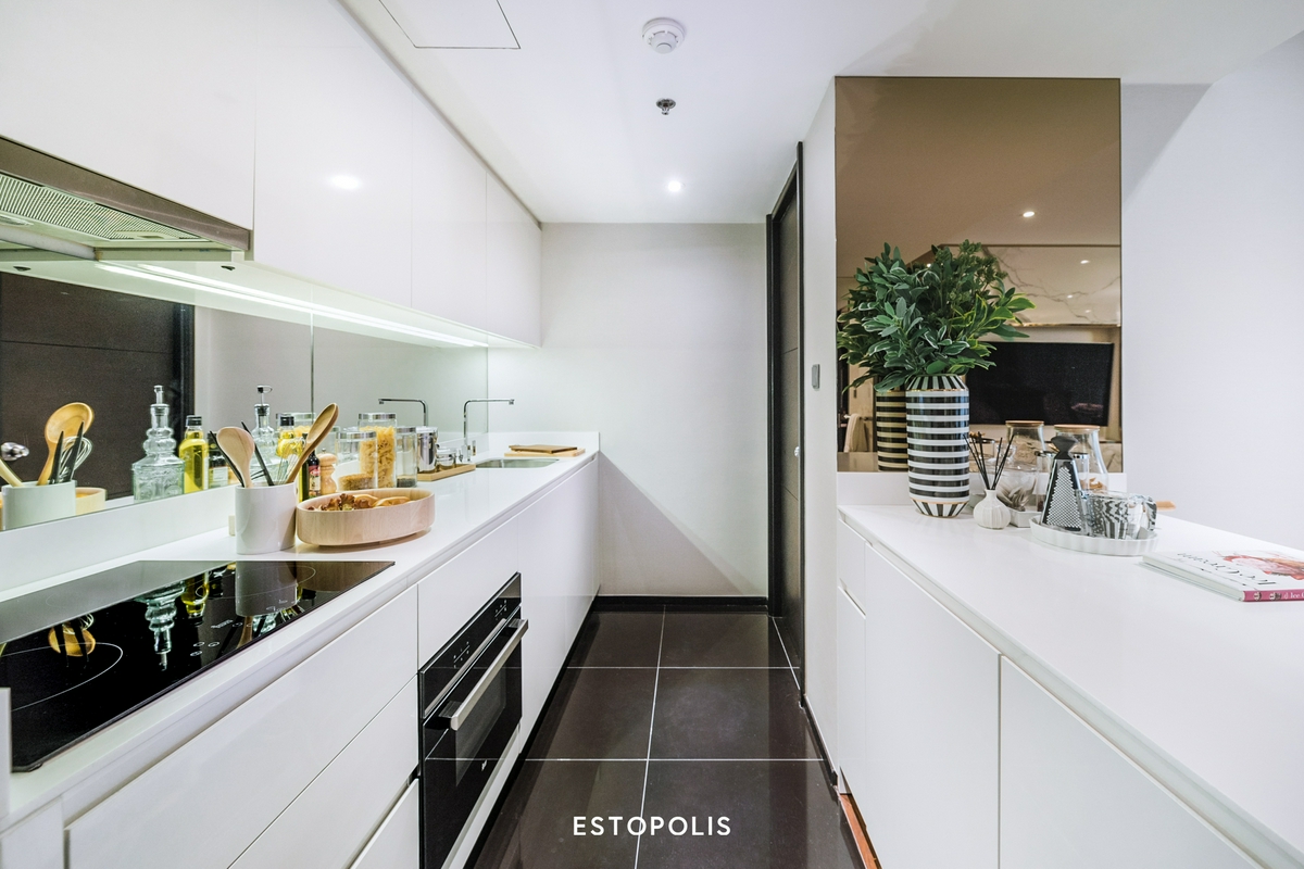 โดยด้านหน้าสุดจะเป็นครัวเปิด ที่มีส่วนของ Pantry Bar เข้ามาช่วยเพิ่มพื้นที่ใช้สอยให้ดูทันสมัยยิ่งขึ้น ก่อนจะเชื่อมต่อไปยัง Living Room, Dinning Zone และระเบียงตามลำดับ ทำให้ทุกพื้นที่ไหลลื่นเชื่อมต่อถึงกันหมด ช่วยให้ห้องดูปลอดโปร่งขึ้น ส่วนอีกฝั่งจะเป็นพื้นที่สุดไพรเวทอย่าง ห้องนอน และห้องน้ำที่ให้เราใช้งานสะดวกด้วยประตูทางเข้าแบบ 2 ทาง