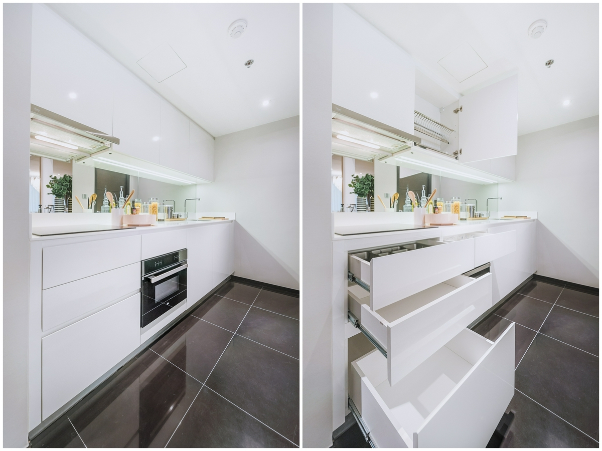 - สำหรับใครที่เข้าครัวเป็นประจำ ก็สามารถติด Backsplash ไว้ด้านหลังเช่นเดียวกับห้องตัวอย่างได้ จะช่วยให้เราเช็ดล้าง ทำความสะอาดง่ายขึ้น