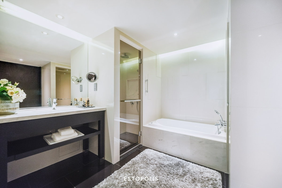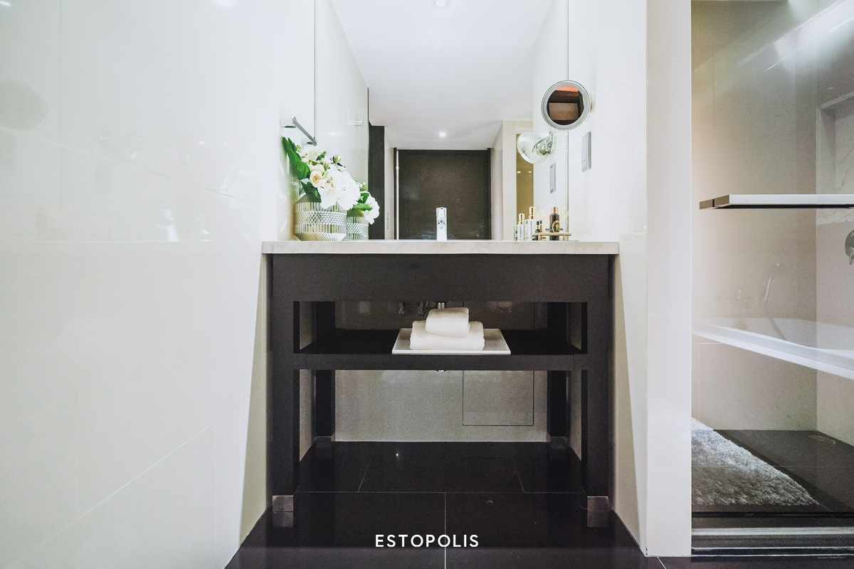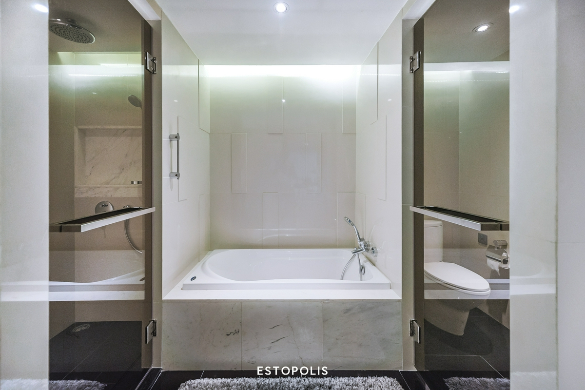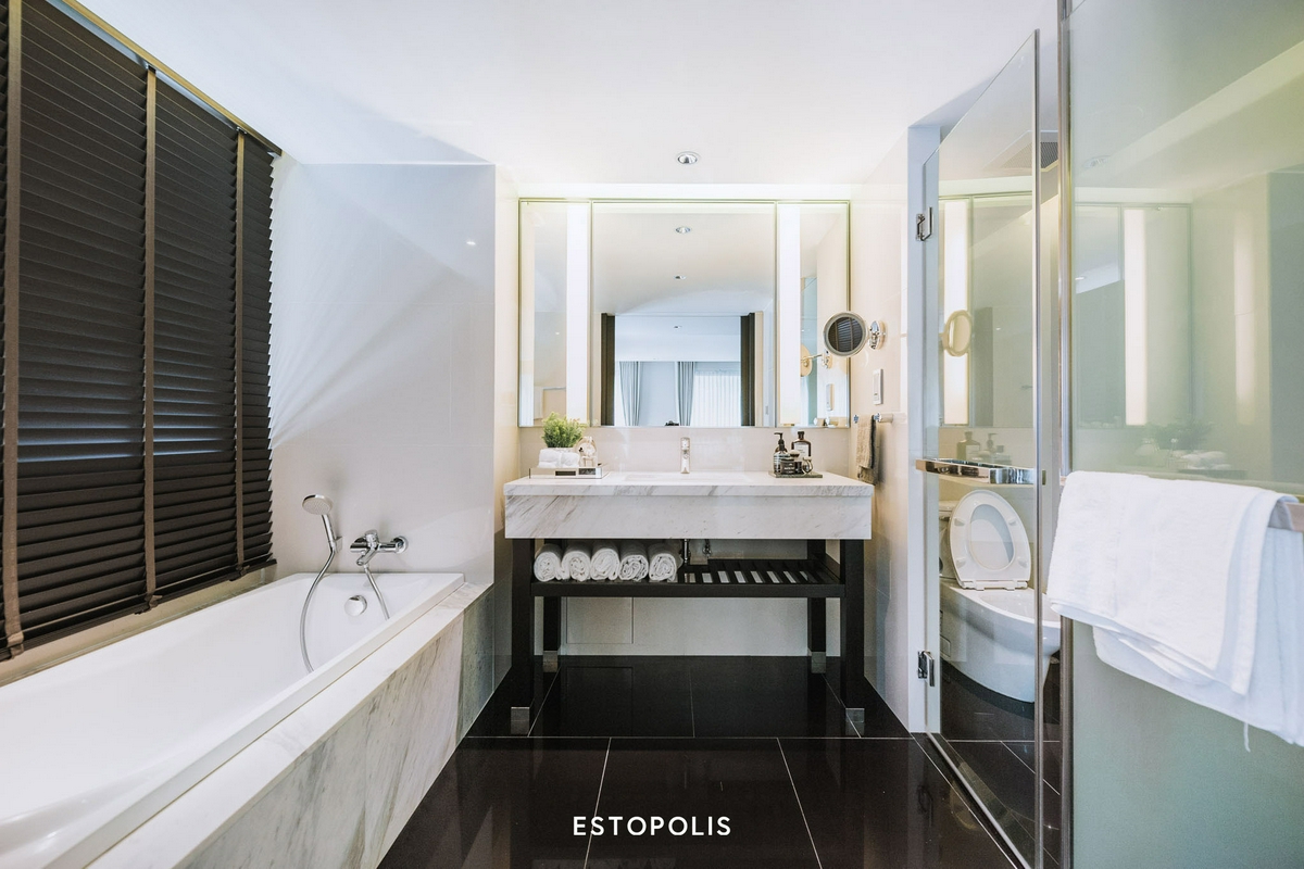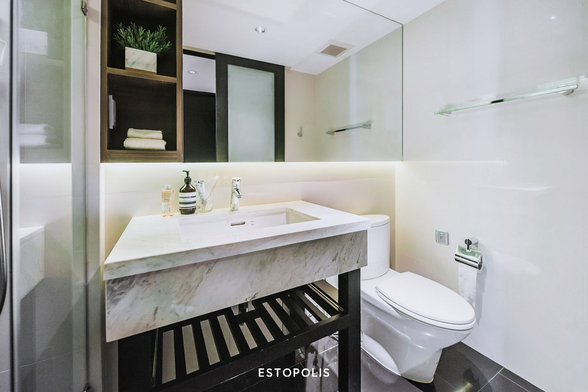 ‘ห้องน้ำรับรอง’ จะเป็นห้องแรกที่เราจะได้เจอ ภายในตกแต่งหรูหรา และครบครันด้วยชุดสุขภัณฑ์จากแบรนด์ TOTO ทั้งอ่างล้างหน้า, โถสุขภัณฑ์ และห้องอาบน้ำ พร้อมแยกโซนเปียกด้วยประตูกระจกเช่นเดียวกับห้อง 1 Bedroom เพียงแต่ห้องนี้จะไม่มีอ่างอาบน้ำมาด้วยเท่านั้น