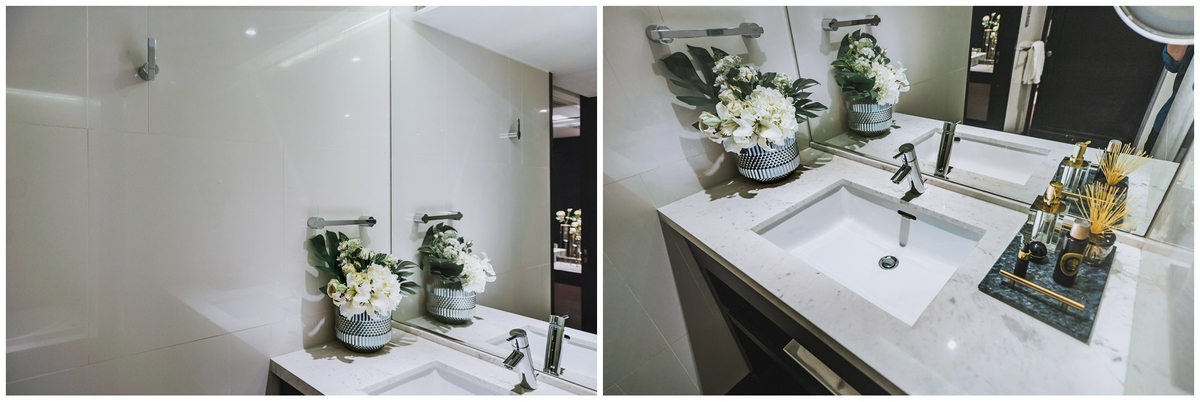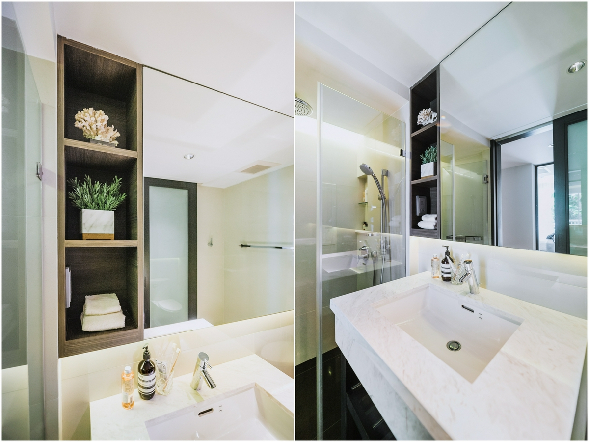 พื้นที่อ่างล้างหน้ากว้างขวาง บิลต์อินอยู่ติดกับผนังด้านในสุด เราจึงมีเนื้อที่ให้วางเจลล้างมือ, สบู่เหลว, เครื่องหอม หรือขวดผลิตภัณฑ์ต่าง ๆ เหมาะสำหรับผู้ที่ชอบดูแลตัวเองทุกคน