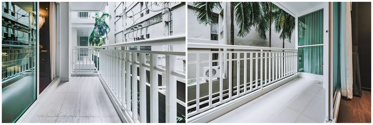 ระเบียงส่วนตัวจะมีลักษณะคล้ายระเบียงด้านนอก พื้นปูกระเบื้องพร้อมติดตั้งก็อกน้ำให้เรียบร้อย ส่วนราวกันตกสูง 1 เมตร สามารถแขวนกระถาง จัดเป็นสวนแนวตั้งได้อีกด้วย