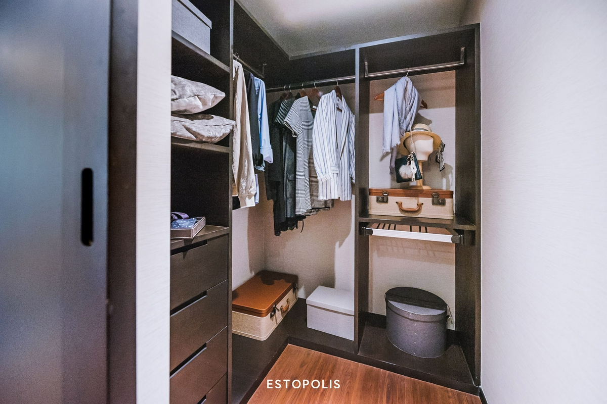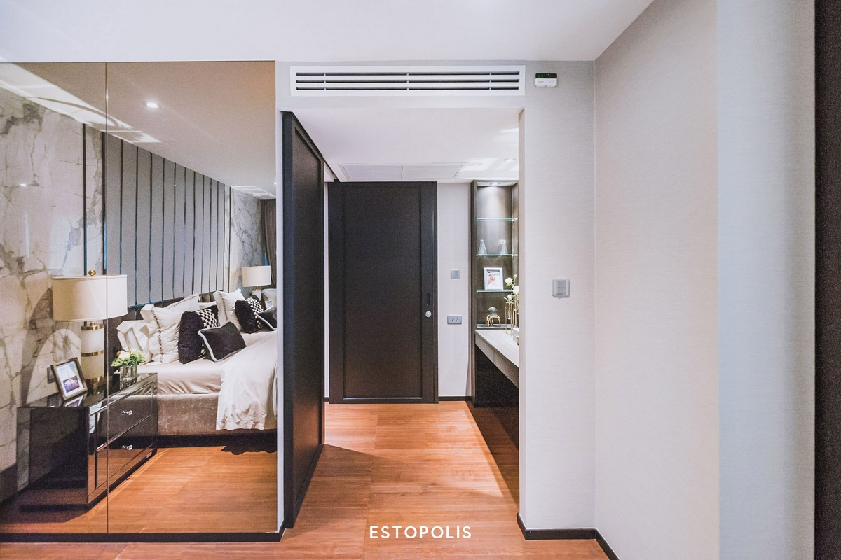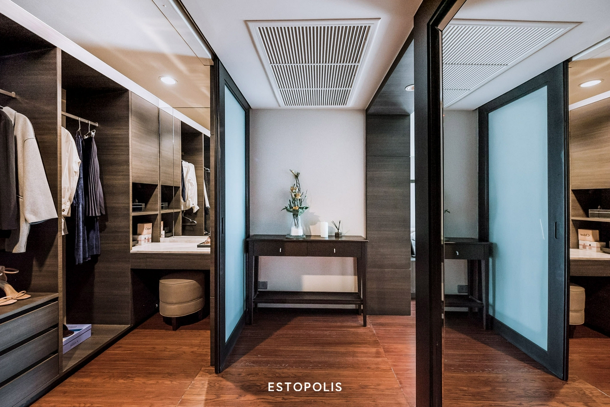 โดยส่วนแรกจะเป็น Walk-in closet ที่ซ่อนอยู่หลังพาร์ติชันบานเลื่อน ทำหน้าที่เป็นเหมือนด่านแรก และด่านสุดท้ายให้เราผลัดเปลี่ยนเสื้อผ้า พร้อมเช็คความเรียบร้อยก่อนเข้าหรือออกห้อง ซึ่งทางโครงการ The Private Residence Rajdamri ก็จะบิลท์อินใส่ฟังก์ชันให้เช่นเดียวกับห้อง 1 Bedroom ครบทั้งราวแขวนเสื้อ-กางเกง, ชั้นวางของ, ลิ้นชัก และช่องใส่เครื่องประดับ