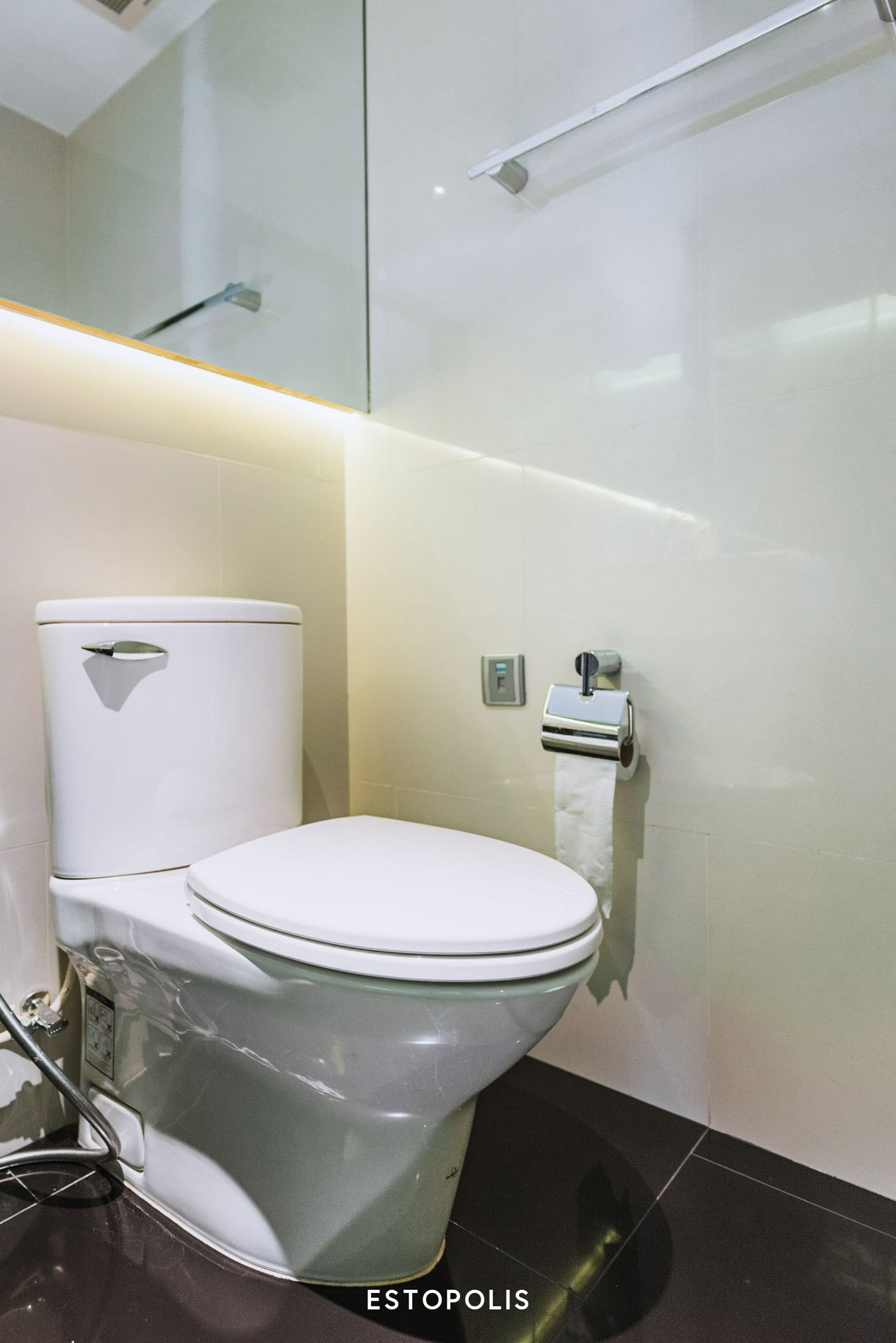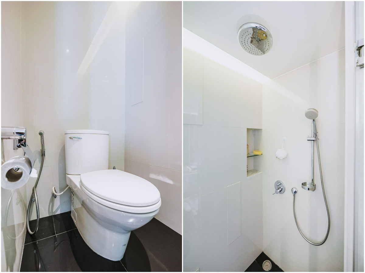 ขวามือจะเป็นโถสุขภัณฑ์ที่ให้เรานั่งทำธุระได้สบายตัว มีสายฉีดชำระ และแท่นแขวนกระดาษทิชชู่อยู่ข้าง ๆ ส่วนด้านบนจะเป็นราวสำหรับแขวนผ้าขนหนู