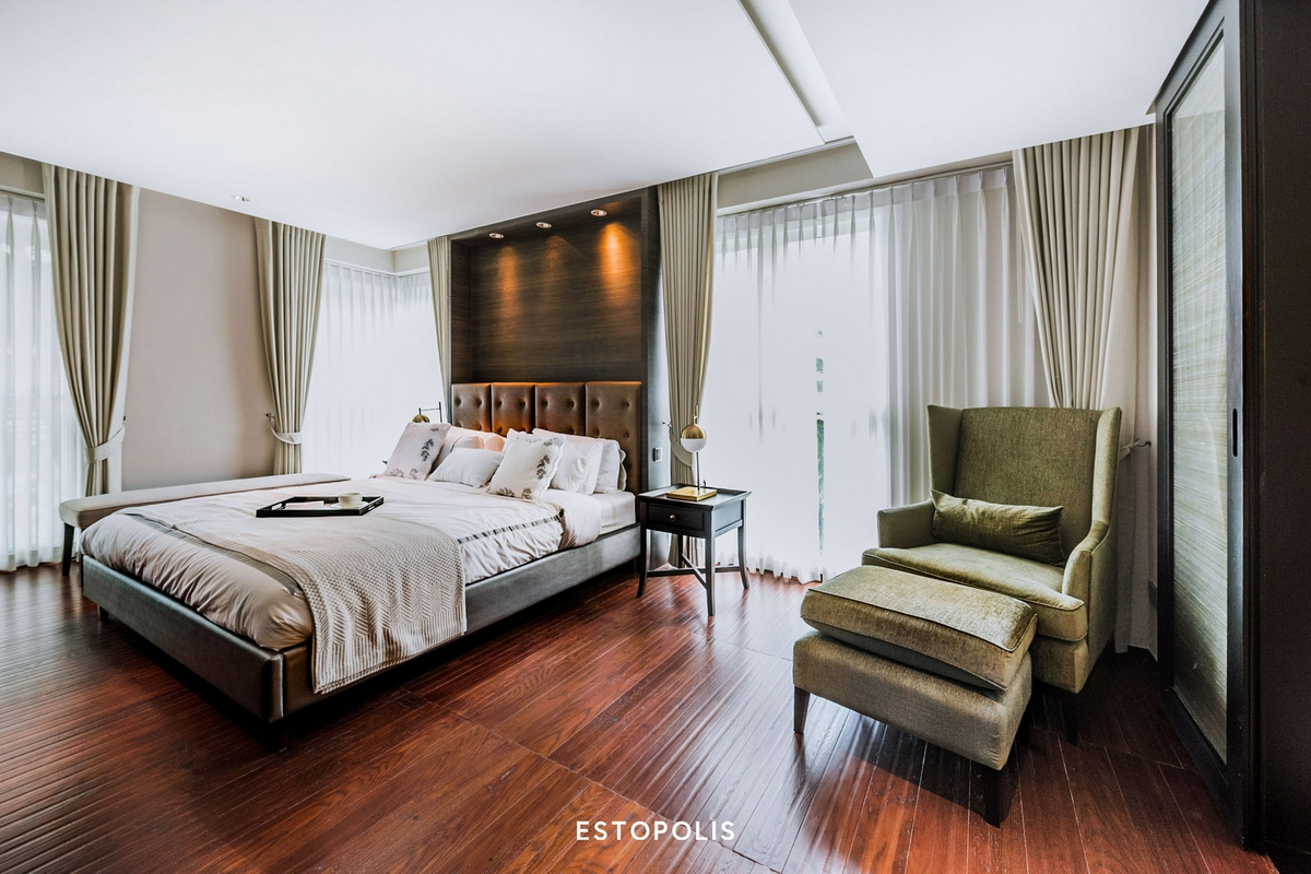 แต่งตัวเสร็จแล้วก็ออกมาพักผ่อนกันให้เพลิดเพลิน บนพื้นที่ห้องนอนที่กว้างขวางเป็นอย่างมาก แม้จะวางเตียงขนาด King Size คู่กับโซฟาก็ยังดูปลอดโปร่ง แถมยังเหลือพื้นที่ให้เดิน และใช้ชีวิตได้อย่างลื่นไหล ไม่มีสะดุด พื้นปู Engineering Wood เช่นเดียวกับห้องนั่งเล่น พร้อมติดตั้งเครื่องปรับอากาศแบบฝังฝ้าให้อีก 1 ตัว