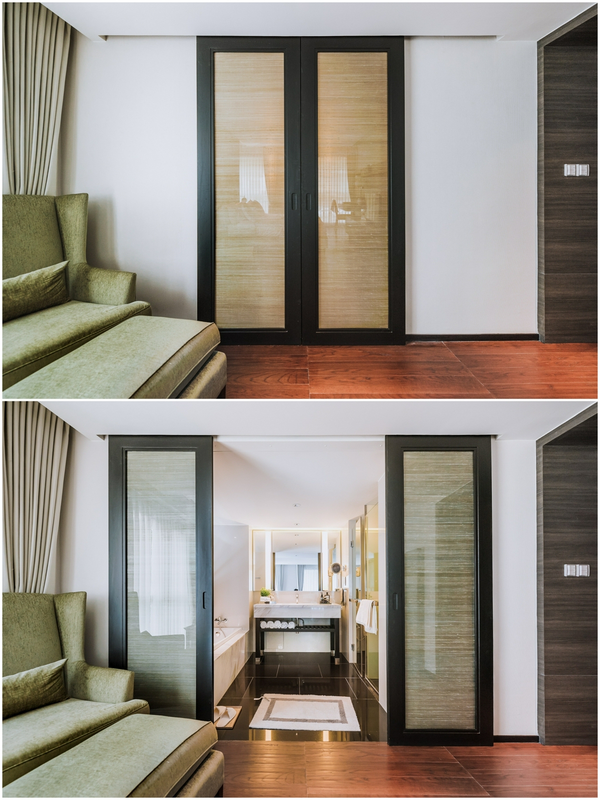 ขยับไปด้านในสุดจะเป็น ‘ห้องน้ำในตัว’ ที่ปิดด้วยประตูบานเลื่อนคล้ายห้องน้ำรับรองด้านนอก ซึ่งจะให้ทั้งความสวยงาม และช่วยประหยัดพื้นที่ห้องได้เป็นดี