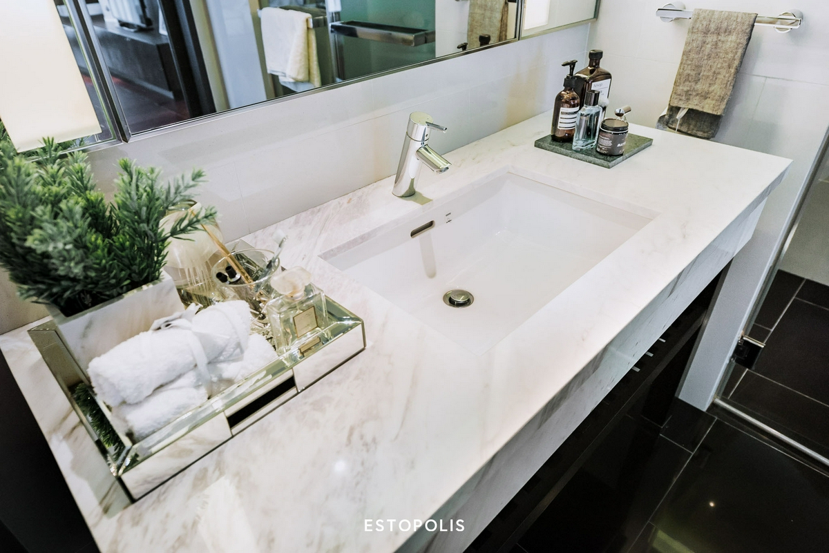 อ่างล้างหน้ายังคงความหรูหราของลวดลายหินอ่อนไว้เป็นอย่างดี มีพื้นที่หน้าอ่าง พร้อมเคาน์เตอร์ด้านล่างให้วางของใช้, ผลิตภัณฑ์ทำสะอาดผิว และผ้าขนหนูสำรองได้เยอะ หรือถ้าใครต้องการวางถังขยะเพิ่มก็สามารถนำมาวางไว้ใต้เคาน์เตอร์อ่างได้เลย แถมเวลาทำความสะอาดก็สะดวก ดูแลรักษาง่าย