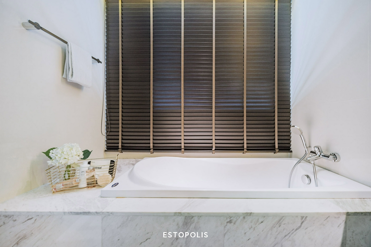 ภายในออกแบบ ตกแต่งเหมือนกับห้องน้ำของห้อง 1 Bedroom มีอ่างล้างหน้า, โถสุขภัณฑ์, ห้องอาบน้ำ และอ่างอาบน้ำให้ โดยแต่ละส่วนจะกั้นปิดด้วยประตูกระจก เพื่อความสะดวกสบาย และมีขนาดพื้นที่ใหญ่ขึ้นตามขนาดห้อง