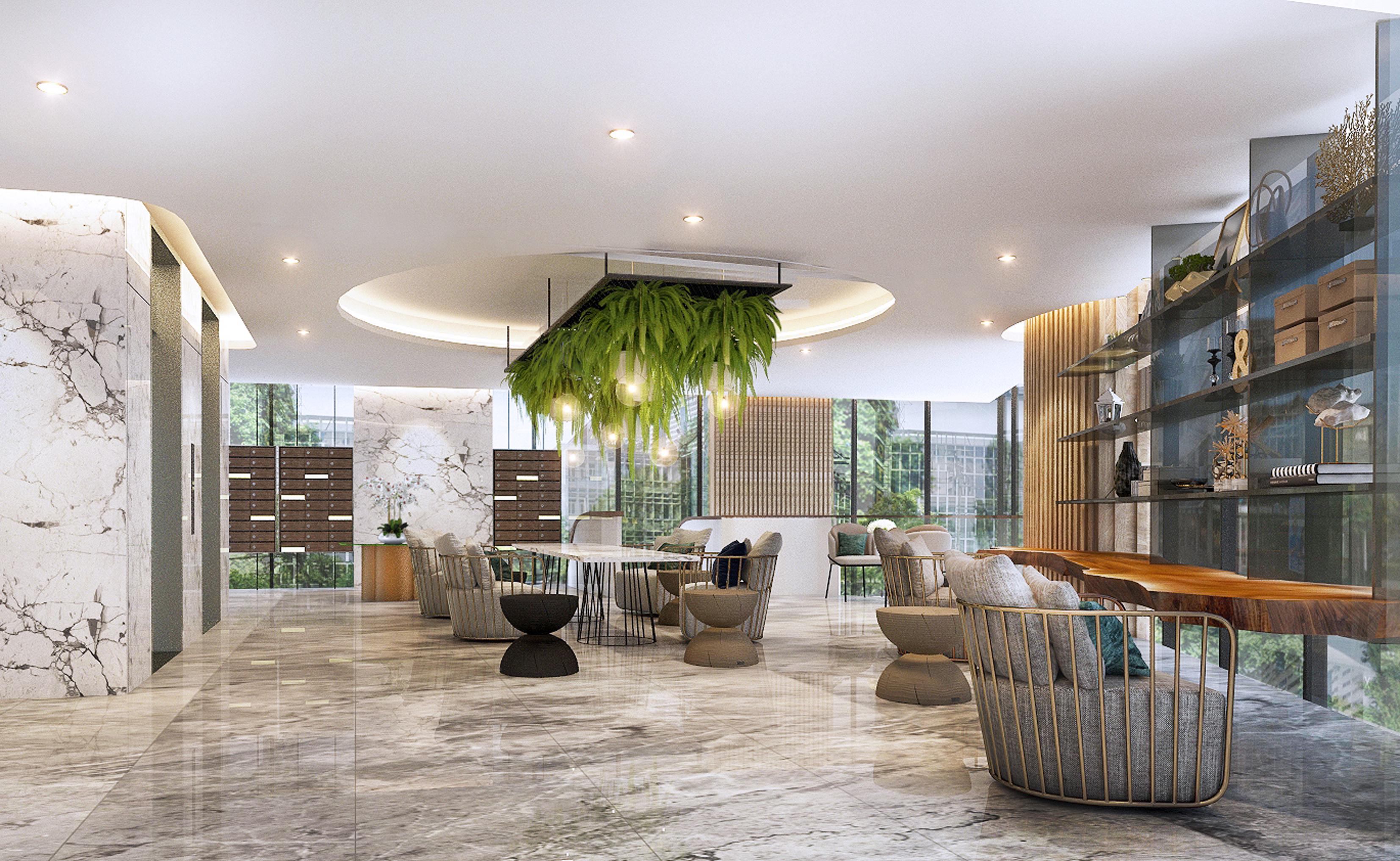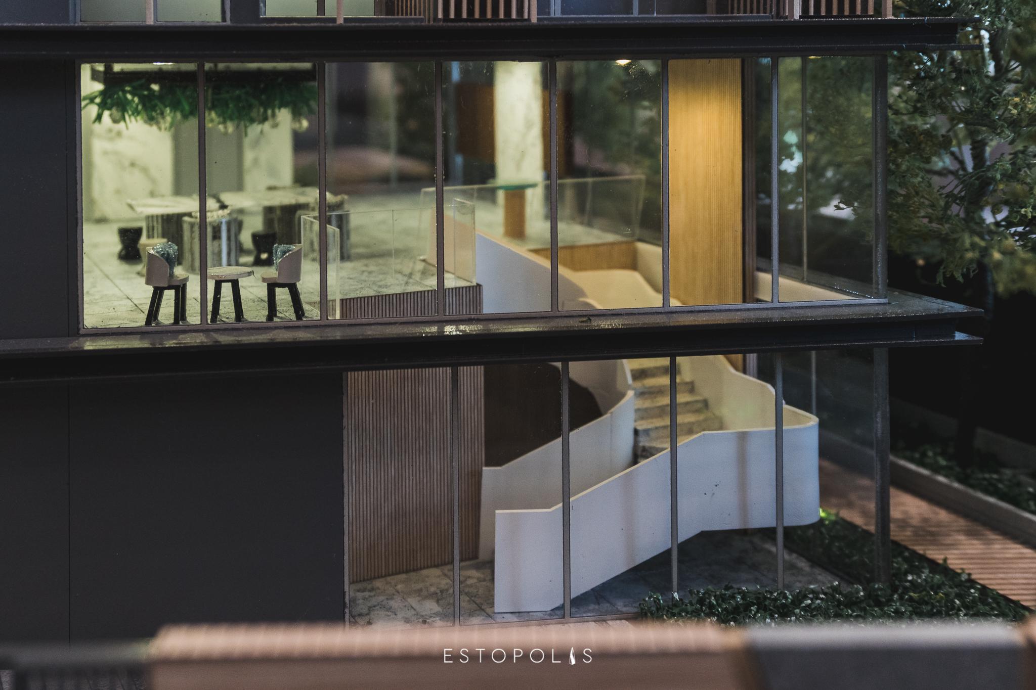 ต้อนรับเข้าสู่ภายในอาคารด้วย Double Volume Lobby โถงล็อบบี้ที่มีบันไดวนขึ้นสู่ชั้น 2 พร้อมจัดวางพื้นที่รับแขกควบคู่ไปกับพื้นที่นั่งทำงานได้อย่างลงตัว